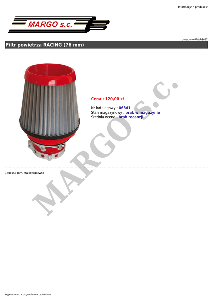 Informacje o produkcie Utworzono 07-03-2017 s. c . Filtr powietrza RACING (76 mm) Cena : 120,00 zł M AR G O Nr katalogowy : 06841 Stan magazynowy : brak w magazynie Średnia ocena : brak recenzji 150x156 mm, stal nierdzewna Wygenerowano w programie www.oscGold.com