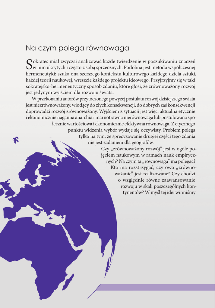 Na czym polega równowaga S okrates miał zwyczaj analizować każde twierdzenie w poszukiwaniu znaczeń w nim ukrytych i często z sobą sprzecznych. Podobna jest metoda współczesnej hermeneutyki: szuka ona szerszego kontekstu kulturowego każdego dzieła sztuki, każdej teorii naukowej, wreszcie każdego projektu ideowego. Przyjrzyjmy się w taki sokratejsko‑hermeneutyczny sposób zdaniu, które głosi, że zrównoważony rozwój jest jedynym wyjściem dla rozwoju świata. W przekonaniu autorów przytoczonego powyżej postulatu rozwój dzisiejszego świata jest niezrównoważony, wiodący do złych konsekwencji, do dobrych zaś konsekwencji doprowadzi rozwój zrównoważony. Wyjściem z sytuacji jest więc: aktualna etycznie i ekonomicznie naganna anarchia i marnotrawna nierównowaga lub postulowana społecznie wartościowa i ekonomicznie efektywna równowaga. Z etycznego punktu widzenia wybór wydaje się oczywisty. Problem polega tylko na tym, że sprecyzowanie drugiej części tego zdania nie jest zadaniem dla geografów. Czy „zrównoważony rozwój” jest w ogóle pojęciem naukowym w ramach nauk empirycznych? Na czym ta „równowaga” ma polegać? Kto ma rozstrzygać, czy owo „zrównoważanie” jest realizowane? Czy chodzi o względnie równe zaawansowanie rozwoju w skali poszczególnych kontynentów? W myśl tej idei winniśmy np. przeciwdziałać niedorozwojowi Afryki. A może chodzi o równowagę zasobów pozostających do dyspozycji pewnych grup rasowo‑narodowych. W tym rozumieniu Europejczycy, (północni) Amerykanie i niektórzy Azjaci są zbyt uprzywilejowani. A może chodzi o likwidację dysproporcji między dobrobytem, stanem zdrowotnym, dostępem do oświaty różnych warstw społecznych w ramach danych społeczeństw lub o wyrównywanie szans między mieszkańcami wsi i miast albo różnych dzielnic miast („dobre adresy” i slumsy)? Oderwijmy się od socjologiczno‑ekonomicznego widzenia zagadnienia równowagi. Może chodzi o powstrzymanie industrializacji i powrót do gospodarki bardziej agrarnej albo o ochronę tradycyjnych sposobów życia przed procesami globalizacyjnymi niwelującymi regionalne odrębności? Te wszystkie pytania może zadać współczesny Sokrates o hermeneutycznym zacięciu, żądając sprecyzowania pojęcia „zrównoważonego rozwoju”. Póki go nie sprecyzujemy, nasz wybór jest ograniczony. Wiemy, jaki jest nasz świat, ale nie wiemy, co ma się znajdować po drugiej stronie spójnika „lub”. To my, humaniści, musimy określić, czym jest „zrównoważony rozwój” i przekonać opinię publiczną do jego wdrażania, zanim reprezentanci nauk przyrodniczych i technicznych zaczną pracować nad odkryciami i wynalazkami, a także nad systemami organizacyjnymi, które będą urzeczywistniać postulowane przez nas przejawy tego rozwoju. Geografia (ekonomiczna i demograficzna) dostarczy nam jednak przesłanek do podjęcia prawidłowych decyzji. Jerzy Pilikowski