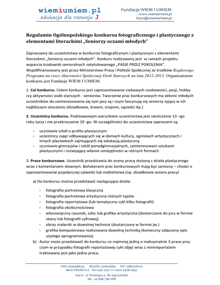 Regulamin Ogólnopolskiego konkursu fotograficznego i plastycznego z elementami literackimi „Seniorzy oczami młodych” Zapraszamy do uczestnictwa w konkursie fotograficznym i plastycznym z elementami literackimi „Seniorzy oczami młodych”. Konkurs realizowany jest w ramach projektu wsparcia środowisk senioralnych zatytułowanego „PASJE PRZEZ POKOLENIA”. Współfinansowany jest przez Ministerstwo Pracy i Polityki Społecznej ze środków Rządowego Programu na rzecz Aktywności Społecznej Osób Starszych na lata 2012-2013. Organizatorem konkursu jest Fundacja WIEM I UMIEM. 1. Cel konkursu. Celem konkursu jest zaprezentowanie ciekawych osobowości, pasji, hobby czy aktywności osób starszych - seniorów. Tworzenie prac konkursowych ma skłonić młodych uczestników do zainteresowania się tym jacy są i czym fascynują się seniorzy żyjący w ich najbliższym otoczeniu (dziadkowie, krewni, znajomi, sąsiedzi itp.) 2. Uczestnicy konkursu. Podstawowym warunkiem uczestnictwa jest ukończenie 13 –go roku życia i nie przekroczenie 19 -go. W szczególności do uczestnictwa zaproszeni są: - uczniowie szkół o profilu plastycznym uczestnicy zajęć odbywających się w domach kultury, ogniskach artystycznych i innych placówkach zajmujących się edukacją plastyczną uczniowie gimnazjów i szkół ponadgimnazjalnych, zainteresowani sztukami plastycznymi i rozwijający własne umiejętności w różnych formach 3. Prace konkursowe. Uczestnik przedstawia do oceny pracę złożoną z dzieła plastycznego wraz z komentarzem słownym. Bohaterami prac konkursowych mają być seniorzy – chodzi o zaprezentowanie pojedynczej sylwetki lub małżeństwa (np. dziadkowie autora pracy) a) Do konkursu można przedstawić następujące dzieła: fotografia portretowa klasyczna fotografia portretowa artystyczna różnych typów fotografia reportażowa (lub tematyczny cykl kilku fotografii) fotografia okolicznościowa własnoręczny rysunek, szkic lub grafika artystyczna (dostarczone do jury w formie skanu lub fotografii cyfrowej) - obraz malarski w dowolnej technice (dostarczony w formie jw.) - grafika komputerowa realizowana dowolną techniką (konieczny załączony opis użytego oprogramowania) b) Autor może przedstawić do konkursu co najmniej jedną a maksymalnie 3 prace przy czym w przypadku fotografii reportażowej cykl zdjęć wraz z minireportażem traktowany jest jako jedna praca. - c) W przypadku przedstawienia więcej niż jednej pracy, dla każdej z nich należy wypełnić osobno oświadczenie autorskie według wzoru umieszczonego na stronie www.wiemiumiem.pl/pokolenia d) UWAGA: Przygotowując dzieło plastyczne należy uwzględnić możliwość jego publikacji w wydawnictwie albumowym w formie czarnobiałej. e) Do dzieł plastycznych należy dołączyć opis słowny w języku polskim w jednej z proponowanych form: - krótka refleksja/świadectwo lub mini esej na temat bohatera przedstawionej pracy plastycznej - charakterystyka lub skrócony życiorys prezentowanych postaci - autorski wywiad lub fragment wywiadu z bohaterami prac plastycznych - refleksja w formie listu do osoby, będącej bohaterem dzieła plastycznego - minireportaż (dotyczy zdjęć reportażowych) f) UWAGA: Komentarz słowny do przedstawionej pracy plastycznej powinien być zwięzły (najlepiej pół strony formatu A4 a maksymalnie trzy czwarte strony). Należy go dostarczyć w pliku .word, w formie umożliwiającej późniejszą edycję tekstu. 4. Kryteria oceniania. Przy ocenie prac będą brane pod uwagę: a) spełnienie warunków formalnych (patrz punkt 5 regulaminu) b) walory artystyczne pracy (poprawność techniczna, kreatywność, staranność wykonania) c) wartość społeczna (osobiste zaangażowanie autora, dojrzałość w wyborze i przedstawieniu tematu) d) nakład pracy włożony w powstanie dzieła e) UWAGA: Opisy tekstowe załączone do przedstawianych prac plastycznych mają znaczenie pomocnicze dlatego walory literackie ani poprawność polonistyczna nie będzie brana pod uwagę. f) od decyzji powołanego przez organizatora jury konkursowego nie przysługuje odwołanie. 5. Warunki formalne. W konkursie wezmą udział prace, które: a) wykonane zostały samodzielnie; b) złożone zostały w terminie (patrz punkt 6 regulaminu); c) złożone zostały w formie cyfrowej na płytach CD lub DVD w następujących formatach: - praca plastyczna w formacie .jpg w możliwie najwyższej jakości, umożliwiającej ewentualne wydrukowanie w publikacji albumowej, - opis słowny w formacie .word z możliwością późniejszej ingerencji w tekst; d) do prac należy dołączyć załącznik z informacją o autorze i oświadczeniem dotyczącym praw autorskich, podpisany samodzielnie przez pełnoletniego autora lub w przypadku osoby niepełnoletniej – przez jej prawnego opiekuna (wzór załącznika do pobrania ze strony www.wiemiumiem.pl/pokolenia) 6. Terminy i sposób dostarczenia prac. Płytę z zarejestrowaną pracą konkursową i dołączonym podpisanym oświadczeniem należy przesłać w kopercie na adres: Fundacja WIEM I UMIEM ul. Penelopy 4 80-299 Gdańsk z dopiskiem: Pasje przez pokolenia Praca powinna być wysłana listem priorytetowym nie wcześniej niż 14 października i nie później niż 15 listopada 2013r. Decyduje data stempla pocztowego. UWAGA: Prace, które zostaną wysłane do dnia 28 października 2013r. zostaną wcześniej sprawdzone pod względem formalnym a autorzy zostaną poinformowani o ewentualnych brakach i będą mogli je uzupełnić. UWAGA: Na pierwszych 10 osób, których prace dotrą do organizatorów, czekają specjalne upominki! 7. Nagrody. a) Każdy uczestnik, który nadeśle pracę w terminie i spełni pozostałe wymogi formalne, otrzyma na żądanie zaświadczenie uczestnictwa w konkursie, które będzie mógł dołączyć do dokumentacji swojego dorobku artystycznego. Lista uczestników i laureatów zostanie opublikowana na stronie www.wiemiumiem.pl b) Prace wyróżnionych 