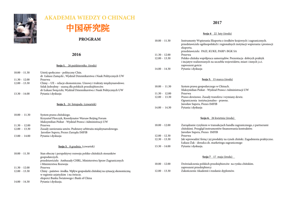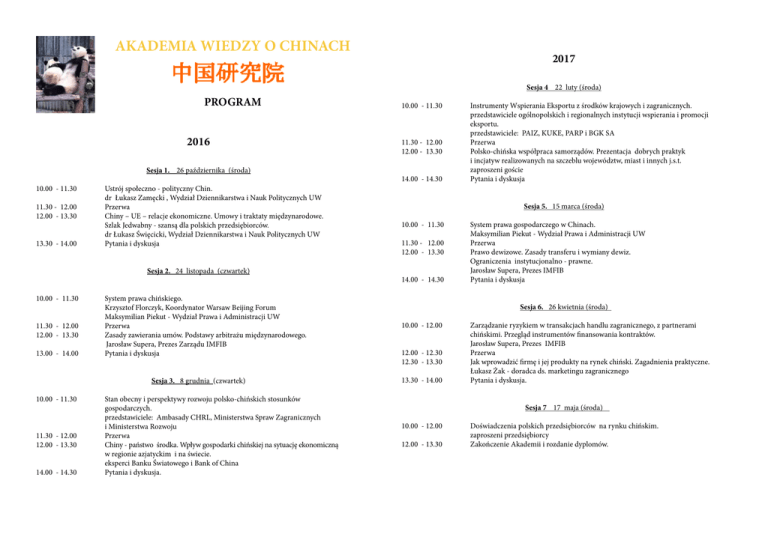 AKADEMIA WIEDZY O CHINACH 2017 Sesja 4 22 luty (środa) PROGRAM 10.00 - 11.30 Instrumenty Wspierania Eksportu z środków krajowych i zagranicznych. przedstawiciele ogólnopolskich i regionalnych instytucji wspierania i promocji eksportu. przedstawiciele: PAIZ, KUKE, PARP i BGK SA 11.30 - 12.00 Przerwa 12.00 - 13.30 Polsko-chińska współpraca samorządów. Prezentacja dobrych praktyk i incjatyw realizowanych na szczeblu województw, miast i innych j.s.t. zaproszeni goście 14.00 - 14.30 Pytania i dyskusja 2016 Sesja 1. 26 października (środa) 10.00 - 11.30 11.30 - 12.00 12.00 - 13.30 13.30 - 14.00 Ustrój społeczno - polityczny Chin. dr Łukasz Zamęcki , Wydział Dziennikarstwa i Nauk Politycznych UW Przerwa Chiny – UE – relacje ekonomiczne. Umowy i traktaty międzynarodowe. Szlak Jedwabny - szansą dla polskich przedsiębiorców. dr Łukasz Święcicki, Wydział Dziennikarstwa i Nauk Politycznych UW Pytania i dyskusja Sesja 5. 15 marca (środa) 10.00 - 11.30 11.30 - 12.00 12.00 - 13.30 14.00 - 14.30 Sesja 2. 24 listopada (czwartek) 10.00 - 11.30 System prawa chińskiego. Krzysztof Florczyk, Koordynator Warsaw Beijing Forum Maksymilian Piekut - Wydział Prawa i Administracji UW 11.30 - 12.00 Przerwa 12.00 - 13.30 Zasady zawierania umów. Podstawy arbitrażu międzynarodowego. Jarosław Supera, Prezes Zarządu IMFIB 13.00 - 14.00 Pytania i dyskusja Sesja 6. 26 kwietnia (środa) 10.00 - 12.00 12.00 - 12.30 12.30 - 13.30 13.30 - 14.00 Sesja 3. 8 grudnia (czwartek) 10.00 - 11.30 Stan obecny i perspektywy rozwoju polsko-chińskich stosunków gospodarczych. przedstawiciele: Ambasady CHRL, Ministerstwa Spraw Zagranicznych i Ministerstwa Rozwoju 11.30 - 12.00 Przerwa 12.00 - 13.30 Chiny - państwo środka. Wpływ gospodarki chińskiej na sytuację ekonomiczną w regionie azjatyckim i na świecie. eksperci Banku Światowego i Bank of China 14.00 - 14.30 Pytania i dyskusja. System prawa gospodarczego w Chinach. Maksymilian Piekut - Wydział Prawa i Administracji UW Przerwa Prawo dewizowe. Zasady transferu i wymiany dewiz. Ograniczenia instytucjonalno - prawne. Jarosław Supera, Prezes IMFIB Pytania i dyskusja Zarządzanie ryzykiem w transakcjach handlu zagranicznego, z partnerami chińskimi. Przegląd instrumentów finansowania kontraktów. Jarosław Supera, Prezes IMFIB Przerwa Jak wprowadzić firmę i jej produkty na rynek chiński. Zagadnienia praktyczne. Łukasz Żak - doradca ds. marketingu zagranicznego Pytania i dyskusja. Sesja 7 17 maja (środa) 10.00 - 12.00 Doświadczenia polskich przedsiębiorców na rynku chińskim. zaproszeni przedsiębiorcy 12.00 - 13.30 Zakończenie Akademii i rozdanie dyplomów.