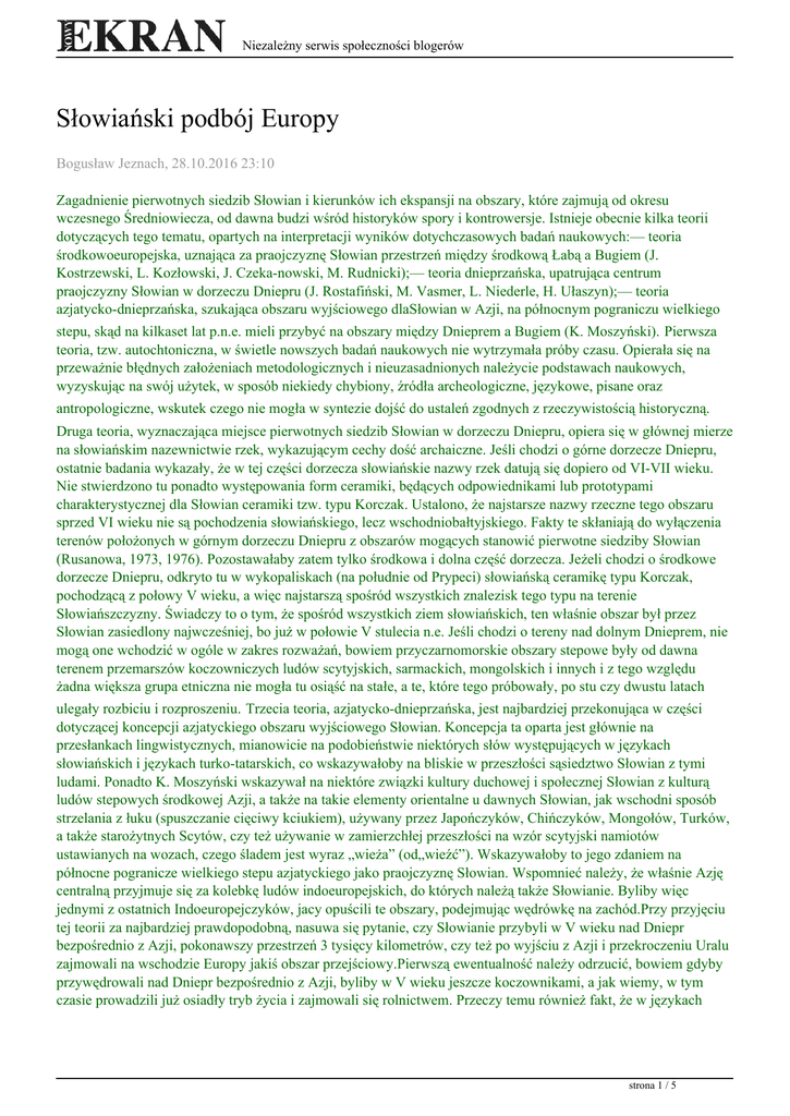 Niezależny serwis społeczności blogerów Słowiański podbój Europy Bogusław Jeznach, 28.10.2016 23:10 Zagadnienie pierwotnych siedzib Słowian i kierunków ich ekspansji na obszary, które zajmują od okresu wczesnego Średniowiecza, od dawna budzi wśród historyków spory i kontrowersje. Istnieje obecnie kilka teorii dotyczących tego tematu, opartych na interpretacji wyników dotychczasowych badań naukowych:— teoria środkowoeuropejska, uznająca za praojczyznę Słowian przestrzeń między środkową Łabą a Bugiem (J. Kostrzewski, L. Kozłowski, J. Czeka-nowski, M. Rudnicki);— teoria dnieprzańska, upatrująca centrum praojczyzny Słowian w dorzeczu Dniepru (J. Rostafiński, M. Vasmer, L. Niederle, H. Ułaszyn);— teoria azjatycko-dnieprzańska, szukająca obszaru wyjściowego dlaSłowian w Azji, na północnym pograniczu wielkiego stepu, skąd na kilkaset lat p.n.e. mieli przybyć na obszary między Dnieprem a Bugiem (K. Moszyński). Pierwsza teoria, tzw. autochtoniczna, w świetle nowszych badań naukowych nie wytrzymała próby czasu. Opierała się na przeważnie błędnych założeniach metodologicznych i nieuzasadnionych należycie podstawach naukowych, wyzyskując na swój użytek, w sposób niekiedy chybiony, źródła archeologiczne, językowe, pisane oraz antropologiczne, wskutek czego nie mogła w syntezie dojść do ustaleń zgodnych z rzeczywistością historyczną. Druga teoria, wyznaczająca miejsce pierwotnych siedzib Słowian w dorzeczu Dniepru, opiera się w głównej mierze na słowiańskim nazewnictwie rzek, wykazującym cechy dość archaiczne. Jeśli chodzi o górne dorzecze Dniepru, ostatnie badania wykazały, że w tej części dorzecza słowiańskie nazwy rzek datują się dopiero od VI-VII wieku. Nie stwierdzono tu ponadto występowania form ceramiki, będących odpowiednikami lub prototypami charakterystycznej dla Słowian ceramiki tzw. typu Korczak. Ustalono, że najstarsze nazwy rzeczne tego obszaru sprzed VI wieku nie są pochodzenia słowiańskiego, lecz wschodniobałtyjskiego. Fakty te skłaniają do wyłączenia terenów położonych w górnym dorzeczu Dniepru z obszarów mogących stanowić pierwotne siedziby Słowian (Rusanowa, 1973, 1976). Pozostawałaby zatem tylko środkowa i dolna część dorzecza. Jeżeli chodzi o środkowe dorzecze Dniepru, odkryto tu w wykopaliskach (na południe od Prypeci) słowiańską ceramikę typu Korczak, pochodzącą z połowy V wieku, a więc najstarszą spośród wszystkich znalezisk tego typu na terenie Słowiańszczyzny. Świadczy to o tym, że spośród wszystkich ziem słowiańskich, ten właśnie obszar był przez Słowian zasiedlony najwcześniej, bo już w połowie V stulecia n.e. Jeśli chodzi o tereny nad dolnym Dnieprem, nie mogą one wchodzić w ogóle w zakres rozważań, bowiem przyczarnomorskie obszary stepowe były od dawna terenem przemarszów koczowniczych ludów scytyjskich, sarmackich, mongolskich i innych i z tego względu żadna większa grupa etniczna nie mogła tu osiąść na stałe, a te, które tego próbowały, po stu czy dwustu latach ulegały rozbiciu i rozproszeniu. Trzecia teoria, azjatycko-dnieprzańska, jest najbardziej przekonująca w części dotyczącej koncepcji azjatyckiego obszaru wyjściowego Słowian. Koncepcja ta oparta jest głównie na przesłankach lingwistycznych, mianowicie na podobieństwie niektórych słów występujących w językach słowiańskich i językach turko-tatarskich, co wskazywałoby na bliskie w przeszłości sąsiedztwo Słowian z tymi ludami. Ponadto K. Moszyński wskazywał na niektóre związki kultury duchowej i społecznej Słowian z kulturą ludów stepowych środkowej Azji, a także na takie elementy orientalne u dawnych Słowian, jak wschodni sposób strzelania z łuku (spuszczanie cięciwy kciukiem), używany przez Japończyków, Chińczyków, Mongołów, Turków, a także starożytnych Scytów, czy też używanie w zamierzchłej przeszłości na wzór scytyjski namiotów ustawianych na wozach, czego śladem jest wyraz „wieża” (od„wieźć”). Wskazywałoby to jego zdaniem na północne pogranicze wielkiego stepu azjatyckiego jako praojczyznę Słowian. Wspomnieć należy, że właśnie Azję centralną przyjmuje się za kolebkę ludów indoeuropejskich, do których należą także Słowianie. Byliby więc jednymi z ostatnich Indoeuropejczyków, jacy opuścili te obszary, podejmując wędrówkę na zachód.Przy przyjęciu tej teorii za najbardziej prawdopodobną, nasuwa się pytanie, czy Słowianie przybyli w V wieku nad Dniepr bezpośrednio z Azji, pokonawszy przestrzeń 3 tysięcy kilometrów, czy też po wyjściu z Azji i przekroczeniu Uralu zajmowali na wschodzie Europy jakiś obszar przejściowy.Pierwszą ewentualność należy odrzucić, bowiem gdyby przywędrowali nad Dniepr bezpośrednio z Azji, byliby w V wieku jeszcze koczownikami, a jak wiemy, w tym czasie prowadzili już osiadły tryb życia i zajmowali się rolnictwem. Przeczy temu również fakt, że w językach strona 1 / 5 Niezależny serwis społeczności blogerów ludów finougryjskich obserwuje się liczne zapożyczenia z języka prasłowiańskiego, co świadczy o dłuższym sąsiedztwie Słowian z tymi ludami, a jak wiadomo, siedziby plemion finougryjskich znajdowały się dość daleko zarówno od stepów północnego Kazachstanu, jak i od dorzecza Dniepru — na północnych obszarach Europy, rozciągających się od Uralu do północnych wybrzeży Bałtyku. Zatem w swej wędrówce z Azji centralnej na zachód Słowianie musieli się zatrzymać na dłużej gdzieś w pobliżu finougryjskiego terytorium językowego. Gdzie wobec tego należy szukać owego obszaru przejściowego? Sięgnijmy ponownie do źródeł lingwistycznych. Oprócz wspomnianych licznych zapożyczeń słowiańskich w językach finougryjskich, stwierdzono podobne zjawisko między językiem prasłowiańskim a dawnymi językami irańskimi. W języku prasłowiańskim występują liczne wy