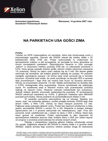Komentarz tygodniowy Doradców Finansowych Xelion Warszawa, 14 grudnia 2007 roku NA PARKIETACH USA GOŚCI ZIMA Polska Tydzień na GPW rozpoczęliśmy od wzrostów, które były kontynuacją ruchu z poprzedniego tygodnia. Oporem dla WIG20 okazał się lokalny dołek z 22 października około 3750 pkt. PodaŜ wykorzystała to znakomicie do sprowadzenia indeksu w dół szczególnie, Ŝe sprzyjała ku temu atmosfera na innych europejskich parkietach. Optymistyczne otwarcie w USA pomogło „bykom” w utrzymaniu indeksu powyŜej 3700 pkt. co odpowiada wzrostowi o 0,5%. DuŜo gorzej wypadły średnie spółki, których indeks zakończył notowania 1% przeceną. Obroty na całym rynku zbliŜyły się do 2 mld. We wtorek giełda otworzyła się neutralnie, ale kolejne godziny naleŜały do podaŜy. Po południu nastąpiło uspokojenie sytuacji i do końca sesji rynek poruszał się w trendzie bocznym. Wyraźnie było widać, Ŝe rynek wyczekuje na decyzje FED w sprawie stóp procentowych i tego dnia nie moŜna było liczyć na wyraźny kierunek. Obroty na przyzwoitym poziomie 1,6 mld. Giełda amerykańska na obniŜkę stóp o 0,25% zareagowała silną wyprzedaŜą. Gracze spodziewali się większego cięcia. Po spadkowej sesji w Stanach moŜna było przewidywać podobną reakcję na naszym rynku. Otwarcie notowań potwierdzało ten scenariusz. Jednak kolejne godziny przynosiły systematyczną poprawę. W konsekwencji WIG20 zakończył notowania na +0,8%. Z głównych indeksów tylko MWIG40 pozostał pod kreską. Obroty podobne do poniedziałkowych bliskie 2 mld. W czwartek ponownie otworzyliśmy się na minusie. Niestety tym razem „byki” nie podniosły rękawicy i podaŜ przejęła kontrolę. WIG20 tego dnia stracił 1,86%, a WIG 1,5%. Obroty na nieco niŜszym poziomie 1,5 mld. Piątkowa sesja pokazała słabość rynku. PodaŜ bez Ŝadnych problemów w kilka godzin sprowadziła WIG20 o ponad 2% w dół. Wsparcie w postaci dolnego ograniczenia luki z 5 grudnia zatrzymało ten niebezpieczny „rajd”. Przy tym poziomie rynek ustabilizował się i czekał na dane z USA o inflacji. Dane były nieco gorsze od oczekiwań. PodaŜ wykorzystała to jako argument do sprowadzenia indeksów jeszcze niŜej. Kolejne dane z USA tym razem lepsze od prognoz o produkcji przemysłowej nie wniosły duŜych zmian. Patrząc z perspektywy tygodnia główne indeksy odnotowały ponad 3% spadki. NajbliŜsze wsparcie dla WIG20 to lokalny dołek z 4 grudnia około 3500pkt. zejście poniŜej tego poziomu otwiera podaŜy drogę do testowania Wszelkie opinie i oceny zawarte w niniejszym dokumencie wyraŜają indywidualne opinie osób go sporządzających w dniu jego publikacji i nie mogą być interpretowane jako podstawa do podejmowania jakichkolwiek decyzji dotyczących inwestycji dokonywanych przez czytelnika. Xelion. Doradcy Finansowi Sp. z o.o. nie ponosi odpowiedzialności za skutki decyzji podjętych na podstawie niniejszego opracowania i zawartych w nim opinii autorów. listopadowego dołka 3430pkt. Opór to 3600 pkt. co odpowiada lokalnym szczytom z końca listopada, powrót powyŜej tego poziomy naleŜałoby odczytywać jak pozytywny sygnał dla posiadaczy długich pozycji. Japonia, Chiny, Indie Początek tygodnia na giełdzie w Tokyo mimo lepszych od prognoz danych dotyczących zamówień przemysłowych zakończył się obniŜeniem indeksu Nikkei 225 o 0.2% w wyniku małych obrotów spowodowanych oczekiwaniem przed wtorkową decyzją rady Fed. Reakcja na obniŜenie stóp przez Fed jak równieŜ wyŜsze dane inflacyjne wraz z zapowiedzią władz monetarnych USA, Kanady, wielkiej Brytanii, Szwajcarii i strefy euro o dodatkowej interwencji słuŜącej zwiększeniu płynności wywołała reakcję negatywną na rynku akcji w Japonii. Indeks Nikkei 225 stracił w środę i w czwartek 3.18%. Z kolei piątkowy raport Banku Centralnego Japonii publikujący dane indeksu Tankan za usługi i przemysł, które wskazały niŜszą wartość od poprzedniej, dodatkowo wpłynęły na obniŜenie indeksu o 0.14%. Ucierpiały przede wszystkim walory banków i z sektora budownictwa. W ujęciu całego tygodnia indeks Nikkei stracił 2.76% zamykając się poziomem 15514pkt. Z kolei na giełdzie w Shanghaiu początek tygodnia był kontynuacją siły popytu z poprzedniego. Indeks Shanghai Composite trakcie pierwszych dwóch sesji wzrósł o 1.64% przekraczając poziom 5175pkt. W trakcie sesji w środę i w czwartek mieliśmy przecenę walorów giełdowych odpowiednio o 1.54% i 2.70%. Na taki obrót sprawy miały wpływ przecena akcji na świecie i gorszy sentyment oraz informacje o inflacji listopadowej, które wzrosły do 6.9% względem roku poprzedniego, co było najwyŜszym wynikiem od jedenastu lat. W trakcie ostatniej sesji indeks wzrósł 1.01% zamykając tygodniowe notowania poziomem 5007pkt. Bezpośrednie inwestycje zagraniczne w ciągu jedenastu miesięcy bieŜącego roku wyniosły ponad 60 mld dolarów co stanowi wzrost o blisko 14% względem roku 2006. Mimo iŜ zauwaŜalny jest spadek ilości nowych zarejestrowanych zagranicznych firm na rynku to dzięki otwarciu szczególnie sektora usługowego i wysokiej technologii było moŜliwe uzyskanie tak dobrego wyniku. Na tle całego tygodnia indeks SCI obniŜył się o 1.59%. Natomiast na giełdzie w Bombaju sesje notowań giełdowych w tym tygodniu charakteryzowały się zmiennością popytu i podaŜy. Pierwsza sesja nie przyniosła wyraźnego sygnału z uwagi na oczekiwanie rynków posiedzeniem Fedu. Wtorkowa i środowa sesja przyniosła wzrost notowań indeksu blue chipów o 2.23%, który po raz pierwszy w historii przekroczył pułap 20000pkt. Umocnienie indyjskiej rupii względem dolara do poziomu 39.3 wskazywało na napływ kapitału i wsparcie dla rynku akcyjnego. Czwartkowe notowania cechowały się sentymentem, który panował w całym regionie Azji po rozczarowaniu, iŜ Fed nie zaskoczył większym cięciem stóp. Stłumiony optymizm inwestorów sprowokował do realiza