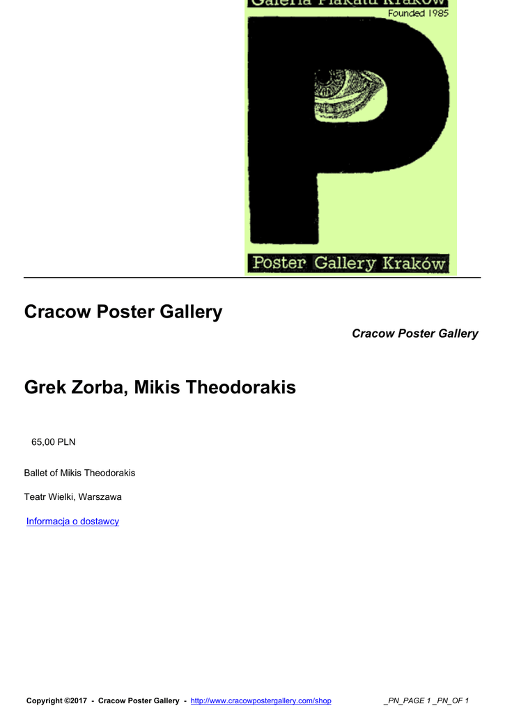 Cracow Poster Gallery Cracow Poster Gallery Grek Zorba, Mikis Theodorakis 65,00 PLN Ballet of Mikis Theodorakis Teatr Wielki, Warszawa Informacja o dostawcy Copyright ©2017 - Cracow Poster Gallery - http://www.cracowpostergallery.com/shop _PN_PAGE 1 _PN_OF 1