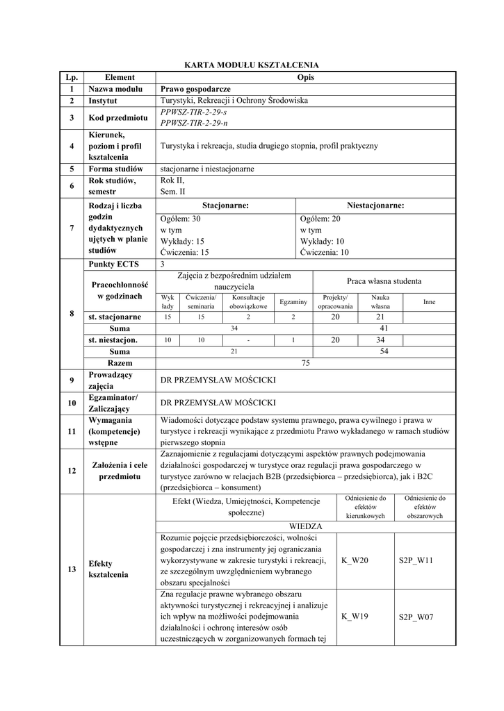Lp. 1 2 3 4 5 6 7 Element Nazwa modułu Instytut Kod przedmiotu Kierunek, poziom i profil kształcenia Forma studiów Rok studiów, semestr Rodzaj i liczba godzin dydaktycznych ujętych w planie studiów Punkty ECTS Pracochłonność w godzinach 8 9 10 11 12 st. stacjonarne Suma st. niestacjon. Suma Razem Prowadzący zajęcia Egzaminator/ Zaliczający Wymagania (kompetencje) wstępne Założenia i cele przedmiotu KARTA MODUŁU KSZTAŁCENIA Opis Prawo gospodarcze Turystyki, Rekreacji i Ochrony Środowiska PPWSZ-TIR-2-29-s PPWSZ-TIR-2-29-n Turystyka i rekreacja, studia drugiego stopnia, profil praktyczny stacjonarne i niestacjonarne Rok II, Sem. II Stacjonarne: Niestacjonarne: Ogółem: 30 w tym Wykłady: 15 Ćwiczenia: 15 3 Zajęcia z bezpośrednim udziałem nauczyciela Wyk łady Ćwiczenia/ seminaria 15 15 Ogółem: 20 w tym Wykłady: 10 Ćwiczenia: 10 Praca własna studenta Konsultacje obowiązkowe Egzaminy Projekty/ opracowania Nauka własna 2 2 20 - 1 20 21 41 34 54 34 10 10 21 75 DR PRZEMYSŁAW MOŚCICKI DR PRZEMYSŁAW MOŚCICKI Wiadomości dotyczące podstaw systemu prawnego, prawa cywilnego i prawa w turystyce i rekreacji wynikające z przedmiotu Prawo wykładanego w ramach studiów pierwszego stopnia Zaznajomienie z regulacjami dotyczącymi aspektów prawnych podejmowania działalności gospodarczej w turystyce oraz regulacji prawa gospodarczego w turystyce zarówno w relacjach B2B (przedsiębiorca – przedsiębiorca), jak i B2C (przedsiębiorca – konsument) Efekt (Wiedza, Umiejętności, Kompetencje społeczne) 13 Efekty kształcenia Inne WIEDZA Rozumie pojęcie przedsiębiorczości, wolności gospodarczej i zna instrumenty jej ograniczania wykorzystywane w zakresie turystyki i rekreacji, ze szczególnym uwzględnieniem wybranego obszaru specjalności Zna regulacje prawne wybranego obszaru aktywności turystycznej i rekreacyjnej i analizuje ich wpływ na możliwości podejmowania działalności i ochronę interesów osób uczestniczących w zorganizowanych formach tej Odniesienie do efektów kierunkowych Odniesienie do efektów obszarowych K_W20 S2P_W11 K_W19 S2P_W07 aktywności UMIEJĘTNOŚCI Potrafi prowadzić własną działalność gospodarczą lub kierować przedsiębiorstwem turystycznym lub K_U18 rekreacyjnym, przy zatrudnieniu pracowników Potrafi posługiwać się wzorami umów stosowanymi w zakresie turystyki i rekreacji oraz K_U20 dostosowywać je do indywidualnych potrzeb KOMPETENCJE SPOŁECZNE Realistycznie ocenia swoje kompetencje, jest świadom ich ograniczeń, także wynikających z K_K02 potrzeby ochrony interesów innych osób i wie, kiedy zwrócić się do ekspertów. Efekt kształcenia 14 Forma i warunki potwierdzenia efektu kształcenia Rozumie pojęcie przedsiębiorczości, wolności gospodarczej i zna instrumenty jej ograniczania wykorzystywane w zakresie turystyki i rekreacji, ze szczególnym uwzględnieniem wybranego obszaru specjalności Zna regulacje prawne wybranego obszaru aktywności turystycznej i rekreacyjnej i analizuje ich wpływ na możliwości podejmowania działalności i ochronę interesów osób uczestniczących w zorganizowanych formach tej aktywności Potrafi prowadzić własną działalność gospodarczą lub kierować przedsiębiorstwem turystycznym lub rekreacyjnym, przy zatrudnieniu pracowników Potrafi posługiwać się wzorami umów stosowanymi w zakresie turystyki i rekreacji oraz dostosowywać je do indywidualnych potrzeb Realistycznie ocenia swoje kompetencje, jest świadom ich ograniczeń, także wynikających z potrzeby ochrony interesów innych osób i wie, kiedy zwrócić się do ekspertów. S2P_U06 S2P_U05 M2_K02 P2P_K01 Sposób potwierdzenia (weryfikacji) wyszukuje, przedstawia i prezentuje przepisy prawne w zakresie działalności gospodarczej w turystyce i rekreacji analizuje przepisy prawne celem rozwiązania zagadnień problemowych i przedstawia propozycje rozwiązań, popierając je argumentacją prawną potrafi wskazać przepisy prawne dotyczące prowadzenia działalności gospodarczej i zatrudnienia pracowników; rozwiązuje zagadnienia problemowe w tym zakresie potrafi sporządzić projekty podstawowych umów stosowanych w działalności gospodarczej zgodnie z obowiązującymi przepisami, unika stosowania postanowień, które są sprzeczne z przepisami prawa. bierze aktywny udział w dyskusji 15 Stosowane metody dydaktyczne wykład informacyjny, ćwiczenia, metoda przypadków 16 Treści merytoryczne przedmiotu Wykłady: pojęcie prawa gospodarczego, zasady podejmowania działalności gospodarczej, formy prowadzenia działalności gospodarczej, wymagania dla prowadzenia różnego rodzaju działalności gospodarczej w turystyce, ochrona prawna konsumenta i związane z tym obowiązki przedsiębiorcy, klauzule abuzywne, sądowe postępowanie cywilne z uwzględnieniem specyfiki spraw gospodarczych, regulacje podatkowe w działalności gospodarczej; prawo pracy w praktyce działalności gospodarczej w turystyce; ochrona nieuczciwej konkurencji. Ćwiczenia: umowy w obrocie gospodarczym, wzorce umów, zasady odpowiedzialności kontraktowej przedsiębiorcy wobec kontrahentów gospodarczych i wobec konsumentów – omawianie casusów; przykłady klauzul abuzywnych w umowach z konsumentami, praktyczne aspekty dochodzenia roszczeń przed organami wymiaru sprawiedliwości 17 18 19 Forma i warunki zaliczenia modułu, w tym zasady dopuszczenia do egzaminu /zaliczenia Wykaz literatury podstawowej Wykaz literatury uzupełniającej (pomocniczej) Egzamin po sem. II - obecność na ćwiczeniach (dopuszczalna 1 godz. usprawiedliwionej nieobecności), - aktywność na zajęciach - zaliczenie ćwiczeń 1. Powałowski A. 2012, Prawo gospodarcze publiczne, C.H.Beck, Warszawa 2. Stec T., Stec M. 2012, Prawo gospodarcze prywatne, C.H.Beck, Warszawa 1. Olszewski J. 2013, Prawo gospodarcze. Kompendium, C.H.Beck, Warszawa 2. Koch A., Napierała J. 2013, Umowy w obrocie gospodarczym, WoltersKluwer, Warszawa.