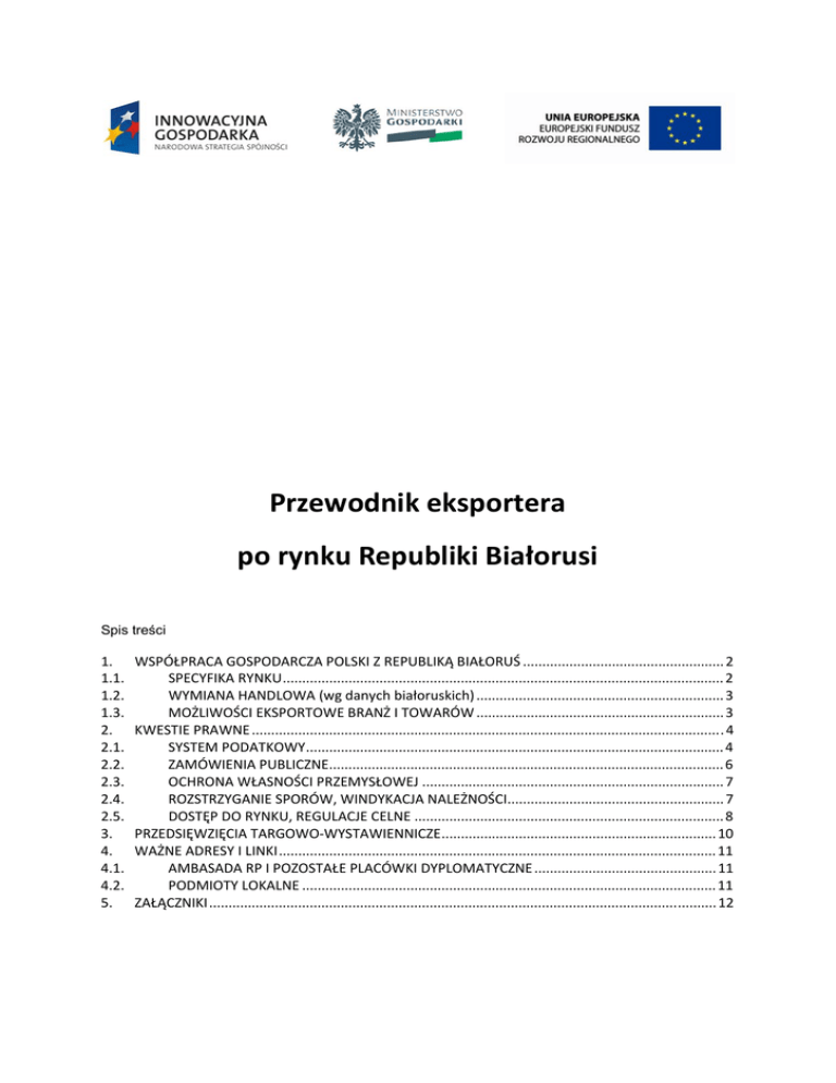 Przewodnik eksportera po rynku Republiki Białorusi Spis treści 1. 1.1. 1.2. 1.3. 2. 2.1. 2.2. 2.3. 2.4. 2.5. 3. 4. 4.1. 4.2. 5. WSPÓŁPRACA GOSPODARCZA POLSKI Z REPUBLIKĄ BIAŁORUŚ .................................................... 2 SPECYFIKA RYNKU.................................................................................................................. 2 WYMIANA HANDLOWA (wg danych białoruskich) ................................................................ 3 MOŻLIWOŚCI EKSPORTOWE BRANŻ I TOWARÓW ................................................................ 3 KWESTIE PRAWNE .......................................................................................................................... 4 SYSTEM PODATKOWY............................................................................................................ 4 ZAMÓWIENIA PUBLICZNE...................................................................................................... 6 OCHRONA WŁASNOŚCI PRZEMYSŁOWEJ .............................................................................. 7 ROZSTRZYGANIE SPORÓW, WINDYKACJA NALEŻNOŚCI........................................................ 7 DOSTĘP DO RYNKU, REGULACJE CELNE ................................................................................ 8 PRZEDSIĘWZIĘCIA TARGOWO‐WYSTAWIENNICZE....................................................................... 10 WAŻNE ADRESY I LINKI................................................................................................................. 11 AMBASADA RP I POZOSTAŁE PLACÓWKI DYPLOMATYCZNE ............................................... 11 PODMIOTY LOKALNE ........................................................................................................... 11 ZAŁĄCZNIKI................................................................................................................................... 12 1. WSPÓŁPRACA BIAŁORUSI 1.1. SPECYFIKA RYNKU GOSPODARCZA POLSKI Z REPUBLIKĄ Republika Białorusi (w skrócie Białoruś) położona jest w Europie Wschodniej i nie ma dostępu do morza. Powierzchnia kraju wynosi 207,6 tys. km2, a zamieszkiwana jest przez 9,5 mln obywateli. Pod względem rozwoju gospodarczego Białoruś była jedną z lepiej rozwiniętych republik radzieckich. Po rozpadzie ZSRR gospodarka białoruska przeżyła okres silnej recesji. W roku 1996 regres został powstrzymany i rozpoczął się wzrost gospodarczy. W latach 2000-2003 gospodarka Białorusi rozwijała się w tempie 4,7-6,8% rocznie. Największy wzrost PKB odnotowano w 2008 roku, kiedy wyniósł on 10,2%. W 2010 roku wzrost PKB wyniósł 7,6%, a w 2011 - 5,3%. W obowiązującym nakazowo-rozdzielczym modelu gospodarki, otrzymanym w spadku po ZSRR, z niewieloma elementami gospodarki rynkowej, mimo upływu ponad 20 lat od utworzenia państwa Białoruś, jak można się spodziewać, dominują przedsiębiorstwa państwowe, w znacznej ilości mało efektywne, posiadające wsparcie finansowe ze strony państwa oraz monopolistyczną pozycję na rynku. Głównym czynnikiem wzrostu PKB Białorusi w ciągu ostatnich lat była stymulująca wzrost popytu wewnętrznego polityka rządowa, wspierana kredytami bankowymi, z dodatkowej emisji pieniądza przez bank centralny RB. W efekcie nastąpiło wyraźne zwiększenie produkcji przemysłu i rolnictwa oraz nakładów inwestycyjnych. Wskaźniki wzrostu produkcji przemysłu wykazują tempo wzrostu na poziomie około 10 % rocznie, a wskaźniki sprzedaży detalicznej w niektórych dziedzinach nawet 20%. Jednakże prowadzona w ciągu ostatnich lat populistyczna polityka ekonomiczna państwa skutkowała ostrym kryzysem finansowym w 2011 roku, kiedy to białoruska gospodarka przeżyła kilka poważnych wstrząsów. Rubel białoruski był w ciągu roku dwukrotnie dewaluowany, inflacja wyniosła 108,7%, a dochody ludności w ujęciu dolarowym spadły o ponad połowę. Pomimo podawanego przez oficjalne statystyki wzrostu podstawowych wskaźników makroekonomicznych, gospodarkę białoruską nadal cechuje brak reform rynkowych, bariery biurokratyczne, ogromne koszty świadczeń socjalnych ponoszone przez białoruskie przedsiębiorstwa oraz utrzymywanie zbędnej rzeszy urzędników w administracji państwowej. W ostatnich 5-u latach przemysł generuje ok. 26 % PKB i stanowi podstawę gospodarki Białorusi. Kraj dysponuje dużym, ale przestarzałym potencjałem wytwórczym, relatywnie tanią siłą roboczą oraz potencjałem badawczo-naukowym. Do 1991 roku białoruski przemysł (zwłaszcza metalowy, maszynowy, chemiczny, petrochemiczny, energetyka i przemysł lekki) był ściśle powiązany z gospodarką Związku Radzieckiego. Republika Białoruś nadal przoduje wśród krajów Wspólnoty Niepodległych Państw (WNP) w produkcji nawozów potasowych, kombajnów zbożowych, roztrząsaczy do nawozów organicznych czy przemysłowych maszyn do szycia. Zajmuje drugie miejsce w produkcji ciężarówek, traktorów, włókien sztucznych, motocykli i drewna. Ziemie uprawne zajmują 8,9 mln ha, czyli około 43% powierzchni kraju. Uprawia się głównie zboża (jęczmień, żyto, pszenicę, pszenżyto), ziemniaki, buraki cukrowe, warzywa i len. Największy areał upraw stanowią zboża (46,1%) oraz rośliny pastewne (36,9%), zaś uprawy ziemniaków zajmują 6,6% obszaru upraw. Większość produkcji (ponad 60%) przypada na gospodarstwa państwowe oraz duże gospodarstwa farmerskie. Indywidualne gospodarstwa rolne (gospodarstwa farmerskie) i pozostałe grunty sektora prywatnego, w posiadaniu których znajduje się jedynie 20% obszarów uprawnych dostarczają 6,4% produkcji zbóż, 87,1% produkcji warzyw, i 88,9% produkcji ziemniaków. Ustawodawstwo nie sprzyja indywidualnym rolnikom, a pomoc ze strony państwa jest mniejsza niż dla kołchozów i sowchozów. Pomoc dla państwowych gospodarstw jest dwojakiego rodzaju: bezpośrednia - z dotacji budżetowych lub pośrednia - w postaci nisko