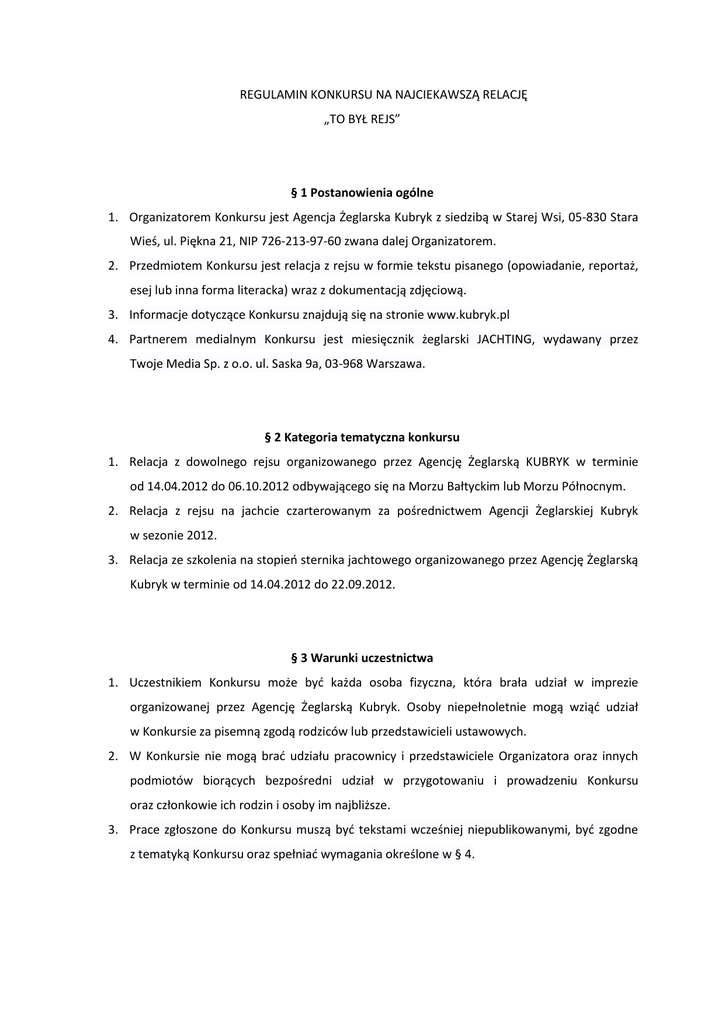 REGULAMIN KONKURSU NA NAJCIEKAWSZĄ RELACJĘ „TO BYŁ REJS” § 1 Postanowienia ogólne 1. Organizatorem Konkursu jest Agencja Żeglarska Kubryk z siedzibą w Starej Wsi, 05-830 Stara Wieś, ul. Piękna 21, NIP 726-213-97-60 zwana dalej Organizatorem. 2. Przedmiotem Konkursu jest relacja z rejsu w formie tekstu pisanego (opowiadanie, reportaż, esej lub inna forma literacka) wraz z dokumentacją zdjęciową. 3. Informacje dotyczące Konkursu znajdują się na stronie www.kubryk.pl 4. Partnerem medialnym Konkursu jest miesięcznik żeglarski JACHTING, wydawany przez Twoje Media Sp. z o.o. ul. Saska 9a, 03-968 Warszawa. § 2 Kategoria tematyczna konkursu 1. Relacja z dowolnego rejsu organizowanego przez Agencję Żeglarską KUBRYK w terminie od 14.04.2012 do 06.10.2012 odbywającego się na Morzu Bałtyckim lub Morzu Północnym. 2. Relacja z rejsu na jachcie czarterowanym za pośrednictwem Agencji Żeglarskiej Kubryk w sezonie 2012. 3. Relacja ze szkolenia na stopień sternika jachtowego organizowanego przez Agencję Żeglarską Kubryk w terminie od 14.04.2012 do 22.09.2012. § 3 Warunki uczestnictwa 1. Uczestnikiem Konkursu może być każda osoba fizyczna, która brała udział w imprezie organizowanej przez Agencję Żeglarską Kubryk. Osoby niepełnoletnie mogą wziąć udział w Konkursie za pisemną zgodą rodziców lub przedstawicieli ustawowych. 2. W Konkursie nie mogą brać udziału pracownicy i przedstawiciele Organizatora oraz innych podmiotów biorących bezpośredni udział w przygotowaniu i prowadzeniu Konkursu oraz członkowie ich rodzin i osoby im najbliższe. 3. Prace zgłoszone do Konkursu muszą być tekstami wcześniej niepublikowanymi, być zgodne z tematyką Konkursu oraz spełniać wymagania określone w § 4. § 4 Zasady Konkursu 1. Termin nadsyłania prac konkursowych rozpoczyna się dnia 1 marca 2012 i kończy się 1 listopada 2012. 2. Organizator zastrzega sobie prawo do zawieszenia, przerwania, przedłużenia lub odwołania Konkursu z ważnych przyczyn. 3. Aby wziąć udział w Konkursie należy być uczestnikiem imprezy organizowanej przez Agencję Żeglarską KUBRYK i w wyznaczonym terminie przesłać pocztą elektroniczną pod adres: [email protected] relację wraz ze zdjęciami. 4. Wymogi formalne odnośnie prac konkursowych. relacja powinna zwierać od 7000 do 8000 znaków bez spacji i zostać przesłana w formie elektronicznej jako plik Microsoft Office, Open Office Writer lub jakikolwiek plik tekstowy *.txt lub *.rtf o edytowanej treści. materiał zdjęciowy ilustrujący artykuł powinien zawierać od 15 do 30 zdjęć, każde o wielkości co najmniej 1,5-2,5 MB (1800x2500 pikseli), w formacie jpg lub tiff. dane osobowe: imię i nazwisko, adres korespondencyjny, adres e-mail oraz telefon kontaktowy. Jeżeli osoba biorąca udział w Konkursie była załogantem na czarterowanym u nas jachcie, prosimy o podanie nazwiska skippera, który podpisywał z nami umowę czarteru. Relacja musi być napisana samodzielnie i nie może naruszać praw autorskich osób trzecich. 5. Relacja nie może być tekstem wcześniej publikowanym. Zgłoszenie relacji do Konkursu jest równoznaczne z akceptacją niniejszego Regulaminu i wyrażeniem zgody na nieodpłatne i wielokrotne opublikowanie nadesłanych prac oraz zdjęć w Magazynie Jachting oraz na stronie internetowej i w publikacjach Organizatora. 6. Nadesłanie prac jest również równoznaczne z oświadczeniem Uczestnika konkursu, iż przysługują mu wszelkie niezbędne prawa, w tym autorskie prawa majątkowe oraz prawa pokrewne w stosunku do nadesłanych materiałów, mających charakter utworów w rozumieniu ustawy o prawie autorskim i prawach pokrewnych, w zakresie niezbędnym dla publikacji oraz wyrażeniem zgody na publikację przez osoby trzecie. Uczestnik oświadcza również, że zdjęcia, o których mowa w zdaniu poprzednim nie będą naruszały przepisów prawa, ani jakichkolwiek prawem chronionych dóbr osób trzecich. 7. W przypadku, gdyby którekolwiek z oświadczeń zawartych w ust. 5 i 6 niniejszego regulaminu nie zostało zrealizowane, uczestnik Konkursu zwolni Organizatora z jakiejkolwiek odpowiedzialności względem osób trzecich. Ponadto, w odniesieniu do treści oświadczeń z ust. 5 i 6, Uczestnik oświadcza, że Organizator nie będzie zobowiązany do ponoszenia jakichkolwiek opłat na rzecz osób trzecich bądź organizacji reprezentujących twórców i uprawnionych z tytułu praw pokrewnych, tak z Polski, jak i z zagranicy. 8. Zgłoszenie relacji do Konkursu jest równoznaczne z wyrażeniem zgody Uczestnika a przetwarzanie w celach konkursowych, promocyjnych i marketingowych przez Organizatora danych osobowych Uczestnika (zgodnie z art. 23 ust. 1 pkt 1 ustawy z dnia 29 sierpnia 1997 r. o ochronie danych osobowych (Dz. U. z 2002 r. Nr 101 poz. 926), które Uczestnik przekazuje dobrowolnie, zastrzegając sobie prawo ich sprawdzenia i poprawienia lub usunięcia danych w przypadku otrzymania nagrody. 9. Regulamin będzie dostępny w siedzibie Organizatora przy ul. Pięknej 21 w Starej Wsi oraz na stronie internetowej www.kubryk.pl. Regulamin obowiązuje od momentu jego zamieszczenia. § 5Ocena prac i nagrody 1. Oceny nadesłanych na Konkurs prac dokona Jury powołane przez Organizatora. Pod uwagę będą brane m.in. pod walory literackie, jakość, oryginalność, wyjątkowość zarówno tekstu, jak i zdjęć. 2. Nagrodą główną w Konkursie jest: Voucher na dowolny rejs po Morzu Bałtyckim organizowany w sezonie 2013 przez Organizatora Kwota pieniężna w wysokości 11,11% wartości vouchera przyznanego laureatowi Konkursu. Przed wydaniem nagrody od łącznej wartości nagrody (rzeczowej i pieniężnej), Organizator naliczy właściwy podatek na poczet podatku dochodowego, zgodnie z postanowieniami ustawy z dnia 26 lipca 1991 o podatku dochodowym od osób fizycznych, który zostanie przez niego potrącony z przyznanej laureatowi Konkursu nagrody i odprowadzony do właściwego urzędu skarboweg