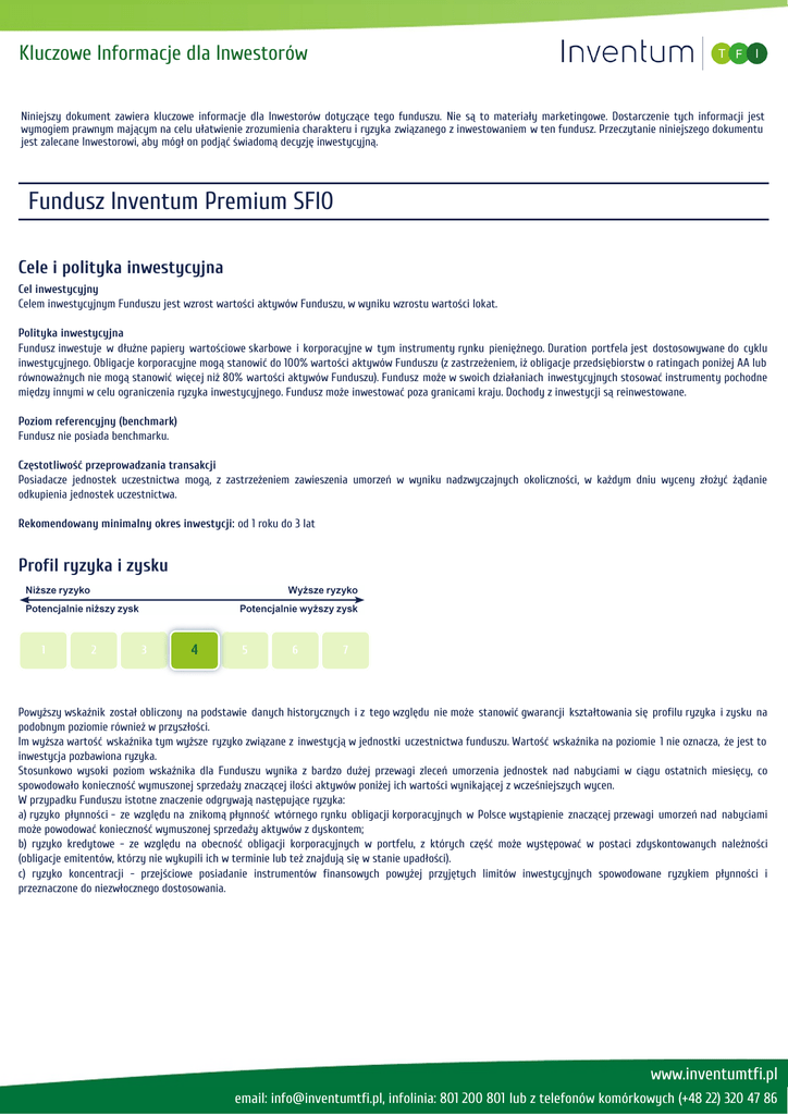Kluczowe Informacje dla Inwestorów Niniejszy dokument zawiera kluczowe informacje dla Inwestorów dotyczące tego funduszu. Nie są to materiały marketingowe. Dostarczenie tych informacji jest wymogiem prawnym mającym na celu ułatwienie zrozumienia charakteru i ryzyka związanego z inwestowaniem w ten fundusz. Przeczytanie niniejszego dokumentu jest zalecane Inwestorowi, aby mógł on podjąć świadomą decyzję inwestycyjną. Fundusz Inventum Premium SFIO Cele i polityka inwestycyjna Cel inwestycyjny Celem inwestycyjnym Funduszu jest wzrost wartości aktywów Funduszu, w wyniku wzrostu wartości lokat. Polityka inwestycyjna Fundusz inwestuje w dłużne papiery wartościowe skarbowe i korporacyjne w tym instrumenty rynku pieniężnego. Duration portfela jest dostosowywane do cyklu inwestycyjnego. Obligacje korporacyjne mogą stanowić do 100% wartości aktywów Funduszu (z zastrzeżeniem, iż obligacje przedsiębiorstw o ratingach poniżej AA lub równoważnych nie mogą stanowić więcej niż 80% wartości aktywów Funduszu). Fundusz może w swoich działaniach inwestycyjnych stosować instrumenty pochodne między innymi w celu ograniczenia ryzyka inwestycyjnego. Fundusz może inwestować poza granicami kraju. Dochody z inwestycji są reinwestowane. Poziom referencyjny (benchmark) Fundusz nie posiada benchmarku. Częstotliwość przeprowadzania transakcji Posiadacze jednostek uczestnictwa mogą, z zastrzeżeniem zawieszenia umorzeń w wyniku nadzwyczajnych okoliczności, w każdym dniu wyceny złożyć żądanie odkupienia jednostek uczestnictwa. Rekomendowany minimalny okres inwestycji: od 1 roku do 3 lat Profil ryzyka i zysku 1 2 3 4 5 6 7 Powyższy wskaźnik został obliczony na podstawie danych historycznych i z tego względu nie może stanowić gwarancji kształtowania się profilu ryzyka i zysku na podobnym poziomie również w przyszłości. Im wyższa wartość wskaźnika tym wyższe ryzyko związane z inwestycją w jednostki uczestnictwa funduszu. Wartość wskaźnika na poziomie 1 nie oznacza, że jest to inwestycja pozbawiona ryzyka. Stosunkowo wysoki poziom wskaźnika dla Funduszu wynika z bardzo dużej przewagi zleceń umorzenia jednostek nad nabyciami w ciągu ostatnich miesięcy, co spowodowało konieczność wymuszonej sprzedaży znaczącej ilości aktywów poniżej ich wartości wynikającej z wcześniejszych wycen. W przypadku Funduszu istotne znaczenie odgrywają następujące ryzyka: a) ryzyko płynności - ze względu na znikomą płynność wtórnego rynku obligacji korporacyjnych w Polsce wystąpienie znaczącej przewagi umorzeń nad nabyciami może powodować konieczność wymuszonej sprzedaży aktywów z dyskontem; b) ryzyko kredytowe - ze względu na obecność obligacji korporacyjnych w portfelu, z których część może występować w postaci zdyskontowanych należności (obligacje emitentów, którzy nie wykupili ich w terminie lub też znajdują się w stanie upadłości). c) ryzyko koncentracji - przejściowe posiadanie instrumentów finansowych powyżej przyjętych limitów inwestycyjnych spowodowane ryzykiem płynności i przeznaczone do niezwłocznego dostosowania. www.inventumtfi.pl email: [email protected], infolinia: 801 200 801 lub z telefonów komórkowych (+48 22) 320 47 86 Opłaty związane z funduszem Pobrane opłaty wykorzystuje się do zarządzania funduszem. Zawierają one także koszty dystrybucji i marketingu jednostek uczestnictwa. Poprzez pobranie kosztów zmniejsza się potencjał rozwoju wartości. Jednorazowe opłaty pobierane przed zaiwestowaniem lub po zainwestowaniu Opłata za subskrypcję: 0,00 % Opłata za umorzenie: 0,00 % Opłata za konwersję: 0,00 % Są to najwyższe kwoty, jakie mogą zostać pobrane z Państwa inwestycji przed inwestycją środków bądź wypłatą zysków. Informacji nt. aktualnych opłat udziela jednostka sprzedaży. Koszty, którymi obciąża się fundusz w ciągu roku Koszty bieżące: 1,61 % Opłaty pobierane od fuduszu pod określonymi warunkami Opłata odnosząca się do wyników: brak Podano maksymalne stawki w oparciu o które mogą zostać obliczone opłaty pobierane ze środków Inwestora. Szczegółowe informacje dotyczące opłat znajdują się w prospekcie informacyjnym dostępnym na stronie internetowej www.inventumtfi.pl w zakładce dokumenty. W przypadku, gdy Uczestnik dokonuje zamiany/konwersji do innego Subfunduszu/Funduszu zarządzanego przez Towarzystwo, o wyższej stawce Opłaty manipulacyjnej, pobierana jest Opłata Wyrównawcza stanowiąca różnicę pomiędzy Opłatą manipulacyjną Subfunduszu/Funduszu, do którego następuje zamiana/konwersja a Opłatą manipulacyjną Subfunduszu/Funduszu, z którego następuje zamiana/konwersja. Tabela Opłat zawierająca aktualną wysokość Opłaty manipulacyjnej jest udostępniana przez Dystrybutorów w sieci sprzedaży, przez Towarzystwo w siedzibie Towarzystwa i na stronie internetowej www.inventumtfi.pl. Opłaty ponoszone przez Inwestora służą pokryciu kosztów związanych z działalnością Funduszu, w tym m.in. kosztów dystrybucji i zmniejszają potencjalny zysk z inwestycji. Wskaźnik opłat bieżących został policzony na podstawie danych ze sprawozdań finansowych za 2013 rok. Wysokość opłat bieżących pobieranych z Funduszu może co roku ulegać zmianie. Wyniki osiągnięte w przeszłości Prezentowane wyniki są oparte na historycznych danych i nie stanowią gwarancji osiągnięcia podobnych w przyszłości. Wyniki nie uwzględniają opodatkowania Inwestora. Inventum Premium SFIO rozpoczął działalność 31 sierpnia 2000 r. Wyniki zostały obliczone w PLN. Informacje praktyczne Depozytariusz: ING Bank Śląski S.A. Powyższe Kluczowe informacje dla inwestorów opisują Inventum Premium Specjalistyczny Fundusz Inwestycyjny Otwarty. Kolejne informacje o Funduszu, prospekt informacyjny, ostatnie jednostkowe sprawozdanie roczne oraz późniejsze jednostkowe sprawozdania półroczne Funduszu dostępne są bezpłatnie w ję