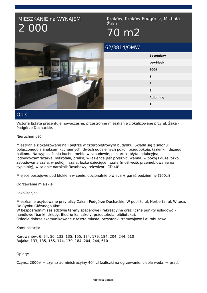 MIESZKANIE na WYNAJEM 2 000 Kraków, Kraków-Podgórze, Michała Żaka 70 m2 62/3814/OMW Secondary LowBlock 2009 1 4 3 Adjoining 1 Opis Victoria Estate prezentuje nowoczesne, przestronne mieszkanie zlokalizowane przy ul. Żaka Podgórze Duchackie. Nieruchomość: Mieszkanie zlokalizowane na I piętrze w czteropiętrowym budynku. Składa się z salonu połączonego z aneksem kuchennych, dwóch oddzielnych pokoi, przedpokoju, łazienki i dużego balkonu. Na wyposażeniu kuchni meble w zabudowie, piekarnik, płyta indukcyjna, lodówko-zamrażarka, mikrofala, pralka, w łazience jest prysznic, wanna, w pokój I duże łóżko, zabudowana szafa, w pokój II szafa, łóżko dziecięce i szafa (możliwość przemeblowania na sypialnię), w salonie narożnik 3osobowy, telewizor LCD 40" Miejsce postojowe pod blokiem w cenie, opcjonalnie piwnica + garaż podziemny (100zł) Ogrzewanie miejskie Lokalizacja: Mieszkanie usytuowane przy ulicy Żaka - Podgórze Duchackie. W pobliżu ul. Herberta, ul. Witosa. Do Rynku Głównego 6km. W bezpośrednim sąsiedztwie tereny spacerowe i rekreacyjne oraz liczne punkty usługowo handlowe (banki, sklepy, Biedronka, szkoły, przedszkola, biblioteka). Osiedle dobrze skomunikowane z resztą miasta, przystanki tramwajowe i autobusowe. Komunikacja: Kurdwanów: 6, 24, 50, 133, 135, 155, 174, 179, 184, 204, 244, 610 Bujaka: 133, 135, 155, 174, 179, 184, 204, 244, 610 Opłaty: Czynsz 2000zł + czynsz administracyjny 404 zł (zaliczki na ogrzewanie, ciepła woda,)+ prąd. Victoria Estate Przestronne i ładnie urządzone mieszkanie. Polecam i zapraszam do oglądania. Małgorzata Wicha tel. +48 511 560 721 email: [email protected] Victoria Estate Powered by TCPDF (www.tcpdf.org)