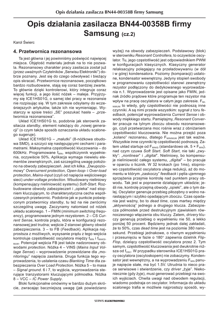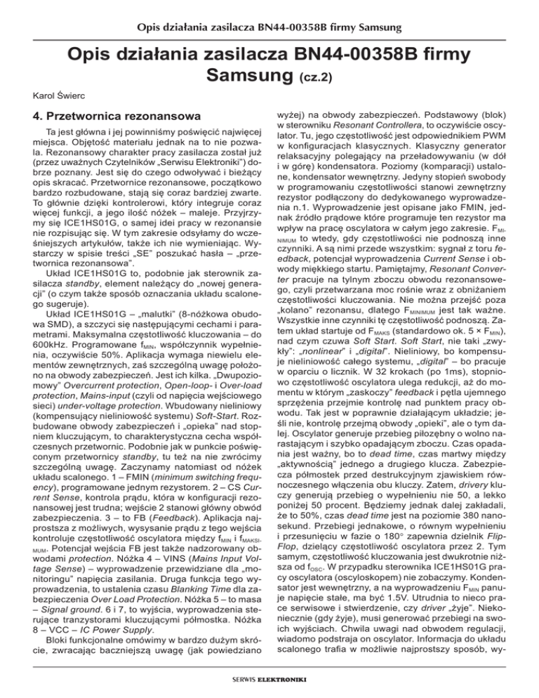 Opis działania zasilacza BN44-00358B firmy Samsung Opis działania zasilacza BN44-00358B firmy Samsung (cz.2) Karol Świerc 4. Przetwornica rezonansowa Ta jest główna i jej powinniśmy poświęcić najwięcej miejsca. Objętość materiału jednak na to nie pozwala. Rezonansowy charakter pracy zasilacza został już (przez uważnych Czytelników „Serwisu Elektroniki”) dobrze poznany. Jest się do czego odwoływać i bieżący opis skracać. Przetwornice rezonansowe, początkowo bardzo rozbudowane, stają się coraz bardziej zwarte. To głównie dzięki kontrolerowi, który integruje coraz więcej funkcji, a jego ilość nóżek – maleje. Przyjrzymy się ICE1HS01G, o samej idei pracy w rezonansie nie rozpisując się. W tym zakresie odsyłamy do wcześniejszych artykułów, także ich nie wymieniając. Wystarczy w spisie treści „SE” poszukać hasła – „przetwornica rezonansowa”. Układ ICE1HS01G to, podobnie jak sterownik zasilacza standby, element należący do „nowej generacji” (o czym także sposób oznaczania układu scalonego sugeruje). Układ ICE1HS01G – „malutki” (8-nóżkowa obudowa SMD), a szczyci się następującymi cechami i parametrami. Maksymalna częstotliwość kluczowania – do 600kHz. Programowane fMIN, współczynnik wypełnienia, oczywiście 50%. Aplikacja wymaga niewielu elementów zewnętrznych, zaś szczególną uwagę położono na obwody zabezpieczeń. Jest ich kilka. „Dwupoziomowy” Overcurrent protection, Open-loop- i Over-load protection, Mains-input (czyli od napięcia wejściowego sieci) under-voltage protection. Wbudowany nieliniowy (kompensujący nieliniowość systemu) Soft-Start. Rozbudowane obwody zabezpieczeń i „opieka” nad stopniem kluczującym, to charakterystyczna cecha współczesnych przetwornic. Podobnie jak w punkcie poświęconym przetwornicy standby, tu też na nie zwrócimy szczególną uwagę. Zaczynamy natomiast od nóżek układu scalonego. 1 – FMIN (minimum switching frequency), programowane jednym rezystorem. 2 – CS Current Sense, kontrola prądu, która w konfiguracji rezonansowej jest trudna; wejście 2 stanowi główny obwód zabezpieczenia. 3 – to FB (Feedback). Aplikacja najprostsza z możliwych, wysysanie prądu z tego wejścia kontroluje częstotliwość oscylatora między fMIN i fMAKSIMUM. Potencjał wejścia FB jest także nadzorowany obwodami protection. Nóżka 4 – VINS (Mains Input Voltage Sense) – wyprowadzenie przewidziane dla „monitoringu” napięcia zasilania. Druga funkcja tego wyprowadzenia, to ustalenia czasu Blanking Time dla zabezpieczenia Over Load Protection. Nóżka 5 – to masa – Signal ground. 6 i 7, to wyjścia, wyprowadzenia sterujące tranzystorami kluczującymi półmostka. Nóżka 8 – VCC – IC Power Supply. Bloki funkcjonalne omówimy w bardzo dużym skrócie, zwracając baczniejszą uwagę (jak powiedziano wyżej) na obwody zabezpieczeń. Podstawowy (blok) w sterowniku Resonant Controllera, to oczywiście oscylator. Tu, jego częstotliwość jest odpowiednikiem PWM w konfiguracjach klasycznych. Klasyczny generator relaksacyjny polegający na przeładowywaniu (w dół i w górę) kondensatora. Poziomy (komparacji) ustalone, kondensator wewnętrzny. Jedyny stopień swobody w programowaniu częstotliwości stanowi zewnętrzny rezystor podłączony do dedykowanego wyprowadzenia n.1. Wyprowadzenie jest opisane jako FMIN, jednak źródło prądowe które programuje ten rezystor ma wpływ na pracę oscylatora w całym jego zakresie. FMINIMUM to wtedy, gdy częstotliwości nie podnoszą inne czynniki. A są nimi przede wszystkim: sygnał z toru feedback, potencjał wyprowadzenia Current Sense i obwody miękkiego startu. Pamiętajmy, Resonant Converter pracuje na tylnym zboczu obwodu rezonansowego, czyli przetwarzana moc rośnie wraz z obniżaniem częstotliwości kluczowania. Nie można przejść poza „kolano” rezonansu, dlatego F MINIMUM jest tak ważne. Wszystkie inne czynniki tę częstotliwość podnoszą. Zatem układ startuje od FMAKS (standardowo ok. 5 × FMIN), nad czym czuwa Soft Start. Soft Start, nie taki „zwykły”: „nonlinear” i „digital”. Nieliniowy, bo kompensuje nieliniowość całego systemu, „digital” – bo pracuje w oparciu o licznik. W 32 krokach (po 1ms), stopniowo częstotliwość oscylatora ulega redukcji, aż do momentu w którym „zaskoczy” feedback i pętla ujemnego sprzężenia przejmie kontrolę nad punktem pracy obwodu. Tak jest w poprawnie działającym układzie; jeśli nie, kontrolę przejmą obwody „opieki”, ale o tym dalej. Oscylator generuje przebieg piłozębny o wolno narastającym i szybko opadającym zboczu. Czas opadania jest ważny, bo to dead time, czas martwy między „aktywnością” jednego a drugiego klucza. Zabezpiecza półmostek przed destrukcyjnym zjawiskiem równoczesnego włączenia obu kluczy. Zatem, drivery kluczy generują przebieg o wypełnieniu nie 50, a lekko poniżej 50 procent. Będziemy jednak dalej zakładali, że to 50%, czas dead time jest na poziomie 380 nanosekund. Przebiegi jednakowe, o równym wypełnieniu i przesunięciu w fazie o 180° zapewnia dzielnik FlipFlop, dzielący częstotliwość oscylatora przez 2. Tym samym, częstotliwość kluczowania jest dwukrotnie niższa od fOSC. W przypadku sterownika ICE1HS01G pracy oscylatora (oscyloskopem) nie zobaczymy. Kondensator jest wewnętrzny, a na wyprowadzeniu FMIN panuje napięcie stałe, ma być 1.5V. Utrudnia to nieco prace serwisowe i stwierdzenie, czy driver „żyje”. Niekoniecznie (gdy żyje), musi generować przebiegi na swoich wyjściach. Chwila uwagi nad obwodem regulacji, wiadomo podstraja on oscylator. Informacja do układu scalonego trafia w możliwie najprostszy sposób, wy- SERWIS ELEKTRONIKI Opis działania zasilacza BN44-00358B firmy Samsung sysając prąd z wyprowadzenia FB, co daje szczególnie prostą aplikację, gdy elementem pośredniczącym jest transoptor. Kierunek regulacji: wyższe nap