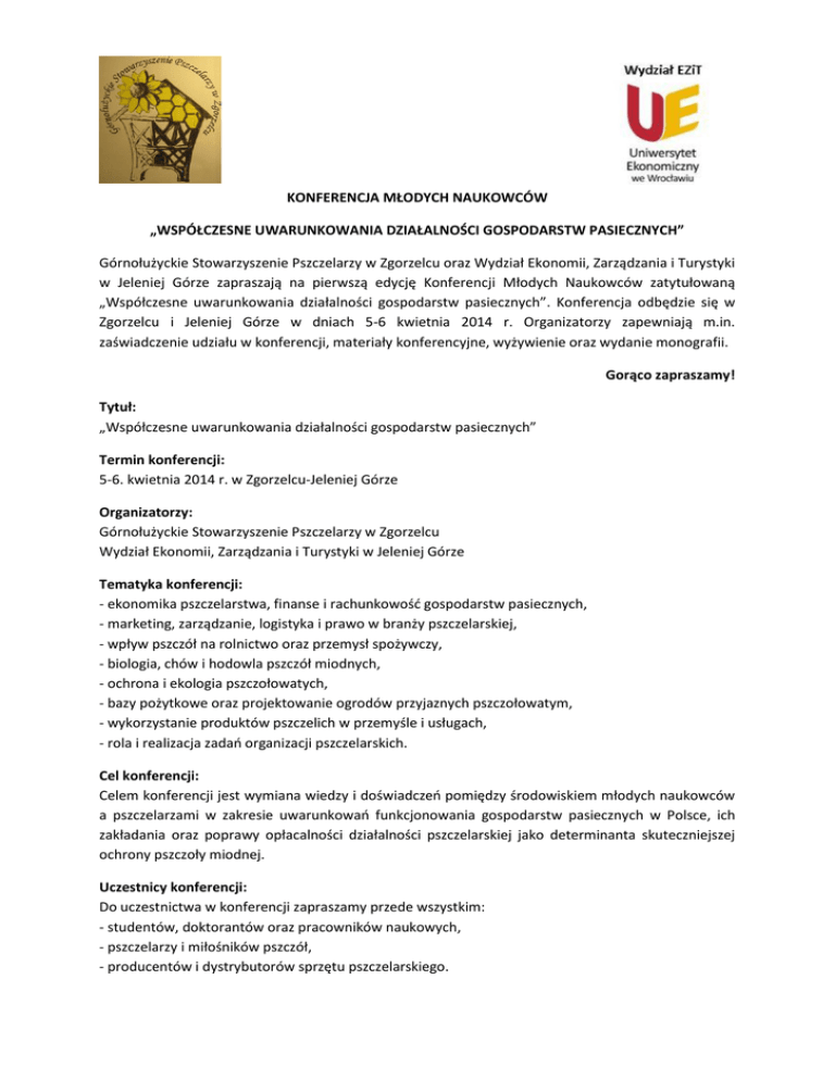KONFERENCJA MŁODYCH NAUKOWCÓW „WSPÓŁCZESNE UWARUNKOWANIA DZIAŁALNOŚCI GOSPODARSTW PASIECZNYCH” Górnołużyckie Stowarzyszenie Pszczelarzy w Zgorzelcu oraz Wydział Ekonomii, Zarządzania i Turystyki w Jeleniej Górze zapraszają na pierwszą edycję Konferencji Młodych Naukowców zatytułowaną „Współczesne uwarunkowania działalności gospodarstw pasiecznych”. Konferencja odbędzie się w Zgorzelcu i Jeleniej Górze w dniach 5-6 kwietnia 2014 r. Organizatorzy zapewniają m.in. zaświadczenie udziału w konferencji, materiały konferencyjne, wyżywienie oraz wydanie monografii. Gorąco zapraszamy! Tytuł: „Współczesne uwarunkowania działalności gospodarstw pasiecznych” Termin konferencji: 5-6. kwietnia 2014 r. w Zgorzelcu-Jeleniej Górze Organizatorzy: Górnołużyckie Stowarzyszenie Pszczelarzy w Zgorzelcu Wydział Ekonomii, Zarządzania i Turystyki w Jeleniej Górze Tematyka konferencji: - ekonomika pszczelarstwa, finanse i rachunkowość gospodarstw pasiecznych, - marketing, zarządzanie, logistyka i prawo w branży pszczelarskiej, - wpływ pszczół na rolnictwo oraz przemysł spożywczy, - biologia, chów i hodowla pszczół miodnych, - ochrona i ekologia pszczołowatych, - bazy pożytkowe oraz projektowanie ogrodów przyjaznych pszczołowatym, - wykorzystanie produktów pszczelich w przemyśle i usługach, - rola i realizacja zadań organizacji pszczelarskich. Cel konferencji: Celem konferencji jest wymiana wiedzy i doświadczeń pomiędzy środowiskiem młodych naukowców a pszczelarzami w zakresie uwarunkowań funkcjonowania gospodarstw pasiecznych w Polsce, ich zakładania oraz poprawy opłacalności działalności pszczelarskiej jako determinanta skuteczniejszej ochrony pszczoły miodnej. Uczestnicy konferencji: Do uczestnictwa w konferencji zapraszamy przede wszystkim: - studentów, doktorantów oraz pracowników naukowych, - pszczelarzy i miłośników pszczół, - producentów i dystrybutorów sprzętu pszczelarskiego. Ważne terminy: - 25 marca 2014 r. - przyjmowanie zgłoszeń, wpłat i abstraktów - 31 marca 2014 r. - ogłoszenie programu konferencji - 5-6 kwietnia 2014 r. - Konferencja Młodych Naukowców - 18 kwietnia 2014 r. - dostarczenie artykułu wraz z recenzją - lipiec-wrzesień 2014 r. - wydanie publikacji Zgłoszenie, potwierdzenie dokonania wpłaty oraz abstrakt należy przesłać na adres: [email protected] Korzyści z uczestnictwa w konferencji: - przyjazna atmosfera do wymiany własnych poglądów oraz wyników badań, - materiały konferencyjne, - wyżywienie, - wydanie monografii (wybór formy w gestii organizatorów: tradycyjna/e-book), - zaświadczenie udziału w konferencji, - nagrody za najlepsze wystąpienia, postery oraz niespodzianki dla prelegentów. Koszt udziału w konferencji: - udział z wystąpieniem lub posterem: 140zł - udział bierny (jako słuchacz): 120zł Opłata nie uwzględnia kosztów dojazdu i noclegu. Wpłat należy dokonywać na konto: Górnołużyckie Stowarzyszenie Pszczelarzy w Zgorzelcu ul. Warszawska 9/1, 59-900 Zgorzelec ING Bank Śląski 09 1050 1908 1000 0090 3013 9811 z dopiskiem: „Konferencja Młodych Naukowców” Dokumenty do pobrania: Formularz zgłoszeniowy Wymogi edytorskie Formularz recenzji Więcej szczegółów można znaleźć na stronie www.pszczelarstwo.zgorzelec.pl oraz www.PortalPszczelarski.pl. Zapraszamy także do dołączenia do wydarzenia na facebook’u: https://www.facebook.com/events/1397793890475095/.
