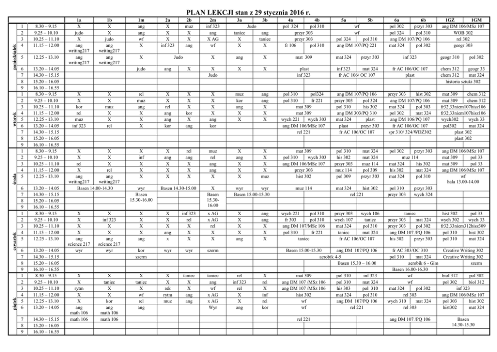 piątek czwartek środa wtorek poniedziałek PLAN LEKCJI stan z 29 stycznia 2016 r. 1 2 3 4 8.30 – 9.15 9.25 – 10.10 10.25 – 11.10 11.15 – 12.00 5 12.25 - 13.10 6 7 8 9 1 2 3 4 5 6 7 8 9 1 2 3 4 5 13.20 – 14.05 14.30 – 15.15 15.20 – 16.05 16.10 – 16.55 8.30 – 9.15 9.25 – 10.10 10.25 – 11.10 11.15 – 12.00 12.25 - 13.10 13.20 – 14.05 14.30 – 15.15 15.20 – 16.05 16.10 – 16.55 8.30 – 9.15 9.25 – 10.10 10.25 – 11.10 11.15 – 12.00 12.25 - 13.10 6 7 8 9 1 2 3 4 5 13.20 – 14.05 14.30 – 15.15 15.20 – 16.05 16.10 – 16.55 8.30 – 9.15 9.25 – 10.10 10.25 – 11.10 11.15 – 12.00 12.25 - 13.10 6 7 8 9 1 2 3 4 5 6 13.20 – 14.05 14.30 – 15.15 15.20 – 16.05 16.10 – 16.55 8.30 – 9.15 9.25 – 10.10 10.25 – 11.10 11.15 – 12.00 12.25 - 13.10 13.20 – 14.05 7 8 9 14.30 – 15.15 15.20 – 16.05 16.10 – 16.55 1a X judo X ang writing217 ang writing217 X X kor rel muz inf 323 1b X X judo ang writing217 ang writing217 X X muz X X rel X X X X rel X X rel ang ang writing217 writing217 Basen 14.00-14.30 X X X X ang science 217 wyr X inf 323 X X ang science 217 wyr X X rytm X X ang math 106 math 106 X taniec X X kor ang math 106 math 106 1m ang ang wf X 2a X X X inf 323 X 2b muz X X ang Judo 2m inf 323 ang X AG wf 3a 3b taniec X X ang taniec X 4a 4b pol 324 pol 310 przyr 303 przyr 303 fr 106 pol 310 X ang X mat 309 Judo 5a 5b wf wf pol 324 pol 310 ang DM 107/PQ 221 mat 324 przyr 303 6a 6b pol 302 przyr 303 pol 324 pol 310 ang DM 107/PQ 106 mat 324 pol 302 inf 323 1GŻ 1GM ang DM 106/MSz 107 WOB 302 rel 302 geogr 303 geogr 310 pol 302 judo ang X X Judo X X plast inf 323 inf 323 mat 324 fr AC 106/ OC 107 fr AC 106/OC 107 plast chem 312 geogr 33 chem 312 mat 324 historia sztuki 302 rel muz ang X X X X X rel ang ang kor X X X kor X ang X X X X ang kor muz kor ang X X ang ang X X X pol 310 pol324 pol 310 fr 221 mat 309 mat 309 wych 221 wych 303 ang DM 106/MSz 107 rel 221 ang DM 107/PQ 106 przyr 303 pol 324 pol 310 his 302 ang DM 303/PQ 310 mat 324 plast plast przyr 303 fr AC 106/OC 107 przyr 303 hist 302 ang DM 107/PQ 106 mat 324 pol 303 pol 302 mat 324 ang DM 106/PQ 107 fr AC 106/OC 107 spr 310/ 324/WDŻ302 mat 309 chem 312 mat 309 chem 312 fr32,33niem107hisz106 fr32,33niem107hisz106 wych302 wych 33 pol302 mat 324 plast 302 plast 302 X inf X X X X ang X X X rel ang X X X muz rel ang ang X X ang X X X X X X X muz mat 309 pol 310 wych 303 ang DM 106/MSz 107 przyr 303 hist 302 pol 310 his 302 przyr 303 muz 114 pol 309 pol 302 przyr 303 muz 114 mat 324 his 302 his 302 mat 324 mat 324 pol 310 ang DM 106/MSz 107 mat 309 pol 33 mat 309 pol 33 ang DM 106/MSz 107 wf hala 13.00-14.00 wyr Basen 15.30-16.00 Basen 14.30-15.00 X Basen 15.3016.00 X X X X ang X X X ang x inf 323 rel X X X x AG x AG rel X X kor szerm wyr wyr szerm X taniec X wf rel ang X X rek rytm muz taniec X X ang ang taniec ang wf x AG x AG Wyr wyr wyr Basen 15.00-15.30 X X X X ang ang ang X X X mat 324 mat 324 muz 114 pol 309 przyr 303 muz 114 mat 324 hist 302 rel 221 wych 221 pol 310 fr 303 pol 310 ang DM 107/MSz 106 pol 310 fr 221 taniec przyr 303 wych 106 wych 107 taniec mat 324 pol 310 taniec mat 324 fr AC 106/OC 107 Basen 15.00-15.30 ang DM 107/PQ 106 aerobik 4-5 Basen 15.30 – 16.00 rel inf 323 rel X X ang X rel X inf rel kor mat 309 ang DM 107 /MSz 106 ang DM 107 /MSz 106 hist 302 wf wf rel 221 pol 310 inf 323 pol 310 mat 324 his 303 pol 310 mat 324 pol 310 ang DM 107/PQ 106 rel 221 pol 310 przyr 303 przyr 303 wych 324 taniec przyr 303 mat 324 przyr 303 pol 302 ang DM 107 /PQ 106 his 302 przyr 303 fr AC 303/OC 310 pol 310 mat 324 aerobik 6 - Gim Basen 16.00-16.30 wf wf mat 324 pol 302 rel 303 wych 310 mat 324 rel 303 ang DM 107 /PQ 106 hist 302 pol 33 wych 302 wych 33 fr32,33niem312hisz309 pol 310 hist 302 pol 310 mat 324 Creative Writing 302 Creative Writing 302 szerm biol 312 pol 302 pol 302 biol 312 inf 323 ang DM 106/MSz 107 pol 303 hist 302 hist302 mat 324 Basen 14.30-15.30
