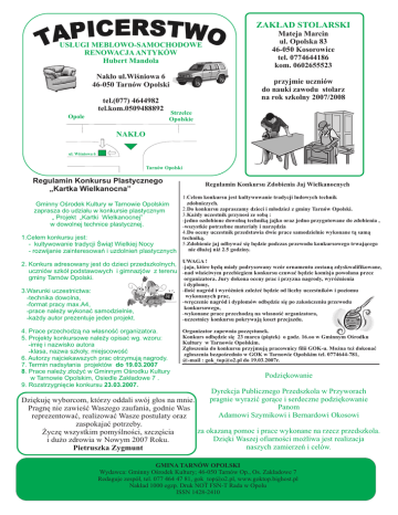 ZAK£AD STOLARSKI Mateja Marcin ul. Opolska 83 46-050 Kosorowice tel. 0774644186 kom. 0602655523 US£UGI MEBLOWO-SAMOCHODOWE RENOWACJA ANTYKÓW Hubert Mandola Nak³o ul.Wiœniowa 6 46-050 Tarnów Opolski tel.(077) 4644982 tel.kom.0509488892 Opole przyjmie uczniów do nauki zawodu stolarz na rok szkolny 2007/2008 Strzelce Opolskie NAK£O ul. Wiœniowa 6 Tarnów Opolski Regulamin Konkursu Plastycznego „Kartka Wielkanocna” Gminny Oœrodek Kultury w Tarnowie Opolskim zaprasza do udzia³u w konkursie plastycznym „ Projekt „Kartki Wielkanocnej” w dowolnej technice plastycznej. 1.Celem konkursu jest: - kultywowanie tradycji Œwi¹t Wielkiej Nocy - rozwijanie zainteresowañ i uzdolnieñ plastycznych Regulamin Konkursu Zdobienia Jaj Wielkanocnych 1.Celem konkursu jest kultywowanie tradycji ludowych technik zdobniczych. 2.Do konkursu zapraszamy dzieci i m³odzie¿ z gminy Tarnów Opolski. 3.Ka¿dy uczestnik przynosi ze sob¹ : -jedno ozdobione dowoln¹ technik¹ jajko oraz jedno przygotowane do zdobienia , -wszystkie potrzebne materia³y i narzêdzia 4.Do oceny uczestnik przedstawia dwie prace samodzielnie wykonane t¹ sam¹ technik¹. 5.Zdobienie jaj odbywaæ siê bêdzie podczas przewodu konkursowego trwaj¹cego nie d³u¿ej ni¿ 2.5 godziny. UWAGA ! 2. Konkurs adresowany jest do dzieci przedszkolnych, -jaja, które bêd¹ mia³y podrysowany wzór ornamentu zostan¹ zdyskwalifikowane, uczniów szkó³ podstawowych i gimnazjów z terenu -nad w³aœciwym przebiegiem konkursu czuwaæ bêdzie komisja powo³ana przez gminy Tarnów Opolski. organizatora. Jury dokona oceny prac i przyzna nagrody, wyró¿nienia 3.Warunki uczestnictwa: -technika dowolna, -format pracy max.A4, -prace nale¿y wykonaæ samodzielnie, -ka¿dy autor prezentuje jeden projekt. 4. Prace przechodz¹ na w³asnoœæ organizatora. 5. Projekty konkursowe nale¿y opisaæ wg. wzoru: -imiê i nazwisko autora -klasa, nazwa szko³y, miejscowoœæ 6. Autorzy najciekawszych prac otrzymuj¹ nagrody. 7. Termin nadsy³ania projektów do 19.03.2007 8. Prace nale¿y z³o¿yæ w Gminnym Oœrodku Kultury w Tarnowie Opolskim, Osiedle Zak³adowe 7 . 9. Rozstrzygniêcie konkursu 23.03.2007. i dyplomy, -iloœæ nagród i wyró¿nieñ zale¿eæ bêdzie od liczby uczestników i poziomu wykonanych prac, -wrêczenie nagród i dyplomów odbêdzie siê po zakoñczeniu przewodu konkursowego, -wykonane prace przechodz¹ na w³asnoœæ organizatora, -uczestnicy konkursu pokrywaj¹ koszt przejazdu. Organizator zapewnia poczêstunek. Konkurs odbêdzie siê 23 marca (pi¹tek) o godz. 16.oo w Gminnym Oœrodku Kultury w Tarnowie Opolskim. Zg³oszenia do konkursu przyjmuj¹ pracownicy filii GOK-u. Mo¿na te¿ dokonaæ zg³oszenia bezpoœrednio w GOK w Tarnowie Opolskim tel. 0774644-781, @-mail : [email protected] do 19.03.2007r. Podziêkowanie Dyrekcja Publicznego Przedszkola w Przyworach pragnie wyraziæ gor¹ce i serdeczne podziêkowanie Panom Adamowi Szymikowi i Bernardowi Okosowi Dziêkujê wyborcom, którzy oddali swój g³os na mnie. Pragnê nie zawieœæ Waszego zaufania, godnie Was reprezentowaæ, realizowaæ Wasze postulaty oraz zaspokajaæ potrzeby. za okazan¹ pomoc i prace wykonane na rzecz przedszkola. ¯yczê wszystkim pomyœlnoœci, szczêœcia Dziêki Waszej ofiarnoœci mo¿liwa jest realizacja i du¿o zdrowia w Nowym 2007 Roku. naszych zamierzeñ i celów. Pietruszka Zygmunt GMINA TARNÓW OPOLSKI Wydawca: Gminny Oœrodek Kultury; 46-050 Tarnów Op., Os. Zak³adowe 7 Redaguje zespó³, tel. 077 464 47 81, [email protected], www.goktop.bighost.pl Nak³ad 1000 egzp. Druk NOT FSN-T Rada w Opolu ISSN 1428-2410