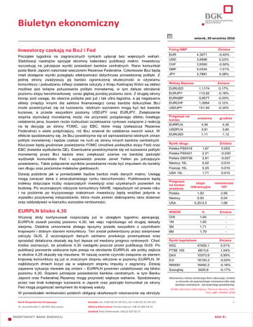 Biuletyn ekonomiczny wtorek, 20 września 2016 Inwestorzy czekają na BoJ i Fed Fixing NBP Początek tygodnia na zagranicznych rynkach upłynął bez większych wahań. Stabilizacji nastrojów sprzyjał skromny kalendarz publikacji makro. Inwestorzy wyczekują na jutrzejsze wyniki posiedzeń banków centralnych. Rano komunikat poda Bank Japonii natomiast wieczorem Rezerwa Federalna. Członkowie BoJ będą mieli dostępne wyniki przeglądu efektywności dotychczas prowadzonej polityki. Z jednej strony zważywszy jej bardzo ograniczoną skuteczność w ożywianiu koniunktury i pobudzaniu inflacji (ostatnie odczyty z Kraju Kwitnącej Wiśni są słabe) możliwe jest kolejne poluzowanie polityki monetarnej, w tym dalsze obniżenie poziomu stopy benchmarkowej coraz głębiej poniżej poziomu zera. Z drugiej strony biorąc pod uwagę, że obecna polityka jest już i tak ultra łagodna, a jej negatywne efekty (między innymi dla sektora finansowego) coraz bardzie dokuczliwe BoJ może powstrzymać się od luzowania. Istotnym wymiarem mogą być też kwestie kursowe, a przede wszystkim poziomy USDJPY oraz EURJPY. Zwiększenie stopnia stymulacji monetarnej może nie przynieść pożądanego efektu trwałego osłabienia jena, bowiem może rozbudzać oczekiwania rynkowe związane z reakcją na tę decyzję ze strony FOMC, czy EBC, które mają (zwłaszcza Rezerwa Federalna) o wiele potężniejszy, niż BoJ arsenał do osłabienia swoich walut. W efekcie spodziewamy się, że BoJ powstrzyma się od wprowadzania istotnych zmian polityki monetarnej i będzie czekać na ruch ze strony innych banków centralnych. Kluczowe będą grudniowe posiedzenia FOMC (możliwa podwyżka stopy Fed) oraz EBC (kwestia wydłużenia QE). Ewentualne powstrzymanie się od luzowania polityki monetarnej przez BoJ będzie wiec zwiększać szanse na bardziej jastrzębi wydźwięk komunikatu Fed i wypowiedzi prezes Janet Yellen po jutrzejszym posiedzeniu. Takie połączenie wyników posiedzenie może być impulsem do korekty cen długu oraz poziomów indeksów giełdowych. EUR 4,3071 USD 3,8586 0,23% CHF 3,9350 -0,50% GBP 5,0334 -1,01% JPY 3,7881 0,38% Dzisiaj podobnie jak w poniedziałek będzie bardzo mało danych makro. Uwagę mogą zwracać dane z amerykańskiego rynku nieruchomości. Publikowane będą indeksy dotyczące liczby rozpoczętych inwestycji oraz uzyskanych pozwoleń na budowę. Po wczorajszym odczycie koniunktury NAHB, najwyższym od prawie roku i na poziomie po kryzysowego maksimum inwestorzy będą wrażliwi jedynie w wypadku pozytywnej niespodzianki, która może pomóc słabnącemu rano dolarowi oraz oddziaływać w kierunku wzrostów rentowności. EURPLN blisko 4,30 Zmiana Waluty Bazowe Zmiana EURUSD 1,1174 0,17% EURJPY 113,92 -0,18% EURGBP 0,8577 -0,03% EURCHF 1,0954 0,12% USDJPY 101,94 -0,35% Prognoza na koniec EURPLN września grudnia 4,34 4,30 USDPLN 3,91 3,84 EURUSD 1,11 1,12 Rynki długu Zmiana Polska PS0418 1,67 0,003 Polska PS0421 2,21 -0,030 Polska DS0726 2,91 -0,027 Niemcy 10L 0,02 0,014 Francja 10L 0,25 0,015 USA 10L 1,71 0,012 Prognoza na koniec września Polska stopa referencyjna rentowność 10Y 1,50 2,95 0,00 0,04 0,25-0,5 1,68 Niemcy USA WIBOR Wczoraj złoty kontynuował rozpoczętą już w ubiegłym tygodniu aprecjację. EURPLN zszedł poniżej poziomu 4,30, tak więc najniższego od drugiej dekady sierpnia. Ostatnie umocnienie złotego łączymy przede wszystkim z czynnikami krajowymi i dobrym stanem koniunktury. Ten został potwierdzony przez sierpniowe odczyty GUS. Z wczorajszych danych zarówno produkcja przemysłowa oraz sprzedaż detaliczna okazały się być lepsze od mediany prognoz rynkowych. Choć trzeba zaznaczyć, że przebicie 4,30 nastąpiło jeszcze przed publikacją GUS. Po publikacji ponownie widoczna była presja na obniżenie EURPLN, ale próby zejścia w okolice 4,29 okazały się nieudane. W naszej ocenie czynniki związane ze stanem krajowej koniunktury są już w znacznym stopniu wliczone w poziomy EURPLN. W najbliższych dniach liczyć się w większym stopniu impulsy z zagranicy. Dzisiaj zapewne sytuacja niewiele się zmieni – EURPLN powinien ustabilizować się blisko poziomu 4,30. Dopiero jutrzejsze posiedzenia banków centralnych, w tym Banku Japonii oraz Federalnej Rezerwy mogą przynieść większe wahania. Spodziewany przez nas brak kolejnego luzowania w Japonii oraz jastrzębi komunikat ze strony Fed mogą pogarszać sentyment do krajowej waluty. W poniedziałek rentowności polskich obligacji skarbowych nieznacznie się obniżyły Bank Gospodarstwa Krajowego Kontakt: tel. (+48 22) 52-29-211, tel. (+48 22) 52-29-211 Al. Jerozolimskie 7, 00-955 Warszawa Główny Ekonomista Tomasz Kaczor +48 22 596 59 13 Analityk Piotr Dmitrowski +48 22 522 92 17 -0,40% % Zmiana O/N 1,64 - 1M 1,65 - 3M 1,71 - 6M 1,79 - Rynki kapitałowe Zmiana WIG 47405,1 0,51% FTSE 100 6813,6 1,54% DAX 10373,9 0,95% DJI 18120,2 -0,02% NIKKEI 16492,2 -0,16% Szanghaj 3020,8 -0,17% Notowania z końca ostatniego dnia roboczego, zmiana w stosunku do poprzedniego notowania (dla stóp banków centralnych - od ostatniego posiedzenia). Źródła informacji: Bloomberg, Thomson Reuters, PAP, GUS, NBP, NYMEX, GPW 1 Biuletyn ekonomiczny wtorek, 20 września 2016 zamiany (dziś popołudniu podane zostaną szczegóły dotyczące podaży), natomiast w piątek zaprezentowane będą wstępne odczyty wrześniowych indeksów PMI dla strefy euro. na środku i długim końcu krzywej. Natomiast te na krótkim końcu pozostały niezmienione. Wydaje się, że dobre odczyty GUS były już wcześniej wliczone w poziomy cen. Wczorajszy ruch dobrze pasuje do widocznej w ostatnich dniach stabilizacji rentowności 5 i 10-latek nieco poniżej lipcowego maksimum. W naszej ocenie również dzisiejszy dzień powinien upłynąć bez dużych wahań. Podobnie, jak w wypadku FX inwestorzy będą wyczekiwać na wyniki posiedzeń BoJ oraz FOMC i reakcje na rynkach bazowych. Ponadto trzeba zaznaczyć, że również dwa ostatnie dni