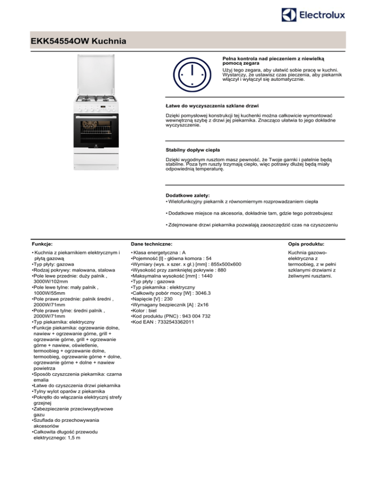 EKK54554OW Kuchnia Pełna kontrola nad pieczeniem z niewielką pomocą zegara Użyj tego zegara, aby ułatwić sobie pracę w kuchni. Wystarczy, że ustawisz czas pieczenia, aby piekarnik włączył i wyłączył się automatycznie. Łatwe do wyczyszczenia szklane drzwi Dzięki pomysłowej konstrukcji tej kuchenki można całkowicie wymontować wewnętrzną szybę z drzwi jej piekarnika. Znacząco ułatwia to jego dokładne wyczyszczenie. Stabilny dopływ ciepła Dzięki wygodnym rusztom masz pewność, że Twoje garnki i patelnie będą stabilne. Poza tym ruszty trzymają ciepło, więc potrawy dłużej będą miały odpowiednią temperaturę. Dodatkowe zalety: • Wielofunkcyjny piekarnik z równomiernym rozprowadzaniem ciepła • Dodatkowe miejsce na akcesoria, dokładnie tam, gdzie tego potrzebujesz • Zdejmowane drzwi piekarnika pozwalają zaoszczędzić czas na czyszczeniu Funkcje: Dane techniczne: Opis produktu: • Kuchnia z piekarnikiem elektrycznym i płytą gazową •Typ płyty: gazowa •Rodzaj pokrywy: malowana, stalowa •Pole lewe przednie: duży palnik , 3000W/102mm •Pole lewe tylne: mały palnik , 1000W/55mm •Pole prawe przednie: palnik średni , 2000W/71mm •Pole prawe tylne: średni palnik , 2000W/71mm •Typ piekarnika: elektryczny •Funkcje piekarnika: ogrzewanie dolne, nawiew + ogrzewanie górne, grill + ogrzewanie górne, grill + ogrzewanie górne + nawiew, oświetlenie, termoobieg + ogrzewanie dolne, termoobieg, ogrzewanie górne + dolne, ogrzewanie górne + dolne + nawiew powietrza •Sposób czyszczenia piekarnika: czarna emalia •Łatwe do czyszczenia drzwi piekarnika •Tylny wylot oparów z piekarnika •Pokrętło do włączania elektrycznj strefy grzejnej •Zabezpieczenie przeciwwypływowe gazu •Szuflada do przechowywania akcesoriów •Całkowita długość przewodu elektrycznego: 1,5 m • Klasa energetyczna : A •Pojemność [l] - główna komora : 54 •Wymiary (wys. x szer. x gł.) [mm] : 855x500x600 •Wysokość przy zamkniętej pokrywie : 880 •Maksymalna wysokość [mm] : 1440 •Typ płyty : gazowa •Typ piekarnika : elektryczny •Całkowity pobór mocy [W] : 3046.3 •Napięcie [V] : 230 •Wymagany bezpiecznik [A] : 2x16 •Kolor : biel •Kod produktu (PNC) : 943 004 732 •Kod EAN : 7332543362011 Kuchnia gazowoelektryczna z termoobieg, z w pełni szklanymi drzwiami z żeliwnymi rusztami.