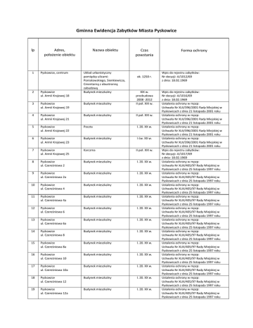 Gminna Ewidencja Zabytków Miasta Pyskowice lp Adres, położenie obiektu Nazwa obiektu Układ urbanistyczny pomiędzy ulicami: Poniatowskiego, Sienkiewicza, Cmentarną z obustronną zabudową Budynek mieszkalny Czas powstania 1 Pyskowice, centrum 2 Pyskowice ul. Armii Krajowej 18 3 Pyskowice ul. Armii Krajowej 19 Budynek mieszkalny XIX w. przebudowa 2008 -2012 II poł. XIX w. 4 Pyskowice ul. Armii Krajowej 21 Budynek mieszkalny II poł. XIX w. 5 Pyskowice ul. Armii Krajowej 22 Poczta l. 20. XX w. 6 Pyskowice ul. Armii Krajowej 23 Budynek mieszkalny I ćw. XX w. 7 Pyskowice ul. Armii Krajowej 25 Karczma II poł. XIX w. 8 Pyskowice ul. Czereśniowa 2 Budynek mieszkalny l. 20. XX w. 9 Pyskowice ul. Czereśniowa 2a Budynek mieszkalny l. 20. XX w. 10 Pyskowice ul. Czereśniowa 4 Budynek mieszkalny l. 20. XX w. 11 Pyskowice ul. Czereśniowa 4a Budynek mieszkalny l. 20. XX w. 12 Pyskowice ul. Czereśniowa 6 Budynek mieszkalny l. 20. XX w. 13 Pyskowice ul. Czereśniowa 6a Budynek mieszkalny l. 20. XX w. 14 Pyskowice ul. Czereśniowa 8 Budynek mieszkalny l. 20. XX w. 15 Pyskowice ul. Czereśniowa 8a Budynek mieszkalny l. 20. XX w. 16 Pyskowice ul. Czereśniowa 10 Budynek mieszkalny l. 20. XX w. 17 Pyskowice ul. Czereśniowa 10a Budynek mieszkalny l. 20. XX w. 18 Pyskowice ul. Czereśniowa 12 Budynek mieszkalny l. 20. XX w. 19 Pyskowice ul. Czereśniowa 12a Budynek mieszkalny l. 20. XX w. ok. 1250 r. Forma ochrony Wpis do rejestru zabytków: Nr decyzji: A/1012/69 z dnia: 18.02.1969 Wpis do rejestru zabytków: Nr decyzji: A/1016/69 z dnia: 18.02.1969 Ustalenia ochrony w mpzp: Uchwała Nr XLII/396/2001 Rady Miejskiej w Pyskowicach z dnia 21 listopada 2001 roku Ustalenia ochrony w mpzp: Uchwała Nr XLII/396/2001 Rady Miejskiej w Pyskowicach z dnia 21 listopada 2001 roku Ustalenia ochrony w mpzp: Uchwała Nr XLII/396/2001 Rady Miejskiej w Pyskowicach z dnia 21 listopada 2001 roku Ustalenia ochrony w mpzp: Uchwała Nr XLII/396/2001 Rady Miejskiej w Pyskowicach z dnia 21 listopada 2001 roku Wpis do rejestru zabytków: Nr decyzji: A/1017/69 z dnia: 18.02.1969 Ustalenia ochrony w mpzp: Uchwała Nr XLIII/405/97 Rady Miejskiej w Pyskowicach z dnia 25 listopada 1997 roku Ustalenia ochrony w mpzp: Uchwała Nr XLIII/405/97 Rady Miejskiej w Pyskowicach z dnia 25 listopada 1997 roku Ustalenia ochrony w mpzp: Uchwała Nr XLIII/405/97 Rady Miejskiej w Pyskowicach z dnia 25 listopada 1997 roku Ustalenia ochrony w mpzp: Uchwała Nr XLIII/405/97 Rady Miejskiej w Pyskowicach z dnia 25 listopada 1997 roku Ustalenia ochrony w mpzp: Uchwała Nr XLIII/405/97 Rady Miejskiej w Pyskowicach z dnia 25 listopada 1997 roku Ustalenia ochrony w mpzp: Uchwała Nr XLIII/405/97 Rady Miejskiej w Pyskowicach z dnia 25 listopada 1997 roku Ustalenia ochrony w mpzp: Uchwała Nr XLIII/405/97 Rady Miejskiej w Pyskowicach z dnia 25 listopada 1997 roku Ustalenia ochrony w mpzp: Uchwała Nr XLIII/405/97 Rady Miejskiej w Pyskowicach z dnia 25 listopada 1997 roku Ustalenia ochrony w mpzp: Uchwała Nr XLIII/405/97 Rady Miejskiej w Pyskowicach z dnia 25 listopada 1997 roku Ustalenia ochrony w mpzp: Uchwała Nr XLIII/405/97 Rady Miejskiej w Pyskowicach z dnia 25 listopada 1997 roku Ustalenia ochrony w mpzp: Uchwała Nr XLIII/405/97 Rady Miejskiej w Pyskowicach z dnia 25 listopada 1997 roku Ustalenia ochrony w mpzp: Uchwała Nr XLIII/405/97 Rady Miejskiej w Pyskowicach z dnia 25 listopada 1997 roku 20 Pyskowice ul. Czereśniowa 14 Budynek mieszkalny l. 20. XX w. 21 Pyskowice ul. Czereśniowa 14a Budynek mieszkalny l. 20. XX w. 22 Pyskowice ul. Czereśniowa 16 Budynek mieszkalny l. 20. XX w. 23 Pyskowice ul. Czereśniowa 16a Budynek mieszkalny l. 20. XX w. 24 Pyskowice ul. Czereśniowa 18 Budynek mieszkalny l. 20. XX w. 25 Pyskowice ul. Czereśniowa 18a Budynek mieszkalny l. 20. XX w. 26 Pyskowice ul. Czereśniowa 20 Budynek mieszkalny l. 20. XX w. 27 Pyskowice ul. Czereśniowa 20a Budynek mieszkalny l. 20. XX w. 28 Pyskowice ul. Górnicza 1 Budynek mieszkalny I poł. XIX w. 29 Pyskowice ul. Górnicza 2 Budynek mieszkalny I poł. XIX w. 30 Pyskowice ul. Górnicza 4 Budynek mieszkalny z oficynami I poł. XIX w. 31 Pyskowice ul. Górnicza 6 Budynek mieszkalny I poł. XIX w. 32 Pyskowice ul. Górnicza 7 Budynek mieszkalny I poł. XIX w. 33 Pyskowice ul. Górnicza 17 Budynek mieszkalny 34 Pyskowice ul. Hutnicza 1 Budynek mieszkalny z dwiema oficynami I poł. XIX w. przebudowany II poł. XX w I poł. XIX w. 35 Pyskowice ul. Hutnicza 2 Budynek mieszkalny I poł. XIX w. 36 Pyskowice ul. Hutnicza 5 Budynek mieszkalny I poł. XIX w. 37 Pyskowice ul. Hutnicza 6 Budynek mieszkalny I poł. XIX w. 38 Pyskowice ul. Hutnicza 7 I poł. XIX w. 39 Pyskowice ul. Hutnicza 8 Budynek gospodarczy – magazyn, ob. budynek mieszkalny Budynek mieszkalny 40 Pyskowice ul. Hutnicza 11 Budynek mieszkalny d. oficyna budynku Rynek 13 poł. XIX w. 41 Pyskowice ul. Kolonia Pyskowicka 1 Budynek mieszkalny l. 20. XX w. 42 Pyskowice ul. Kolonia Pyskowicka 2 Budynek mieszkalny l. 20. XX w. I poł. XIX w. Ustalenia ochrony w mpzp: Uchwała Nr XLIII/405/97 Rady Miejskiej w Pyskowicach z dnia 25 listopada 1997 roku Ustalenia ochrony w mpzp: Uchwała Nr XLIII/405/97 Rady Miejskiej w Pyskowicach z dnia 25 listopada 1997 roku Ustalenia ochrony w mpzp: Uchwała Nr XLIII/405/97 Rady Miejskiej w Pyskowicach z dnia 25 listopada 1997 roku Ustalenia ochrony w mpzp: Uchwała Nr XLIII/405/97 Rady Miejskiej w Pyskowicach z dnia 25 listopada 1997 roku Ustalenia ochrony w mpzp: Uchwała Nr XLIII/405/97 Rady Miejskiej w Pyskowicach z dnia 25 listopada 1997 roku Ustalenia ochrony w mpzp: Uchwała Nr XLIII/405/97 Rady Miejskiej w Pyskowicach z dnia 25 listopada 1997 roku Ustalenia ochrony w mpzp: Uchwała Nr XLIII/405/97 Rady Miejskiej w Pyskowicach z dnia 25 listopada 1997 roku Ustalenia ochrony w mpzp: Uchwała Nr XLIII/405/97 Rady Miejskiej w Pyskowicach z dnia 25 listopada 1997 roku Wpis do rejestru zabytków: Nr decyzji: A/1021/69 z dnia: 24.02.1969 Wpis do rejestru zabytków: Nr decyzji: A/1022/69 z 