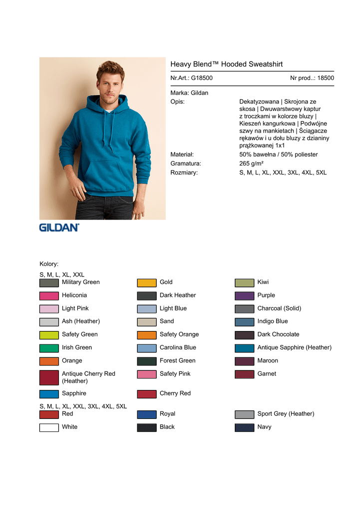 Heavy Blend™ Hooded Sweatshirt Nr.Art.: G18500 Marka: Gildan Opis: Materiał: Gramatura: Rozmiary: Nr prod..: 18500 Dekatyzowana | Skrojona ze skosa | Dwuwarstwowy kaptur z troczkami w kolorze bluzy | Kieszeń kangurkowa | Podwójne szwy na mankietach | Ściągacze rękawów i u dołu bluzy z dzianiny prążkowanej 1x1 50% bawełna / 50% poliester 265 g/m² S, M, L, XL, XXL, 3XL, 4XL, 5XL Kolory: S, M, L, XL, XXL Military Green Gold Kiwi Heliconia Dark Heather Purple Light Pink Light Blue Charcoal (Solid) Ash (Heather) Sand Indigo Blue Safety Green Safety Orange Dark Chocolate Irish Green Carolina Blue Antique Sapphire (Heather) Orange Forest Green Maroon Antique Cherry Red (Heather) Safety Pink Garnet Sapphire Cherry Red S, M, L, XL, XXL, 3XL, 4XL, 5XL Red White Royal Sport Grey (Heather) Black Navy