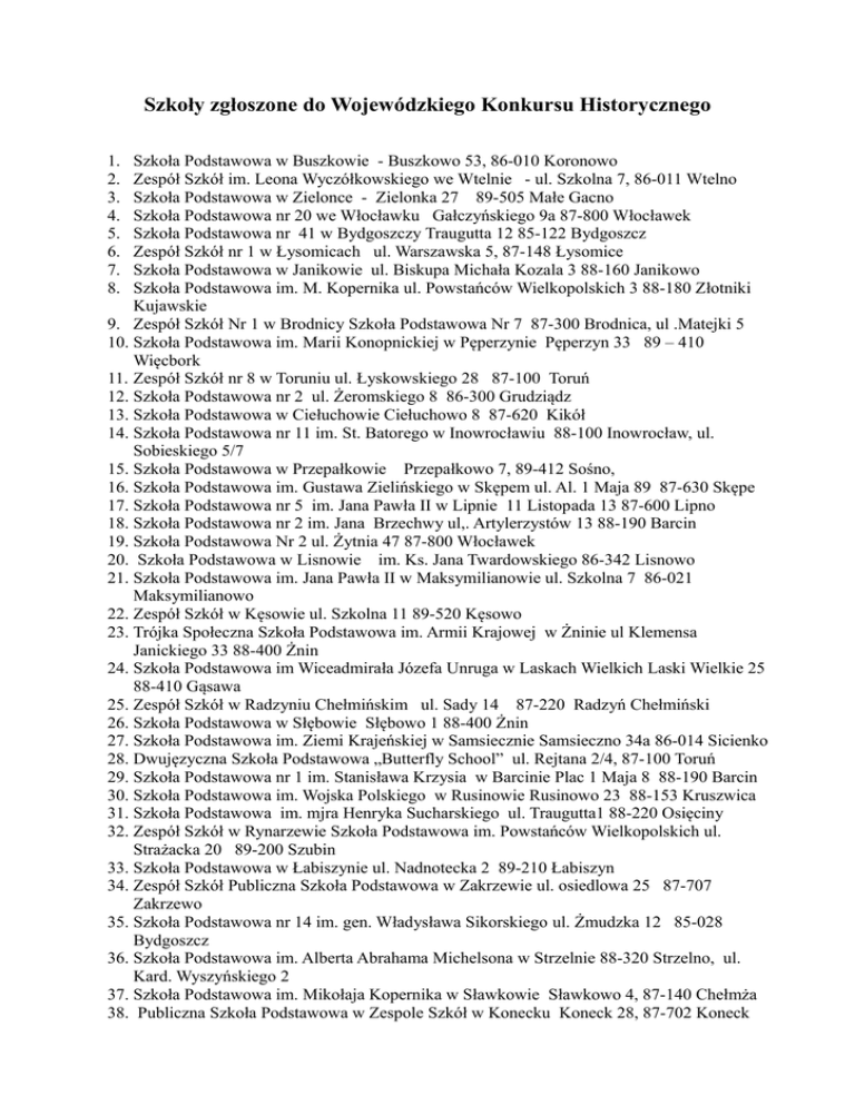 Szkoły zgłoszone do Wojewódzkiego Konkursu Historycznego 1. 2. 3. 4. 5. 6. 7. 8. Szkoła Podstawowa w Buszkowie - Buszkowo 53, 86-010 Koronowo Zespół Szkół im. Leona Wyczółkowskiego we Wtelnie - ul. Szkolna 7, 86-011 Wtelno Szkoła Podstawowa w Zielonce - Zielonka 27 89-505 Małe Gacno Szkoła Podstawowa nr 20 we Włocławku Gałczyńskiego 9a 87-800 Włocławek Szkoła Podstawowa nr 41 w Bydgoszczy Traugutta 12 85-122 Bydgoszcz Zespół Szkół nr 1 w Łysomicach ul. Warszawska 5, 87-148 Łysomice Szkoła Podstawowa w Janikowie ul. Biskupa Michała Kozala 3 88-160 Janikowo Szkoła Podstawowa im. M. Kopernika ul. Powstańców Wielkopolskich 3 88-180 Złotniki Kujawskie 9. Zespół Szkół Nr 1 w Brodnicy Szkoła Podstawowa Nr 7 87-300 Brodnica, ul .Matejki 5 10. Szkoła Podstawowa im. Marii Konopnickiej w Pęperzynie Pęperzyn 33 89 – 410 Więcbork 11. Zespół Szkół nr 8 w Toruniu ul. Łyskowskiego 28 87-100 Toruń 12. Szkoła Podstawowa nr 2 ul. Żeromskiego 8 86-300 Grudziądz 13. Szkoła Podstawowa w Ciełuchowie Ciełuchowo 8 87-620 Kikół 14. Szkoła Podstawowa nr 11 im. St. Batorego w Inowrocławiu 88-100 Inowrocław, ul. Sobieskiego 5/7 15. Szkoła Podstawowa w Przepałkowie Przepałkowo 7, 89-412 Sośno, 16. Szkoła Podstawowa im. Gustawa Zielińskiego w Skępem ul. Al. 1 Maja 89 87-630 Skępe 17. Szkoła Podstawowa nr 5 im. Jana Pawła II w Lipnie 11 Listopada 13 87-600 Lipno 18. Szkoła Podstawowa nr 2 im. Jana Brzechwy ul,. Artylerzystów 13 88-190 Barcin 19. Szkoła Podstawowa Nr 2 ul. Żytnia 47 87-800 Włocławek 20. Szkoła Podstawowa w Lisnowie im. Ks. Jana Twardowskiego 86-342 Lisnowo 21. Szkoła Podstawowa im. Jana Pawła II w Maksymilianowie ul. Szkolna 7 86-021 Maksymilianowo 22. Zespół Szkół w Kęsowie ul. Szkolna 11 89-520 Kęsowo 23. Trójka Społeczna Szkoła Podstawowa im. Armii Krajowej w Żninie ul Klemensa Janickiego 33 88-400 Żnin 24. Szkoła Podstawowa im Wiceadmirała Józefa Unruga w Laskach Wielkich Laski Wielkie 25 88-410 Gąsawa 25. Zespół Szkół w Radzyniu Chełmińskim ul. Sady 14 87-220 Radzyń Chełmiński 26. Szkoła Podstawowa w Słębowie Słębowo 1 88-400 Żnin 27. Szkoła Podstawowa im. Ziemi Krajeńskiej w Samsiecznie Samsieczno 34a 86-014 Sicienko 28. Dwujęzyczna Szkoła Podstawowa „Butterfly School” ul. Rejtana 2/4, 87-100 Toruń 29. Szkoła Podstawowa nr 1 im. Stanisława Krzysia w Barcinie Plac 1 Maja 8 88-190 Barcin 30. Szkoła Podstawowa im. Wojska Polskiego w Rusinowie Rusinowo 23 88-153 Kruszwica 31. Szkoła Podstawowa im. mjra Henryka Sucharskiego ul. Traugutta1 88-220 Osięciny 32. Zespół Szkół w Rynarzewie Szkoła Podstawowa im. Powstańców Wielkopolskich ul. Strażacka 20 89-200 Szubin 33. Szkoła Podstawowa w Łabiszynie ul. Nadnotecka 2 89-210 Łabiszyn 34. Zespół Szkół Publiczna Szkoła Podstawowa w Zakrzewie ul. osiedlowa 25 87-707 Zakrzewo 35. Szkoła Podstawowa nr 14 im. gen. Władysława Sikorskiego ul. Żmudzka 12 85-028 Bydgoszcz 36. Szkoła Podstawowa im. Alberta Abrahama Michelsona w Strzelnie 88-320 Strzelno, ul. Kard. Wyszyńskiego 2 37. Szkoła Podstawowa im. Mikołaja Kopernika w Sławkowie Sławkowo 4, 87-140 Chełmża 38. Publiczna Szkoła Podstawowa w Zespole Szkół w Konecku Koneck 28, 87-702 Koneck 39. Szkoła Podstawowa w Bursztynowie Bursztynowo 4 86-341 Świecie nad Osą 40. Szkoła Podstawowa w Słębowie Słębowo 1 88-400 Żnin 41. Szkoła Podstawowa im. Bohaterów Września 1939 roku Świętosław 87 – 408 Ciechocin 42. Szkoła Podstawowa im. Klemensa Janickiego w Januszkowie Januszkowo 20 88-400 Żnin 43. Szkoła Podstawowa nr 16 im. Mariana Turwida Koronowska 74 85 – 405 Bydgoszcz 44. Szkoła Podstawowa im . Jana Kochanowskiego w Wylatowie Wylatowo 29, 88-342 Wylatowo 45. Zespół Szkolno -Przedszkolny Szkoła Podstawowa w Bądkowie ul. Włocławska 13 87-704 Bądkowo 46. Szkoła Podstawowa im. Marii Konopnickiej Zamarte ul.Klasztorna 1, 89-430 Kamień Krajeński 47. Szkoła Podstawowa im. Władysława Broniewskiego w Iwcu 89-512 Iwiec 48. Szkoła Podstawowa w Płowężu Płowęż 16, 87-330 Jabłonowo Pomorskie 49. Szkoła Podstawowa nr 34 im. Tony’ego Halika ul. Włocławska 237/239 87-100 Toruń 50. Szkołą Podstawowa nr 4 im. Wojska Polskiego w Chełmnie os. Skłodowskiej 16 86-200 Chełmno 51. Szkoła Podstawowa im. J. Verne’a ul. Centralna 27 86-005 Białe Błota 52. Katolicka Szkoła Podstawowa im. Bł.Ks.Wł.Demskiego Wojska Polskiego 20 88-100 Inowrocław 53. Szkoła Podstawowa w Nieżywięciu 87-326 Nieżywięć 234 54. Szkoła Podstawowa im. Jana Pawła II w Małej Nieszawce Mała Nieszawka ul. Toruńska 64 87- 103 Toruń 55. Szkoła Podstawowa nr 1w Szubinie im. Króla Władysława Jagiełły ul. Wyzwolenia 21 89-200 Szubin 56. Szkoła Podstawowa Towarzystwa Salezjańskiegoim. św. Dominika Savio w Toruniu ul. Storczykowa 66a 87-100 Toruń 57. Zespół Szkolno Przedszkolny Szkoły Podstawowej i Przedszkola Samorządowego im. I Armii Wojska Polskiego ul. Sępoleńska 3 89-430 Kamień Krajeński 58. Szkoła Podstawowa im. Józefa Sołtykiewicza w Węgiersku Węgiersk 95 87-400 Golub Dobrzyń 59. Publiczna Szkoła Podstawowa Nr 3 ul. Szkolna 6 87-700 Aleksandrów Kujawski 60. Szkoła Podstawowa im. Stanisława Staszica w Wąpielsku Wąpielsk 114, 87-337 Wąpielsk 61. Zespół Szkół nr 28 w Toruniu Szkoła Podstawowa nr 28 im. prof. Henryka Arctowskiego ul. Przy Skarpie 13 87-100 Toruń 62. Szkoła Podstawowa nr 19 przy Zespole Szkół nr 17 ul. Kapliczna 7 85-775 Bydgoszcz 63. Zespół Szkół Miejskich w Golubiu-Dobrzyniu ul. Żeromskiego 11 Dobrzyń 87-400 Golub 64. Szkoła Podstawowa nr 17 w Toruniu 87-100 Toruń, ul. Rudacka 26-32 65. Zespół Szkół nr 15 Mistrzostwa Sportowego ul. Czerkaska 8 85-641 Bydgoszcz 66. Zespół Szkół i Placówek nr 1 Szkoła Podstawowa nr 62 Stawowa 53 85-323 Bydgoszcz 67. Szkoła Podstawowa im. Marii Konopnickiej w Nowej Wsi 43 86-302 Nowa Wieś Nowa Wieś, ul. Grudziądzka 68. Szkoła Podstawowa nr 2 ul. He