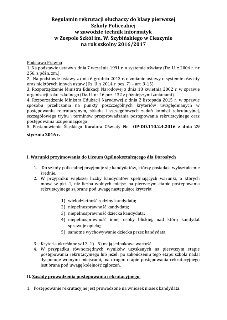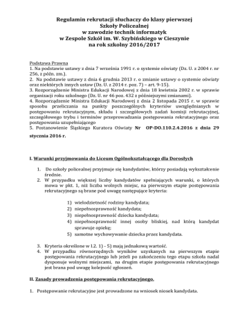Regulaminrekrutacjisłuchaczydoklasypierwszej SzkołyPolicealnej wzawodzietechnikinformatyk wZespoleSzkółim.W.SzybińskiegowCieszynie narokszkolny2016/2017 PodstawaPrawna 1.Napodstawieustawyzdnia7września1991r.osystemieoświaty(Dz.U.z2004r.nr 256,zpóźn.zm.). 2.Napodstawieustawyzdnia6grudnia2013r.ozmianieustawyosystemieoświaty orazniektórychinnychustaw(Dz.U.z2014r.poz.7)–art.9-15). 3. Rozporządzenie Ministra Edukacji Narodowej z dnia 18 kwietnia 2002 r. w sprawie organizacjirokuszkolnego(Dz.U.nr46poz.432zpóźniejszymizmianami). 4. Rozporządzenie Ministra Edukacji Narodowej z dnia 2 listopada 2015 r. w sprawie sposobu przeliczania na punkty poszczególnych kryteriów uwzględnianych w postępowaniu rekrutacyjnym, składu i szczegółowych zadań komisji rekrutacyjnej, szczegółowego trybu i terminów przeprowadzania postępowania rekrutacyjnego oraz postępowaniauzupełniającego 5. Postanowienie Śląskiego Kuratora Oświaty Nr OP-DO.110.2.4.2016 z dnia 29 stycznia2016r. I.WarunkiprzyjmowaniadoLiceumOgólnokształcącegodlaDorosłych 1. Doszkołypolicealnejprzyjmujesiękandydatów,którzyposiadająwykształcenie średnie. 2. W przypadku większej liczby kandydatów spełniających warunki, o których mowa w pkt. 1, niż liczba wolnych miejsc, na pierwszym etapie postępowania rekrutacyjnegosąbranepoduwagęnastępującekryteria: 1) 2) 3) 4) wielodzietnośćrodzinykandydata; niepełnosprawnośćkandydata; niepełnosprawnośćdzieckakandydata; niepełnosprawność innej osoby bliskiej, nad którą kandydat sprawujeopiekę; 5) samotnewychowywaniedzieckaprzezkandydata. 3. KryteriaokreślonewI.2.1)-5)mająjednakowąwartość. 4. W przypadku równorzędnych wyników uzyskanych na pierwszym etapie postępowania rekrutacyjnego lubjeżeli po zakończeniu tego etapu szkoła nadal dysponuje wolnymi miejscami, na drugim etapie postępowania rekrutacyjnego jestbranapoduwagękolejnośćzgłoszeń. II.Zasadyprowadzeniapostępowaniarekrutacyjnego. 1. Postępowanierekrutacyjnejestprowadzonenawniosekniosekkandydata. 2. WniosekoprzyjęciedoSzkołyPolicealnej(dalejWniosek)powinienzawierać: 1) imię, nazwisko, datę urodzenia oraz numer PESEL kandydata, a w przypadku braku numeru PESEL – serię i numer paszportu lub innego dokumentupotwierdzającegotożsamość; 2) imionarodziców,adresmiejscazamieszkaniakandydata; 3) adrespocztyelektronicznejinumertelefonukandydata,oilejeposiada; 3. Downioskunależydołączyć: 1) oryginałświadectwaukończeniaszkołyśredniej 2) 2fotografie–podpisane(imięinazwisko) 3) zaświadczenielekarskieobrakuprzeciwwskazańzdrowotnychdo kształceniawokreślonymzawodzie 4) dokumentypotwierdzającespełnianieprzezkandydatakryteriówo którychmowawpktI.2(składanetylkowtedy,gdymamiejscepierwszyetap postępowaniarekrutacyjnego). 4. Świadectwo ukończenia szkoły średniej może być złożone w postaci kopii poświadczanej za zgodność z oryginałem przez dyrektora szkoły, którą kandydat ukończył. 5. Oświadczenia o wielodzietności rodziny kandydata, składa się pod rygorem odpowiedzialnościkarnejzaskładaniefałszywychzeznań.Składającyoświadczenie jest obowiązany do zawarcia w nim klauzuli następującej treści: „Jestem świadomy odpowiedzialności karnej za złożenie fałszywego oświadczenia.”. Klauzula ta zastępuje pouczenie organu o odpowiedzialności karnej za składanie fałszywych zeznań. 6. Przewodniczący komisji rekrutacyjnej może żądać dokumentów potwierdzających okoliczności zawarte w oświadczeniach, w terminie wyznaczonym przez przewodniczącego, lub może zwrócić się do wójta (burmistrza, prezydenta miasta) właściwego ze względu na miejsce zamieszkania kandydata o potwierdzenie tych okoliczności. 7. WniosekwrazzdokumentaminależyzłożyćwSekretariacieszkoływterminieod6 do21czerwca2016r. 8. W przypadku liczby kandydatów mniejszej niż 40 oddział może nie zostać otwarty. III.Harmonogramczynnościwpostępowaniurekrutacyjnymipostępowaniu uzupełniającymnasemestrpierwszySzkołyPolicealnej. Lp. Rodzajczynności 1 Terminw terminwpostępowaniu postępowaniu uzupełniającym rekrutacyjnym Złożeniewnioskuoprzyjęcie Od6czerwca Do19lipca2016r. doszkołypolicealnejwraz do21czerwca2016r. zdokumentami 2 3 potwierdzającymispełnianie przezkandydatawarunków lubkryteriówbranychpod uwagęwpostępowaniu rekrutacyjnym Weryfikacjaprzezkomisję Do24czerwca2016 rekrutacyjnąwniosków r. oprzyjęciedoszkoły policealnejidokumentów potwierdzającychspełnienie przezkandydatawarunków lubkryteriówbranychpod uwagęwpostępowaniu rekrutacyjnym(wtym ewentualnepozyskanie przezprzewodniczącego komisjidokumentów,o którychmowawart.20tust 7ustawy) art.20tust7ustawy- Przewodniczącykomisji rekrutacyjnejmożeżądać dokumentów potwierdzających okolicznościzawartew oświadczeniach,októrych mowawust.2,wterminie wyznaczonymprzez przewodniczącego,lubmoże zwrócićsiędowójta (burmistrza,prezydenta miasta)właściwegoze względunamiejsce zamieszkaniakandydatao potwierdzenietych okoliczności.Wójt(burmistrz, prezydentmiasta) potwierdzateokolicznościw terminie14dni Podaniedopublicznej 11lipca2016r. wiadomościprzezkomisję rekrutacyjnąlisty kandydatów zakwalifikowanych ikandydatów niezakwalifikowanych Do21lipca2016r. 11sierpnia2016r. art.20zcust.6-9ustawy 6.Wterminie7dniod dniapodaniado publicznejwiadomości listykandydatów przyjętychikandydatów nieprzyjętych,rodzic kandydatalubkandydat pełnoletnimożewystąpić dokomisjirekrutacyjnejz wnioskiemosporządzenie uzasadnieniaodmowy przyjęciakandydatado danegopublicznego przedszkola,publicznej innejformywychowania przedszkolnego, publicznejszkoły, publicznejplacówki,na zajęciawpublicznej placówceoświatowowychowawczej,na kwalifikacyjnykurs zawodowylubna kształcenieustawicznew formachpozaszkolnych. 7.Uzasadnieniesporządza sięwterminie5dniod dniawystąpieniaprzez rodzicakandydatalub kandydatapełnoletniegoz wnioskiem,októrym mowawust.6. Uzasadnieniezawiera przyczynyodmowy