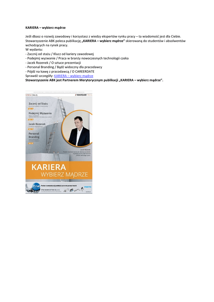 KARIERA – wybierz mądrze Jeśli dbasz o rozwój zawodowy i korzystasz z wiedzy ekspertów rynku pracy – ta wiadomość jest dla Ciebie. Stowarzyszenie ABK poleca publikację „KARIERA – wybierz mądrze” skierowaną do studentów i absolwentów wchodzących na rynek pracy. W wydaniu: - Zacznij od stażu / Klucz od kariery zawodowej - Podejmij wyzwanie / Praca w branży nowoczesnych technologii czeka - Jacek Rozenek / O sztuce prezentacji - Personal Branding / Bądź widoczny dla pracodawcy - Pójdź na kawę z pracodawcą / O CAREERDATE Sprawdź szczegóły: KARIERA – wybierz mądrze Stowarzyszenie ABK jest Partnerem Merytorycznym publikacji „KARIERA – wybierz mądrze”.