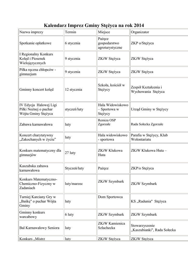 Kalendarz Imprez Gminy Stężyca na rok 2014 Nazwa imprezy Termin Miejsce Organizator Spotkanie opłatkowe 6 stycznia Pażęce gospodarstwo agroturystyczne ZKP o/Stężyca I Regionalny Konkurs Kolęd i Piosenek Wielojęzycznych 9 stycznia ZKiW Stężyca ZKiW Stężyca Piłka ręczna chłopców gimnazjum 9 stycznia ZKiW Stężyca ZKiW Stężyca Gminny koncert kolęd 12 stycznia Szkoła, kościół w Stężycy IV Edycja Halowej Ligi Piłki Nożnej o puchar Wójta Gminy Stężyca styczeń/luty Zabawa karnawałowa luty Koncert charytatywny „Zakochanych w życiu” luty Hala widowiskowo Parafia w Stężycy, Klub - sportowa Wolontariatu Konkurs matematyczny dla gimnazjów 27 luty ZKiW Klukowa Huta ZKiW Klukowa Huta – Kaszubska zabawa karnawałowa Styczeń/luty Pażęce ZKP/o Stężyca Konkurs MatematycznoChemiczno-Fizyczny w Zadaniach luty/marzec Zespół Kształcenia i Wychowania Stężyca Hala Widowiskowo – Sportowa w Urząd Gminy w Stężycy Stężycy Remiza OSP Zgorzałe ZKiW Szymbark Turniej Karciany Gry w „Baśkę" o puchar Wójta Gminy luty Gminny konkurs warcabowy 6 luty ZKiW Szymbark Bal Karnawałowy Seniora luty ZKiW Kamienica Szlachecka Konkurs „Mistrz luty ZKiW Stężyca Rada Sołecka Zgorzałe ZKiW Szymbark Dom Sportowca KS „Radunia" Stężyca ZKiW Szymbark Stowarzyszenie „Kaszubianki", Rada Sołecka ZKiW Stężyca Ortografii” dla uczniów klas IV-VI + gimnazjum Konkurs Recytatorski Poezji Polskiej marzec ZKiW Stężyca ZKiW Stężyca Centrum Edukacji, Promocji Regionu w Szymbarku, Kaszubsko –Kociewskie Stowarzyszenie im. Tajnej Organizacji Wojskowej „Gryf Pomorski” Gmina Stężyca „Gryf Pomorski" obchody rocznicy śmierci porucznika marzec Józefa Dambka Szymbark CEPR Turniej Wiedzy Pożarniczej marzec ZKiW Stężyca ZKiW Stężyca Konkurs Recytatorski Poezji Polskiej marzec ZKiW Stężyca ZKiW Stężyca Konkurs Języka Angielskiego klasy IV-VI marzec ZKiW Szymbark ZKiW Szymbark Konkurs Języka marzec Angielskiego w Gimnazjum ZKiW Szymbark Konkurs Ortograficzny dla klas III Szkół Podstawowych marzec ZKiW Stężyca Konkurs matematyczno – chemiczny – fizyczny w zadaniach 6 marzec ZKiW Szymbark Gminny Konkurs Prozy i Poezji Kaszubskiej „Rodnô Mòwa" marzec Gminna Biblioteka Publiczna w Stężycy Siatkówka dziewczyny i chłopcy - gimnazjum marzec ZKiW Stężyca ZkiW Stężyca Gminny Turniej Wiedzy Ekologicznej dla Szkół Podstawowych 9 kwietnia ZKiW Gołubie Zespół Kształcenia i Wychowania w Gołubiu Gminny Przegląd Scenek Profilaktycznych 28 marzec ZKiW Kamienica Szlachecka ZKiW Kamienica Szlachecka XIII edycja turnieju „Z podwórka na stadion o Marzec-maj Stadion w Stężycy ZKiW Stężyca ZKiW Szymbark ZKiW Stężyca ZKiW Szymbark GBP w Stężyca, ZKP o/Stężyca, ZKiW Stężyca Puchar Tymbarku” XVIII turniej im. Marka Wielgusa Marzec-maj Stadion w Stężycy ZKiW Stężyca Klub wolontariatu Apostolstwa Młodych, Wolontariat 50+, Parafie z terenu z gminy: Gołubia, Szymbark, Klukowa Huta, Wygoda. „Żonkil" kwiecień Teren parafii w Stężycy Rajd rowerowy kwiecień Teren Gminy Klub Wolontariatu, Parafia w Stężycy Gminny Konkurs Informatyczny „INTERNADA” 30 kwietnia ZKiW Klukowa Huta ZKiW Klukowa Huta Dzień Flagi 2 maja Gmina Stężyca Kaszubski Park Krajobrazowy ZKP o/Stężyca Gminne uroczystości Święta 3 Maja 3 maja Kościół w Stężycy ZKiW Stężyca, Urząd Gminy Stężyca Majówka Pomorskich Przedsiębiorców 10 maja Koncert zespołu Mazowsze Szymbark CEPR Hala widowiskowo Gdański Związek Pracodawców, – sportowa w LOT „Szczyt Wieżyca”, Centrum Stężycy Edukacji i Promocji Regionu w Szymbarku Gminny konkurs Matematyczny dla gimnazjów 14 maja Szkolny Dzień Kaszubski połączony z uroczystym wręczeniem zasłużonym Kaszubom Ryngrafów Witosława 14 maja ZKiW Kamienica Szlachecka ZKiW Kamienica Szlachecka Spotkanie autorskie dla dorosłych i dla dzieci maja Gminna Biblioteka w Stężycy Gminna Biblioteka w Stężycy ZKiW Kamienica Szlachecka ZKiW Kamienica Szlachecka - Magdalena Byczkowska, Teresa Wejer Powiatowy Konkurs Piosenki Kaszubskiej 13 maj Turniej piłki nożnej o Puchar Prezesa KS Radunia dla juniorów maj ZKiW Klukowa Huta Stadion w Stężycy ZKiW Klukowa Huta KS „Radunia” Stężyca Konkurs matematyczny klasa V-VI 16 maja ZKiW Szymbark ZKiW Szymbark Dwór Rodziny Wybickich w Sikorzynie, Muzeum Hymnu Narodowego w Będominie ZKP o/Stężyca, Muzeum Hymnu Narodowego w Będominie, Dwór Rodziny Wybickich w Sikorzynie Starostwo Powiatowe w Kartuzach, Starostwo Powiatowe w Kościerzynie Urząd Gminy Stężyca, Urząd Gminy Nowa Karczma Kompleks Boisk ORLIK Kamienica Szlachecka Parafia Wygoda, Rada Sołecka Kamienica Szlachecka, Stowarzyszenie KASZUBIANKI teren przy hali sportowej w Klukowej Hucie Dyrektor ZKiW Grzegorz Przepiórski oraz Rada Sołecka Klukowa Huta Mini piłka nożna dziewcząt 14 maj Stadion w Stężycy ZKiW Stężyca Piłka nożna „6” piłkarskie 8 maj chłopcy Stadion w Stężycy ZKiW Stężyca Sobótki wraz z obchodami Dnia Dziecka czerwiec Łączyno Rada Sołecka Łączyno Dzień Dziecka czerwiec Zgorzałe Rada Sołecka, OSP Zgorzałe, Stowarzyszenie Kobiet Zgorzałego Dzień Dziecka i Dzień Matki czerwiec ZKiW Stężyca Rada Sołecka w Stężycy ZKiW Stężyca Dzień Dziecka czerwiec Kozi Rynek Borucino Rada Sołecka w Borucinie Majówka z gen. Józefem Wybickim 24 maja Parafiada, Festyn Rodzinny, Otwarty Turniej Gry w czerwiec „Baśkę” o Puchar dyr. Gimnazjum Festyn rodzinny 9 czerwca Impreza integracyjna z okazji Dnia Dziecka czerwiec Rekonstrukcja wyzwolenia Stężycy 15 czerwca Szymbarskie Biegi Przełajowe czerwiec Ośrodek Rehabilitacyjno Edukacyjno Wychowawczy w Pierszczewie Kaszubska Fundacja Rehabilitacji Osób Niepełnosprawnych „Podaruj Trochę Słońca" Stężyca Teren Stężycy ZKiW Szymbark ZKiW Szymbark Tradycyjne obrzędy Nocy Świętojańskiej czerwiec Otwarcie sezonu turystycznego: parada bryczek i wozów drabiniastych lipiec Zgorzałe nad jeziorem Rad