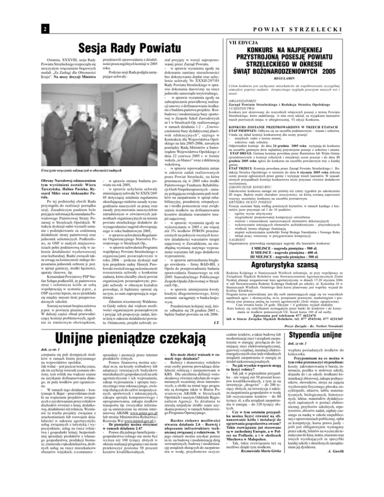 2 P O W I A T VII EDYCJA Sesja Rady Powiatu Ostatnia, XXXVIII, sesja Rady Powiatu Strzeleckiego rozpoczê³a siê przedstawili sprawozdania z dzia³al- noci poszczególnych komisji w 2005 uroczystym wrêczeniem br¹zowych roku. Kraju. Na mocy decyzji Ministra puj¹ce uchwa³y: medali Za Zas³ugi dla Obronnoci Podczas sesji Rada podjê³a nastê- KONKURS NA NAJPIÊKNIEJ PRZYSTROJON¥ POSESJÊ POWIATU STRZELECKIEGO W OKRESIE WI¥T BO¯ONARODZENIOWYCH 2005 sta³ przyjêty w wersji zapropono- wanej przez Zarz¹d Powiatu. - w sprawie wyra¿enia zgody na dokonanie zamiany nieruchomoci bez dokonywania dop³at oraz uchy- REGULAMIN lenia uchwa³y Nr XXXII/297/05 Rady Powiatu Strzeleckiego w spra- Celem konkursu jest zachêcanie mieszkañców do wspó³tworzenia szczególnej jednostki samorz¹du terytorialnego, miast. wie dokonania darowizny na rzecz - atmosfery poprzez nadanie w sprawie wyra¿enia zgody na Zarz¹d Powiatu Strzeleckiego i Redakcja Strzelca Opolskiego cji umowy o dofinansowanie rodka- UCZESTNICTWO: mi z bud¿etu pañstwa projektu: Roz- Konkurs jest skierowany do wszystkich w³acicieli posesji z terenu Powiatu budowa i modernizacja bazy sporto- Strzeleckiego, które zadeklaruj¹ wej w Zespole Szkó³ Zawodowych w ramach dzia³ania 1.2 Unowo- KONKURS ZOSTANIE PRZEPROWADZONY W TRZECH ETAPACH czenienie bazy dydaktycznej placóedukacyjnych, ujêtego ETAP PIERWSZY: Odbywa siê na szczeblu podstawowym miasta i so³ectwa. Ustala siê sk³ad komisji konkursowej dla oceny posesji: w Kontrakcie dla Województwa Opol- skiego na lata 2005-2006, zawartym dnia 22 czerwca 2005 r. w formie grudnia 2005 roku zg³osi do konkursu na szczeblu powiatowym trzy z ka¿dej Tarczyñska, Halina Pasieka, Ryszard Miler oraz Aleksander Pato³a. Po tej podnios³ej chwili Rada przyst¹pi³a do realizacji porz¹dku sesji. Zasadniczym punktem by³o przyjêcie informacji Komendanta Po- - w sprawie uchylenia uchwa³y cji Osób Niepe³nosprawnych zmia- zmieniaj¹cej uchwa³ê Nr XXIX/269/ 05 dotycz¹cej ustalenia regulaminu okrelaj¹cego niektóre zasady wynagradzania nauczycieli za pracê oraz zasady przyznawania nauczycielom zatrudnionym w owiatowych jed- wiatowego Pañstwowej Stra¿y Po- nostkach organizacyjnych na terenie trakcie dyskusji radni wyrazili uzna- wynagrodzenia i nagród obowi¹zuj¹- ¿arnej w Strzelcach Opolskich. W nie i podziêkowanie za codzienn¹ dzia³alnoæ stra¿y pañstwowej oraz jednostek ochotniczych. Podkrelo- - w sprawie uchwalenia Regulami- kresie dzia³alnoci wychowawczej wspó³pracy Powiatu Strzeleckiego z ciach pe³ni podstawow¹ rolê w za- oraz kulturalnej. Radni zwracali tak- ¿e uwagê na koniecznoæ sta³ego do- posa¿ania jednostek ochrony p. po¿. w sprzêt ganiczy, rodki ³¹cznoci, - w sprawie uchwalenia Programu organizacjami pozarz¹dowymi w organizacjom pozarz¹dowym; pro- wspó³pracuj¹ w systemie p.po¿., a OSP s¹ coraz lepsze, na co przek³ada siê miêdzy innymi iloæ przeprowa- dzonych szkoleñ. zadania, które chcia³by zleciæ powiat - wykorzystanie w 2005 r. nie wiêcej czonych na pokrycie rocznych kosz- tów dzia³alnoci warsztatów terapii wykorzystanie istniej¹cych elementów architektoniczno przyrodniczych - wielkoæ terenu objêtego iluminacj¹ - stopieñ wykorzystania symboliki wi¹t Bo¿ego Narodzenia i Nowego Roku - wk³ad pracy wniesiony w przygotowanie kompozycji NAGRODY: zajêciowej w Zawadzkiem, na nie- Organizatorzy przewiduj¹ nastêpuj¹ce nagrody dla laureatów konkursu: zbêdn¹ wymianê zu¿ytego wyposa- I MIEJSCE - nagroda pieniê¿na - 500 z³. ¿enia warsztatu lub jego dodatkowe II MIEJSCE - nagroda pieniê¿na - 400 z³. wyposa¿enie, III MIEJSCE - nagroda pieniê¿na - 300 z³. w sprawie zatwierdzenia bieg³e- go rewidenta firmy BAD-BIL z Agroturystyka szans¹ sprawozdania finansowego za rok Rodzina Kolpinga w Staniszczach Wielkich informuje, ¿e przy wspó³pracy ze 2005 Samodzielnego Publicznego Zespo³u Opieki Zdrowotnej w Strzel- Zwi¹zkiem l¹skich Rolników oraz Stowarzyszeniem Agroturystycznym Ziemi Nyskiej planuje zorganizowaæ kurs agroturystyczny w dniach 17-20 stycznia 2006 w sali Stowarzyszenia Rodziny Kolpinga (budynek po szkole), ul. Kocielna 10 w cach Op., kredytu d³ugoterminowego, który Program kursu przewidziany jest dla osób zamierzaj¹cych zaj¹æ siê we wszystkich wym. mocj¹ oraz pomoc¹ unijn¹ na rozwój agroturystyki (iloæ miejsc ograniczona). nizacje. Zdaniem wicestarosty Waldema- W dalszej czêci obrad przewodni- i przyj¹æ ich propozycje zadañ, któ- nie ze statutowym obowi¹zkiem, oryginalnoæ proponowanej kompozycji owietlenia wieloæ i ró¿norodnoæ zastosowanych elementów dekoracyjnych na tym, co nam zaproponuj¹ te orga- ra Gaidy nale¿y daæ wiêksze mo¿li- cz¹cy komisji problemowych, zgod- w sprawie: wyra¿enia zgody na ogólny wyraz artystyczny - jekt uchwa³y w obecnym kszta³cie powoduje, i¿ bêdziemy opieraæ siê Szerzej na temat bezpieczeñstwa p.po¿. w powiecie piszemy obok. pii zajêciowej; Opola do przeprowadzenia badania fan Sz³apa podkreli³, ¿e pañstwowa Posesje oceniane bêd¹ wed³ug poni¿szych kryteriów, w ramach ka¿dego z kry- kosztów dzia³ania warsztatów tera- - rozszerzenia uchwa³y o konkretne stra¿ i ochotnicza cile ze sob¹ teriów juror przyznaje od 1 do 10 punktów: ³owski zwróci³ uwagê na koniecznoæ aparaty tlenowe, itp. Komendant Powiatowy PSP Ste- KRYTERIA OCENY POSESJI: szeniu rodków na dofinansowanie ne i rodki pomocnicze oraz zwiêk- roku 2006 podczas dyskusji nad tym projektem radny Henryk Paw- wszyscy uczestnicy konkursu na szczeblu powiatowym. bilitacyjny, przedmioty ortopedycz- - nu Organizacyjnego Starostwa Po- Zakoñczenie konkursu nast¹pi nie póniej ni¿ cztery tygodnie po zakoñczeniu III etapu. Bêdzie mia³o charakter uroczystoci, na któr¹ zostan¹ zaproszeni ków na zaopatrzenie w sprzêt reha- ni¿ 3% rodków PFRON przezna- wiatowego w Strzelcach Op., ZAKOÑCZENIE KONKURSU: ny polegaj¹ na zwiêkszeniu puli rod- cego w roku bud¿etow