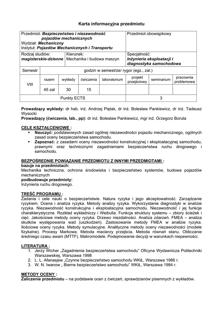 Karta informacyjna przedmiotu Przedmiot: Bezpieczeństwo i niezawodność pojazdów mechanicznych Wydział: Mechaniczny Instytut: Pojazdów Mechanicznych i Transportu Przedmiot obowiązkowy Rodzaj studiów: Kierunek: magisterskie-dzienne Mechanika i budowa maszyn Specjalność: Inżynieria eksploatacji i diagnostyka samochodowa Semestr godzin w semestrze/ rygor (egz., zal.) razem wykłady ćwiczenia 45 zal 30 15 VIII Punkty ECTS laboratorium projekt przejściowy seminarium pracownia problemowa 3 Prowadzący wykłady: dr hab. inż. Andrzej Piętak, dr inż. Bolesław Pankiewicz, dr inż. Tadeusz Wysocki Prowadzący (ćwiczenia, lab., pp): dr inż. Bolesław Pankiewicz, mgr inż. Grzegorz Boruta CELE KSZTAŁCENIOWE : Nauczyć: podstawowych zasad ogólnej niezawodności pojazdu mechanicznego, ogólnych zasad oceny bezpieczeństwa samochodu. Zapoznać: z zasadami oceny niezawodności konstrukcyjnej i eksploatacyjnej samochodu, prawnymi oraz technicznymi zagadnieniami bezpieczeństwa ruchu drogowego i samochodu. BEZPOŚREDNIE POWIĄZANIE PRZEDMIOTU Z INNYMI PRZEDMIOTAMI : bazuje na przedmiotach: Mechanika techniczna, ochrona środowiska i bezpieczeństwo systemów, budowa pojazdów mechanicznych podbudowuje przedmioty: Inżynieria ruchu drogowego. TREŚĆ PROGRAMU : Zadania i cele nauki o bezpieczeństwie. Natura ryzyka i jego akceptowalność. Zarządzanie ryzykiem. Ocena i analiza ryzyka. Metody analizy ryzyka. Wykorzystanie diagnostyki w analizie ryzyka. Niezawodność konstrukcyjna i eksploatacyjna samochodu. Niezawodność i jej funkcje charakterystyczne. Rozkład wykładniczy i Weibulla. Funkcja struktury systemu – zbiory ścieżek i cięć. Jakościowe metody oceny ryzyka. Drzewo niezdatności. Analiza zdarzeń. FMEA – analiza skutków występowania wad (uszkodzeń). Zastosowanie metody FMEA w analizie ryzyka. Ilościowe oceny ryzyka. Metody symulacyjne. Analityczne metody oceny niezawodności (modele fizykalne). Procesy Markowa. Metoda macierzy przejścia. Metoda równań stanu. Obliczanie średniego czasu awarii (MTTF). Makromodele. Podejmowanie decyzji w warunkach niepewności. LITERATURA : 1. Jerzy Wicher „Zagadnienia bezpieczeństwa samochodu” Oficyna Wydawnicza Politechniki Warszawskiej, Warszawa 1998 2. L. L. Afanasjew „Czynne bezpieczeństwo samochodu WKiŁ, Warszawa 1986 r. 3. W. N. Iwanow „ Bierne bezpieczeństwo samochodu” WKiŁ, Warszawa 1984 r. METODY OCENY : Zaliczenie przedmiotu – na podstawie ocen z ćwiczeń, sprawdzianów pisemnych z wykładów.