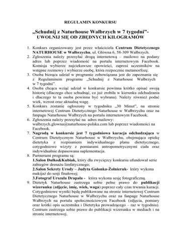 REGULAMIN KONKURSU „Schudnij z Naturhouse Wałbrzych w 7 tygodni”UWOLNIJ SIĘ OD ZBĘDNYCH KILOGRAMÓW 1. Konkurs organizowany jest przez właściciela Centrum Dietetycznego NATURHOUSE w Wałbrzychu, ul. Główna 6, 58-309 Wałbrzych. 2. Zgłoszenia należy przesyłać drogą internetową – mailowo na podany adres lub poprzez wiadomość na portalu internetowym Facebook. Komisja wybierze najciekawsze opowieści, zaprosi uczestników na wstępne rozmowy i wybierze osobę, która rozpocznie metamorfozę. 3. Osoba biorąca udział w programie zobowiązana jest do zapoznania się z Regulaminem programu „Schudnij z Naturhouse Wałbrzych w 7 tygodni”. 4. Osoba chcąca wziąć udział w konkursie powinna krótko opisać swoją historię (dlaczego chce schudnąć, co już zrobiła w kierunku odchudzania i dlaczego to ta osoba powinna być wybrana). Należy również podać wiek, wzrost oraz aktualną wagę. 5. Konkurs zostanie ogłoszony w tygodniku „30 Minut”, na stronie internetowej Centrum Dietetycznego Naturhouse w Wałbrzychu oraz na fanpagu Naturhouse Wałbrzych na portalu internetowym Facebook. 6. Zgłoszenia należy przesyłać na adres mailowy: [email protected] lub poprzez wiadomości na Facebook. 7. Nagrodą w konkursie jest 7 tygodniowa kuracja odchudzająca w Centrum Dietetycznym Naturhouse w Wałbrzychu, obejmująca opiekę dietetyka z rozpisaniem indywidualnego planu dietetycznego, cotygodniowe wizyty z pomiarami antropometrycznymi ciała oraz indywidualnie dopasowana suplementacja. 8. Partnerami programu są: 1.Salon Dulko&Kubiak, który dla zwycięzcy konkursu ufundował serie zabiegów drenażu limfatycznego; 2.Salon Sekrety Urody – Judyta Golonka-Żołnieruk- który wykona makijaż do sesji finałowej; 3.Fotograf Urszula Drapała - która wykona sesję fotograficzną. 9. Dietetyk Naturhouse zastrzega sobie pełne prawo do publikacji wizerunku (zdjęcie, imię, wiek, waga) poprzez cały czas trwania kuracji. Cotygodniowe wyniki będą publikowane na stronie internetowej Centrum Dietetycznego Naturhouse w Wałbrzychu oraz na fanpage Naturhouse Wałbrzych na portalu społecznościowym Facebook (zdjęcia, pomiary oraz krótki opis uczestnika i Dietetyka prowadzącego – raz w tygodniu). Centrum zastrzega sobie prawo do publikacji wizerunku w mediach i na stronie internetowej. 10.Uczestnik zobowiązuje się do przestrzegania wszystkich zaleceń Dietetyka przez okres trwania konkursowej kuracji. 11.Z udziału w programie wyłączeni są pracownicy Centrum Dietetycznego NATURHOUSE w Wałbrzychu oraz ich najbliższa rodzina. 12.Nagrody w postaci kuracji odchudzającej w Centrum Dietetycznym Naturhouse w Wałbrzychu nie można zamienić na inne nagrody, ani na ekwiwalent pieniężny.