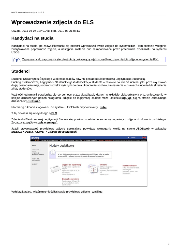 DIOTS: Wprowadzenie zdjęc ia do ELS Wprowadzenie zdjęcia do ELS Utw. pt., 2011-05-06 12:40, Akt. pon., 2012-03-26 08:57 Kandydaci na studia Kandydaci na studia, po zakwalifikowaniu się powinni wprowadzić swoje zdjęcie do systemu IRK. Tam zostanie wstępnie zweryfikowana poprawność zdjęcia, a następnie zostanie ono zaimportowane przez pracownika dziekanatu do systemu USOS. Zapraszamy do zapoznania się z instrukcją pokazującą w jaki sposób można umieścić zdjęcie w systemie IRK. Studenci Studenci Uniwersytetu Śląskiego w okresie studiów powinni posiadać Elektroniczną Legitymację Studencką. Funkcją Elektronicznej Legitymacji Studenckiej jest identyfikacja studenta – zarówno na terenie uczelni, jak i poza nią. Prawo do jej posiadania mają studenci uczelni wyższych do dnia ukończenia studiów, zawieszenia w prawach studenta lub skreślenia z listy studentów. Ważność legitymacji potwierdza się co semestr przez aktualizację danych w układzie elektronicznym oraz umieszczenie w kolejno oznaczonych polach hologramu. Zdjęcie do legitymacji student może umieścić logując się na stronie „wirtualnego dziekanatu” USOSweb. Informację o koncie i logowaniu do systemu USOSweb przypominamy…tutaj Tutaj dowiesz się wszystkiego o ELS. Zdjęcie do Elektronicznej Legitymacji Studenckiej powinno spełniać te same wymagania, co zdjęcie do dowodu osobistego. Zobacz szczegółowy opis wymagań. Jeżeli przygotowałeś prawidłowe zdjęcie spełniające powyższe wymagania wejdź na stronę USOSweb w zakładkę MODUŁY DODATKOWE -> Zdjęcie do legitymacji. Wybierz katalog, w którym umieściłeś swoje prawidłowe zdjęcie i wyślij go. 1 Po przesłaniu zdjęcia zostaniesz automatycznie przeniesiony na stronę Kadrowania, na której będziesz mógł odpowiednio dopasować zdjęcie. Zdjęcie w postaci elektronicznej powinno mieć rozmiary 400 * 500 pikseli, co pozwala na wydrukowanie w rozmiarze 2 cm * 2,5 cm z odpowiednią jakością. Wymagany jest format JPG. Wykadruj swoje zdjęcie w taki sposób, aby jego większą część zajmowała twarz (około 2/3 kadru). Zdjęcie powinno obejmować sylwetkę od wierzchołka głowy do górnej części barków. Dla ułatwienia nałożono wzorcowy obrys pokazujący wymagane proporcje. Główny obszar roboczy (1) przedstawia załadowane zdjęcie oraz ramkę kadrowania. Aby zmienić rozmiar ramki kadrowania należy umieścić kursor myszy w jednym z jej narożników (żółte kwadraty), nacisnąć i przytrzymać lewy przycisk myszy, a następnie przemieszczać kursor myszy. Aby zmienić położenie ramki należy umieścić kursor myszy w jej wnętrzu, nacisnąć i przytrzymać lewy przycisk myszy, a następnie przemieszczać kursor myszy. Wynik działań widoczny jest na bieżąco w obszarze podglądu (3). Dla ułatwienia oceny wymaganych proporcji zdjęcia w oknie (2) zamieszono wzorcowo wykadrowany przykład. Jeżeli zdjęcie wymaga obrócenia o kąt 90°, to można posłużyć się przyciskami lub z grupy menu (4). Naciśnięcie przycisku Anuluj przerywa proces ładowania i kadrowania zdjęcia. Naciśnięcie przycisku Zatwierdź powoduje zapisanie zarówno wykadrowanego, jak i oryginalnego zdjęcia. Po zatwierdzeniu kadrowania zobaczysz na ekranie informację, że powinieneś zgłosić zdjęcie do zatwierdzenia 2 Po zgłoszeniu do zatwierdzenia musisz poczekać aż upoważniona do tego osoba obejrzy Twoje zdjęcie i podejmie decyzję o jego akceptacji lub odrzuceniu. Po akceptacji zdjęcia na Twoim koncie pojawi się odpowiedni komunikat. Zatwierdzonego zdjęcia nie można podmienić na inne. Jeśli zależy Ci na tym, żeby w systemie znalazło się inne Twoje zdjęcie, to skontaktuj się z lokalnym administratorem [email protected] lub poproś macierzysty dziekanat o usunięcie obecnego zdjęcia z systemu. Ustawienia przeglądarek Aplet do kadrowania zdjęć wymaga specjalnego ustawienia opcji obsługi ciasteczek. Zależnie od przeglądarki, należy ustawić wskazane opcje . • Firefox Zakładka Narzędzia -> Opcje -> Prywatność, sekcja Ciasteczka. Ustawić opcję Akceptuj ciasteczka z innych witryn (odznaczenie tego pola ogranicza stosowanie ciasteczek tylko do pierwotnej witryny). • Internet Explorer (7,8) Zakładka Narzędzia -> Opcje Internetowe, zakładka Prywatność, przycisk Zaawansowane. W grupie Pliki cookie tej samej firmy trzeba zaznaczyć Akceptuj. W grupie Pliki cookie innych firm trzeba zaznaczyć Akceptuj . • Opera Zakładka Narzędzia -> Preferencje, zakładka Zaawansowane. Z listy po lewej stronie należy wybrać pozycję Ciasteczka. Zaznaczona powinna być opcja Akceptuj ciasteczka. 3