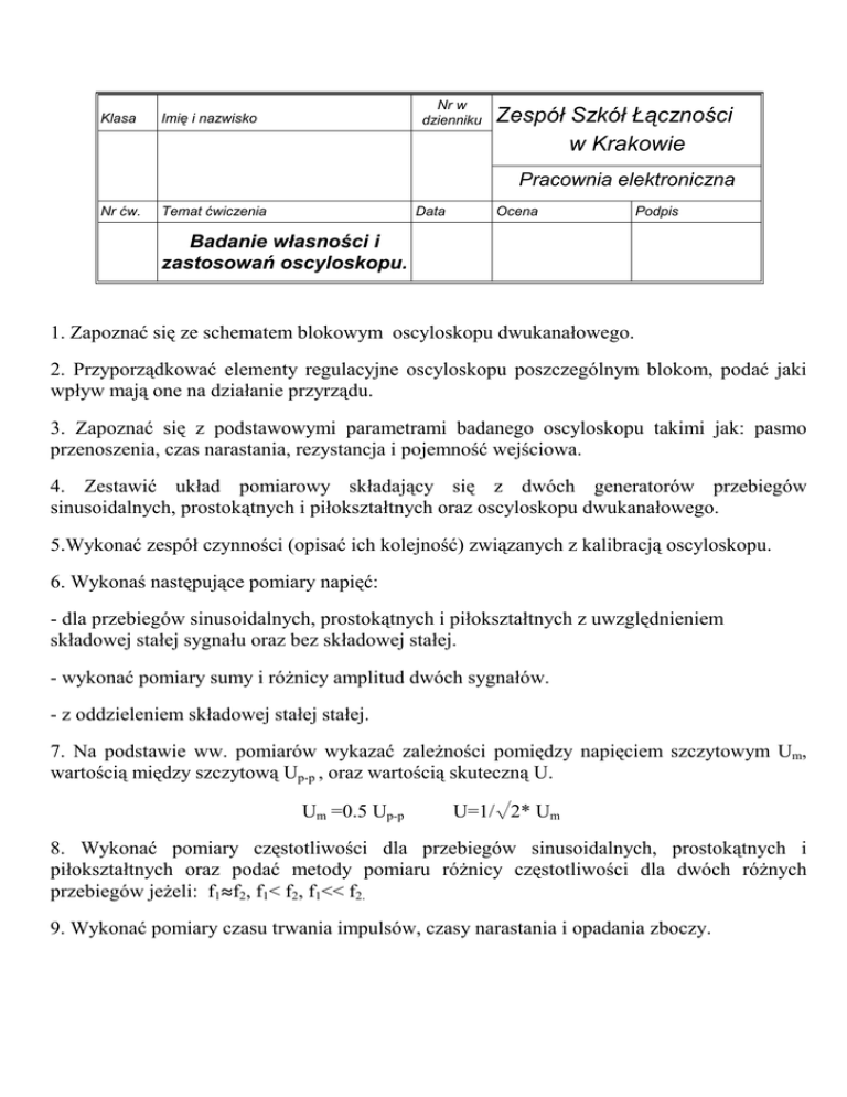 Klasa Nr w dzienniku Imię i nazwisko Zespół Szkół Łączności w Krakowie Pracownia elektroniczna Nr ćw. Temat ćwiczenia Data Ocena Podpis Badanie własności i zastosowań oscyloskopu. 1. Zapoznać się ze schematem blokowym oscyloskopu dwukanałowego. 2. Przyporządkować elementy regulacyjne oscyloskopu poszczególnym blokom, podać jaki wpływ mają one na działanie przyrządu. 3. Zapoznać się z podstawowymi parametrami badanego oscyloskopu takimi jak: pasmo przenoszenia, czas narastania, rezystancja i pojemność wejściowa. 4. Zestawić układ pomiarowy składający się z dwóch generatorów przebiegów sinusoidalnych, prostokątnych i piłokształtnych oraz oscyloskopu dwukanałowego. 5.Wykonać zespół czynności (opisać ich kolejność) związanych z kalibracją oscyloskopu. 6. Wykonaś następujące pomiary napięć: - dla przebiegów sinusoidalnych, prostokątnych i piłokształtnych z uwzględnieniem składowej stałej sygnału oraz bez składowej stałej. - wykonać pomiary sumy i róŜnicy amplitud dwóch sygnałów. - z oddzieleniem składowej stałej stałej. 7. Na podstawie ww. pomiarów wykazać zaleŜności pomiędzy napięciem szczytowym Um, wartością między szczytową Up-p , oraz wartością skuteczną U. Um =0.5 Up-p U=1/√2* Um 8. Wykonać pomiary częstotliwości dla przebiegów sinusoidalnych, prostokątnych i piłokształtnych oraz podać metody pomiaru róŜnicy częstotliwości dla dwóch róŜnych przebiegów jeŜeli: f1≈f2, f1< f2, f1<< f2. 9. Wykonać pomiary czasu trwania impulsów, czasy narastania i opadania zboczy. 10. Zbadać zaleŜność pomiędzy czasem narastania tno a pasmem przenoszenia fgo wg zaleŜności: tno=0.35/fgo przyjmująć załoŜenie, Ŝe sygnał prostokątny z generatora jest zbliŜony do idealnego. 11. Wykonać pomiary napięć wyŜszych czestotliwości (powyŜyj 10 MHz) z uŜyciem sondy pomiarowej RC z dzielnikiem napięcia 1:10. Podać zasadność stosowania sond pomiarowych oraz sposób ich kompensacji i dopasowania wg zaleŜności: C1R1=CzR2 C1R1- pojemność i rezystancja sondy CzR2- pojemność zastępcza wejścia oscyloskopu i kabla, rezystancja wejściowa oscyloskopu 12. Do wszystkich pomiarów narysować wykresy uwzględniając nastawy dzielników napięć wejściowych wzmacniaczy i podstawy czasu. Wyniki pomiarów zestawić w tabelach. 13. Podać własne wnioski wynikające z ww. pomiarów. 14. Podać wykaz uŜytych przyrządów.