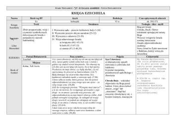 STARY TESTAMENT - $nt - H PALAIA DIAQHKH - VETUS TESTAMENTUM KSIĘGA EZECHIELA Nazwa Księga Ezechiela laqzxy Skrót wg BT Ez Treść Struktura I. Wyrocznia sądu – przeciw królestwie Judy (1-24) II. Wyrocznie przeciw obcym narodom (25-32) III. Wyrocznie o odnowie (33-39) IV. Wizja odnowionego Izraela a) świątynia (40,1-43,13) b) kult (43,13-47,12) c) ziemie (47,13-48,35) Postaci/Bohaterowie Ezechiel Miejsca Parę cytatów… A ty, synu człowieczy, nie bój się ich ani się nie lękaj ich słów, nawet gdyby wokół ciebie były osty i ciernie i gdybyś się znalazł wśród skorpionów. Nie obawiaj się ich słów ani się nie lękaj ich twarzy, bo to lud oporny. Przekażesz im moje słowa: czy będą słuchać, czy też zaprzestaną, bo przecież są buntownikami. (2,6-7) Będą domagać się od proroka objawienia, lecz kapłanowi zabraknie nauki, a starszym rady. (7,26) Umrze tylko ta osoba, która grzeszy. Syn nie ponosi odpowiedzialności za winę swego ojca ani ojciec - za winę swego syna. (18,20) Jeśli do występnego powiem: "Występny musi umrzeć" a ty nic nie mówisz, by występnego sprowadzić z jego drogi - to on umrze z powodu swej przewiny, ale odpowiedzialnością za jego śmierć obarczę ciebie. Jeśli jednak ostrzegłeś występnego, by odstąpił od swojej drogi i zawrócił, on jednak nie odstępuje od swojej drogi, to on umrze z własnej winy, ty zaś ocaliłeś swoją duszę. (33,8-9) I dam wam serce nowe i ducha nowego tchnę do waszego wnętrza, odbiorę wam serce kamienne, a dam wam serce z ciała. (36,26) Kebar, Tell Awiw Book of Εzekiel Redakcja VI w. Zbiór przepowiedni, wizji i czynności symbolicznych dotyczycących Izraela z perspektywy niewoli babilońskiej Liber Hiezechiel ΙΕΖΕΚΙΗΛ Język hebrajski Pojęcia Syn Człowieczy – a) idiomatyczny sposób mówienia o człowieku lub ludzkości b) postać mesjańska, przedstawiciel sądu Bożego i zbawienia Chwała Boża – widzialne objawienie się Boga przed ludźmi. Użyte słowo kabod znaczy „waga” lub „znaczenie”. Stąd być otoczony chwałą łączy się z byciem ważnym, znaczącym Czas opisywanych zdarzeń ok. 592-571 Teologia - idee - myśli Bóg jest święty Chwała, Duch i Słowo terminami opisującymi naturę Boga Wszyscy wrogowie Izraela zostaną zniszczenie Zasada odpowiedzialności osobistej Nowy Izrael to Żydzi nawróceni z Babilonu, którzy wrócą do Jerozolimy Ciekawostki Wg Pseudo-Epifaniusza, (De vitis prophetarum, PG 43,401) prorok został zabity przez pewnego przywódcę ludu, któremu wyrzucał bałwochwalcze postępowanie W XIX/XX w. często (np. K. Jespers) interpretowano zachowanie Ezechiela jako charakterystyczne dla osoby schizofrenicznej