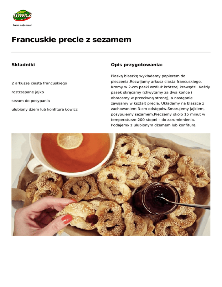 Francuskie precle z sezamem Składniki Opis przygotowania: Płaską blaszkę wykładamy papierem do 2 arkusze ciasta francuskiego roztrzepane jajko sezam do posypania ulubiony dżem lub konfitura Łowicz pieczenia.Rozwijamy arkusz ciasta francuskiego. Kromy w 2-cm paski wzdłuż krótszej krawędzi. Każdy pasek skręcamy (chwytamy za dwa końce i obracamy w przeciwną stronę), a następnie zawijamy w kształt precla. Układamy na blaszce z zachowaniem 3-cm odstępów.Smarujemy jajkiem, posypujemy sezamem.Pieczemy około 15 minut w temperaturze 200 stopni – do zarumienienia. Podajemy z ulubionym dżemem lub konfiturą. Powered by TCPDF (www.tcpdf.org)