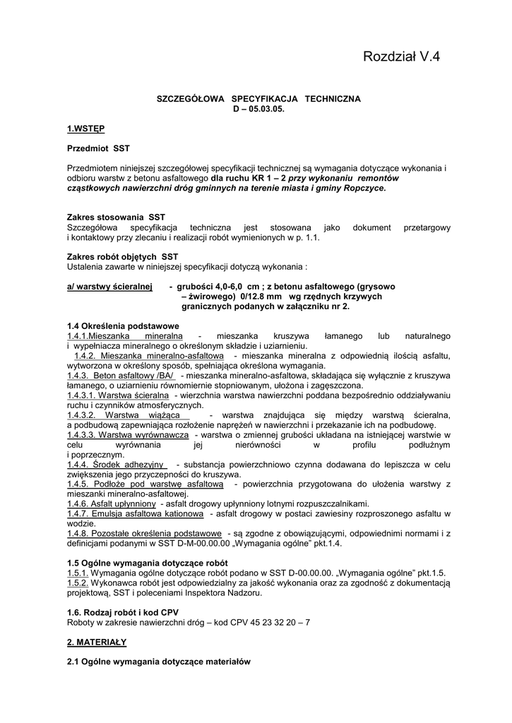 Rozdział V.4 SZCZEGÓŁOWA SPECYFIKACJA TECHNICZNA D – 05.03.05. 1.WSTĘP Przedmiot SST Przedmiotem niniejszej szczegółowej specyfikacji technicznej są wymagania dotyczące wykonania i odbioru warstw z betonu asfaltowego dla ruchu KR 1 – 2 przy wykonaniu remontów cząstkowych nawierzchni dróg gminnych na terenie miasta i gminy Ropczyce. Zakres stosowania SST Szczegółowa specyfikacja techniczna jest stosowana jako i kontaktowy przy zlecaniu i realizacji robót wymienionych w p. 1.1. dokument przetargowy Zakres robót objętych SST Ustalenia zawarte w niniejszej specyfikacji dotyczą wykonania : a/ warstwy ścieralnej - grubości 4,0-6,0 cm ; z betonu asfaltowego (grysowo – żwirowego) 0/12.8 mm wg rzędnych krzywych granicznych podanych w załączniku nr 2. 1.4 Określenia podstawowe 1.4.1.Mieszanka mineralna mieszanka kruszywa łamanego lub naturalnego i wypełniacza mineralnego o określonym składzie i uziarnieniu. 1.4.2. Mieszanka mineralno-asfaltowa - mieszanka mineralna z odpowiednią ilością asfaltu, wytworzona w określony sposób, spełniająca określona wymagania. 1.4.3. Beton asfaltowy /BA/ - mieszanka mineralno-asfaltowa, składająca się wyłącznie z kruszywa łamanego, o uziarnieniu równomiernie stopniowanym, ułożona i zagęszczona. 1.4.3.1. Warstwa ścieralna - wierzchnia warstwa nawierzchni poddana bezpośrednio oddziaływaniu ruchu i czynników atmosferycznych. 1.4.3.2. Warstwa wiążąca - warstwa znajdująca się między warstwą ścieralna, a podbudową zapewniająca rozłożenie naprężeń w nawierzchni i przekazanie ich na podbudowę. 1.4.3.3. Warstwa wyrównawcza - warstwa o zmiennej grubości układana na istniejącej warstwie w celu wyrównania jej nierówności w profilu podłużnym i poprzecznym. 1.4.4. Środek adhezyjny - substancja powierzchniowo czynna dodawana do lepiszcza w celu zwiększenia jego przyczepności do kruszywa. 1.4.5. Podłoże pod warstwę asfaltową - powierzchnia przygotowana do ułożenia warstwy z mieszanki mineralno-asfaltowej. 1.4.6. Asfalt upłynniony - asfalt drogowy upłynniony lotnymi rozpuszczalnikami. 1.4.7. Emulsja asfaltowa kationowa - asfalt drogowy w postaci zawiesiny rozproszonego asfaltu w wodzie. 1.4.8. Pozostałe określenia podstawowe - są zgodne z obowiązującymi, odpowiednimi normami i z definicjami podanymi w SST D-M-00.00.00 „Wymagania ogólne” pkt.1.4. 1.5 Ogólne wymagania dotyczące robót 1.5.1. Wymagania ogólne dotyczące robót podano w SST D-00.00.00. „Wymagania ogólne” pkt.1.5. 1.5.2. Wykonawca robót jest odpowiedzialny za jakość wykonania oraz za zgodność z dokumentacją projektową, SST i poleceniami Inspektora Nadzoru. 1.6. Rodzaj robót i kod CPV Roboty w zakresie nawierzchni dróg – kod CPV 45 23 32 20 – 7 2. MATERIAŁY 2.1 Ogólne wymagania dotyczące materiałów 2 Ogólne wymagania dotyczące materiałów podano w SST D-M-00.00.00. „Wymagania ogólne” pkt.2. 2.2. Lepiszcze 2.2.1. Jako lepiszcze do mieszanki mineralno-bitumicznej zastosować : dla warstwy ścieralnej asfalt w/g PN-65/C-96170 - D 70; dla warstwy wiążącej asfalt w/g PN-65/C-96170 - D 70; 2.2.2. Warunki transportu i składowania lepiszcza Rodzaj lepiszcza i jego pochodzenie (dostawca i producent) musi być uzgodnione z Zamawiającym. Za dostawy lepiszczy i ich jakość odpowiedzialny jest Wykonawca robót. Zasady jakościowego odbioru lepiszczy Wykonawca robót uzgadnia z Nadzorem. Zabrania się stosowania do tego samego asortymentu robót lepiszczy pochodzących od różnych producentów. Transport i przechowywanie lepiszczy powinno być zgodne z warunkami uzgodnionymi z Nadzorem i powinny odpowiadać wymaganiom norm i przepisów dotyczących poszczególnych rodzajów lepiszczy. Lepiszcze należy przechowywać w zbiornikach stalowych, wyposażonych w urządzenia grzewcze i zabezpieczonych przed dostępem wody i zanieczyszczeniem. 2.3. Wypełniacz Do mieszanki mineralno-bitumicznej zastosować wypełniacz wapienny podstawowy spełniający wymagania normy PN-S-96504 : 1961. Transport i przechowywanie wypełniacza muszą odbywać się w sposób chroniący go przed zawilgoceniem, zbryleniem i zanieczyszczeniami. 2.4. Kruszywa Do mieszanek betonu asfaltowego zastosować : 2.4.1. Na warstwę ścieralną : - grysy o cechach w/g PN-B-11112:1996 klasy I lub II gat. 1 lub 2 : a) z litego surowca skalnego, ze skał magmowych, przeobrażonych i osadowych na drogach o ruchu średnim i lekkośrednim – przy zastosowaniu grysów wapiennych zaleca się by ich ilość wynosiła nie więcej niż 2/3 projektowanej zawartości frakcji ponad 2 mm, b) z surowca sztucznego (żużle pomiedziowe i stalownicze w/g PN-B-023004 ) kl. I, gat. 1, c) z surowca naturalnie rozdrobnionego, - grys i żwir kruszony wg WT/MK – CZDP 84 kl. I, II gat. 1,2 - piasek łamany i kruszywo drobne granulowane o cechach w/g PN-B-11112 : 1996. - piasek w/g PN-B-11113 : 1996 gat. 1 lub 2, Uwaga : Grysy nie mogą wykazywać oznak zwietrzenia, zaś bazalty oznak zgorzeli lub zmian natury chemicznej. 2.4.2. na warstwę wiążącą, wyrównawczą i wzmacniającą - grysy o cechach w/g PN-B-11112: 1996 kl.I lub II; gat. 1 lub 2, z surowca skalnego litego i z surowca naturalnie rozdrobnionego, - grysy z surowca sztucznego (żużle pomiedziowe i stalownicze w/g PN-B-023004) kl. I; gat. 1, - piasek łamany i kruszywo drobne granulowane o cechach w/g PN-B-11112: 1996, - kruszywo łamane zwykłe w/g PN-B-11112: 1996 klasy I lub II; gat. 1 lub 2, - żwir i mieszanka w/g PN-B-11112: 1996 klasy I lub II, - piasek w/g PN-B-11113: 1996 gat. 1 lub 2. 2.4.3. Dostawy kruszywa Wykonawca jest zobowiązany do prowadzenia ilościowego i jakościowego odbioru dostaw oraz wykonania z ustaloną w PZJ częstotliwością laboratoryjnych badań kontrolnych. Wyniki tych badań należy przekazywać w określonym trybie Nadzorowi. Pochodzenie kruszywa i jego jakość musi być wcześniej zaaprobowana przez Nadzór. Poszczególne grupy, podgrupy i asortymenty kruszyw