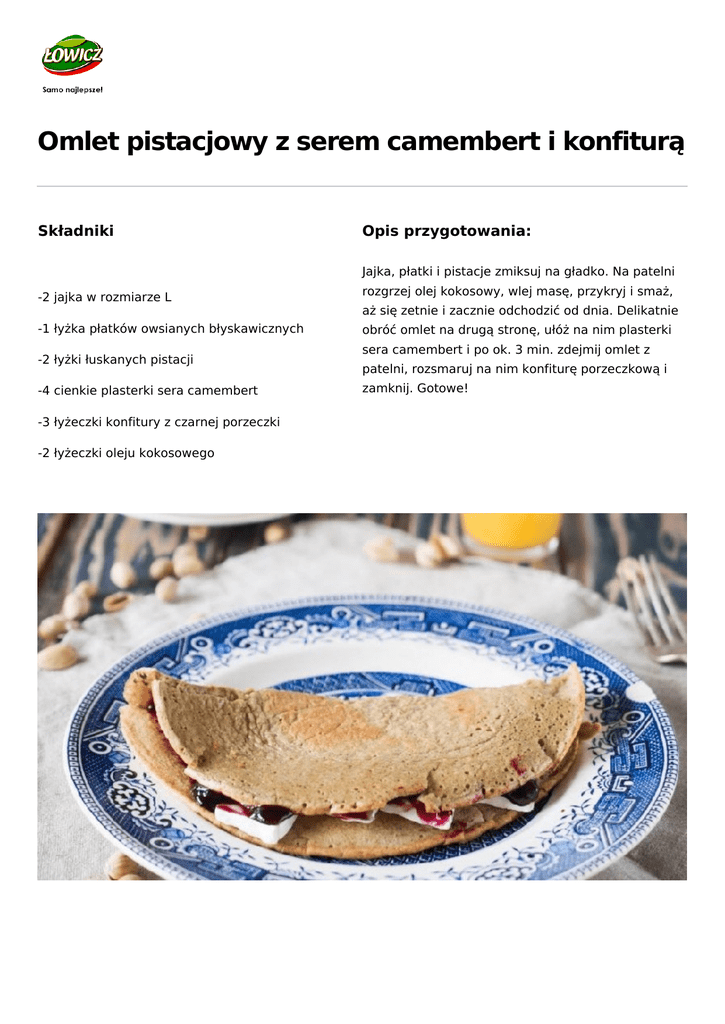 Omlet pistacjowy z serem camembert i konfiturą Składniki Opis przygotowania: Jajka, płatki i pistacje zmiksuj na gładko. Na patelni -2 jajka w rozmiarze L -1 łyżka płatków owsianych błyskawicznych -2 łyżki łuskanych pistacji -4 cienkie plasterki sera camembert -3 łyżeczki konfitury z czarnej porzeczki -2 łyżeczki oleju kokosowego Powered by TCPDF (www.tcpdf.org) rozgrzej olej kokosowy, wlej masę, przykryj i smaż, aż się zetnie i zacznie odchodzić od dnia. Delikatnie obróć omlet na drugą stronę, ułóż na nim plasterki sera camembert i po ok. 3 min. zdejmij omlet z patelni, rozsmaruj na nim konfiturę porzeczkową i zamknij. Gotowe!