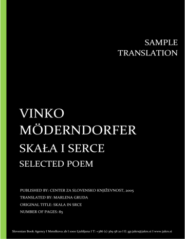 Vinko Möderndorfer: Skała i serce (Center za slovensko književnost, 2005) Translated by: Marlena Gruda SAMPLE SAMPLE TRANSLATION TRANSLATION VINKO MÖDERNDORFER LIRIKON SKAŁA MULTIPLEI SERCE AUTHORS: A. MEDVED, M. VINCETIČ, M. DEKLEVA, V. SELECTED POEM MÖDERNDORFER, BORIS A. NOVAK, M. JESIH PUBLISHED BY: CENTER ZA SLOVENSKO KNJIŽEVNOST, 2005 TRANSLATED BY: MARLENA GRUDA ORIGINAL TITLE: SKALA IN SRCE TRANSLATED BY: MARLENA GRUDA NUMBER OF PAGES: 85 Sample translation 1 Slovenian Book Agency I Metelkova 2b I 1000 Ljubljana I T: +386 (1) 369 58 20 I E: [email protected] I www.jakrs.si Vinko Möderndorfer: Skała i serce (Center za slovensko književnost, 2005) Translated by: Marlena Gruda Vinko Möderndorfer: Skała i serce Predmeti in ljudje Przedmioty i ludzie Stvari niso nikoli popolne samo tako izgledajo ko se upirajo negibnosti mrtvega sveta Rzeczy nigdy nie są doskonałe tylko tak wyglądają gdy opierają się nienaruszalności martwego świata Kadar jih posedujemo mislimo da smo srečni predmeti pa nas v resnici samo izrabljajo Kiedy wchodzą w nasze posiadanie myślimy że jesteśmy szczęśliwi a tak naprawdę to przedmioty na nas żerują Kot na primer tale stol v katerem so sedele štiri generacije in me zdaj vabi vase zgolj zato da dokaže svojo prevlado nad mojim kratkim živim življenjem Tak na przykład to krzesło na którym siedziały cztery generacje teraz kusi mnie tylko po to by udowodnić swoją władzę nad moim krótkim żywym życiem Tudi obleka položena čez stol poseduje človeško obliko Čeprav so se prsi povesile rit razlezla in dražesten von ki je bil prej skrit pod logotipom slavnega kretorja zdaj izdaja uhajajoči urin in razpadajočo beljakovino Także sukienka przewieszona przez krzesło zawłaszcza ludzką formą choć piersi już zwisają dupa się rozlazła a elegancki zapach skryty wcześniej pod logiem sławnego projektanta ujawnia ulatniający się mocz i rozkładające białko Predmeti in ženske moški In łojaki v samoti sobe jokajo kot mali zavrženi psi vedoč da med njimi ni enakomerno porazdeljena niti smrt Przedmioty i kobiety mężczyźni i żołnierze w samotności czerech ścian płaczą jak porzucone szczenięta wiedząc że nie jest rozdzielona po równo nawet śmierć Sample translation 2