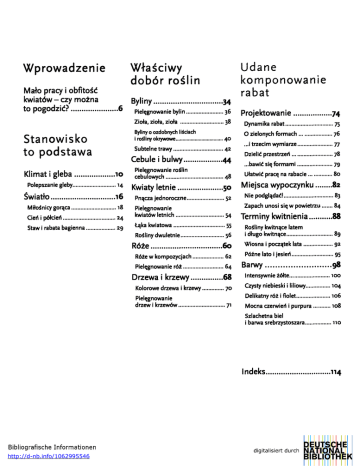 Mało pracy i obfitość kwiatów - czy można to pogodzić? 6 Stanowisko to podstawa 10 Polepszanie gleby 14 16 Miłośnicy gorąca 18 Cień i półcień 24 Staw i rabata bagienna Byliny 29 34 Pielęgnowanie bylin 36 Zioła, zioła, zioła 38 Byliny o ozdobnych liściach i rośliny okrywowe 4° Subtelne trawy 42 Cebule i bulwy Klimat i gleba Światło Udane komponowanie rabat Właściwy dobór roślin Wprowadzenie Pielęgnowanie roślin cebulowych Kwiaty letnie Pnącza jednoroczne 44 48 50 52 Projektowanie Dynamika rabat 75 0 zielonych formach 76 ...i trzecim wymiarze 77 Dzielić przestrzeń 78 ...bawić się formami 79 Ułatwić pracę na rabacie 80 Miejsca wypoczynku 82 Nie podglądać! 83 Zapach unosi się w powietrzu 84 Pielęgnowanie kwiatów letnich 54 Terminy kwitnienia 88 Łąka kwiatowa 55 Rośliny dwuletnie 56 Rośliny kwitnące latem 1 długo kwitnące 89 60 Wiosna i początek lata 92 Późne lato i jesień 95 Róże Róże w kompozycjach 62 Pielęgnowanie róż 64 Drzewa i krzewy Kolorowe drzewa i krzewy Pielęgnowanie drzew i krzewów 68 70 71 Barwy 98 Intensywnie żółte 100 Czysty niebieski i liliowy 104 Delikatny róż i fiolet 106 Mocna czerwień i purpura 108 Szlachetna biel i barwa srebrzystoszara 110 Indeks http://d-nb.info/1062995546 74 114