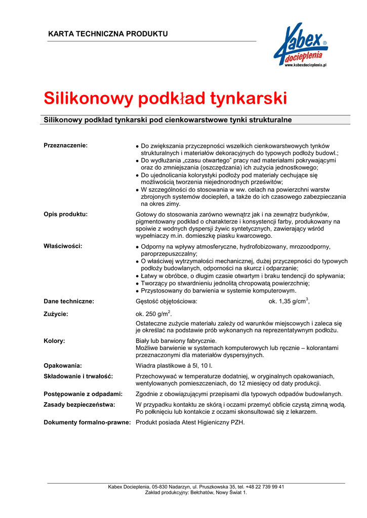KARTA TECHNICZNA PRODUKTU Silikonowy podkład tynkarski Silikonowy podkład tynkarski pod cienkowarstwowe tynki strukturalne Do zwiększania przyczepności wszelkich cienkowarstwowych tynków strukturalnych i materiałów dekoracyjnych do typowych podłoży budowl.; Do wydłużania „czasu otwartego” pracy nad materiałami pokrywającymi oraz do zmniejszania (oszczędzania) ich zużycia jednostkowego; Do ujednolicania kolorystyki podłoży pod materiały cechujące się możliwością tworzenia niejednorodnych prześwitów; W szczególności do stosowania w ww. celach na powierzchni warstw zbrojonych systemów dociepleń, a także do ich czasowego zabezpieczania na okres zimy. Przeznaczenie: Gotowy do stosowania zarówno wewnątrz jak i na zewnątrz budynków, pigmentowany podkład o charakterze i konsystencji farby, produkowany na spoiwie z wodnych dyspersji żywic syntetycznych, zawierający wśród wypełniaczy m.in. domieszkę piasku kwarcowego. Opis produktu: Właściwości: Odporny na wpływy atmosferyczne, hydrofobizowany, mrozoodporny, paroprzepuszczalny; O właściwej wytrzymałości mechanicznej, dużej przyczepności do typowych podłoży budowlanych, odporności na skurcz i odparzanie; Łatwy w obróbce, o długim czasie otwartym i braku tendencji do spływania; Tworzący po stwardnieniu jednolitą chropowatą powierzchnię; Przystosowany do barwienia w systemie komputerowym. Dane techniczne: Gęstość objętościowa: Zużycie: ok. 250 g/m . 3 ok. 1,35 g/cm , 2 Ostateczne zużycie materiału zależy od warunków miejscowych i zaleca się je określać na podstawie prób wykonanych na reprezentatywnym podłożu. Kolory: Biały lub barwiony fabrycznie. Możliwe barwienie w systemach komputerowych lub ręcznie – kolorantami przeznaczonymi dla materiałów dyspersyjnych. Opakowania: Wiadra plastikowe á 5l, 10 l. Składowanie i trwałość: Przechowywać w temperaturze dodatniej, w oryginalnych opakowaniach, wentylowanych pomieszczeniach, do 12 miesięcy od daty produkcji. Postępowanie z odpadami: Zgodnie z obowiązującymi przepisami dla typowych odpadów budowlanych. Zasady bezpieczeństwa: W przypadku kontaktu ze skórą i oczami przemyć obficie czystą zimną wodą. Po połknięciu lub kontakcie z oczami skonsultować się z lekarzem. Dokumenty formalno-prawne: Produkt posiada Atest Higieniczny PZH. Kabex Docieplenia, 05-830 Nadarzyn, ul. Pruszkowska 35, tel. +48 22 739 99 41 Zakład produkcyjny: Bełchatów, Nowy Świat 1. KARTA TECHNICZNA PRODUKTU WYKONAWSTWO: Warunki atmosferyczne: Podczas nakładania, wiązania i wysychania wymagana jest minimalna temperatura materiału, otoczenia i podłoża: + 5 ˚C. Nie pracować pod bezpośrednim działaniem nasłonecznienia, deszczu i wiatru oraz w temperaturach wyższych niż 25 ˚C. Prace zabezpieczające: Osłonić (okleić) elementy narażone na zabrudzenie materiałem. Stosować rusztowaniowe plandeki (siatki) ochronne. Przygotowanie podłoży: Wszystkie podłoża muszą być suche, nośne, równe, stabilne, czyste i wolne od substancji zmniejszających przyczepność. Odpowiednią metodą (mechanicznie, wodą pod ciśnieniem, środkami myjącymi itp.) usunąć źle związane lub wystające elementy podłoża (luźne tynki, resztki zaprawy, łuszczące powłoki itp.). Ubytki i nierówności powierzchni naprawić, odchyłki wyrównać odpowiednimi zaprawami. W szczególności: Nowe podłoża mineralne – oczyścić; Nośne tynki cem. i cem.-wap. – oczyścić; Tynki j.w. powierzchniowo piaszczące – zmyć wodą pod ciśn., zagruntować właściwym materiałem impregnującym; Istn. powłoki nośne, nie pylące – zmyć wodą pod ciśn.; Powłoki jw., kredujące – zmyć wodą pod ciśn., zagruntować właściwym materiałem impregnującym; Powłoki nie nośne – usunąć w całości, pozostałe podłoże zagruntować właściwym materiałem impregnującym. Przygotowanie materiału: Zawartość pojemnika wymieszać dokładnie przy pomocy mieszadła wolnoobrotowego (do ok. 400 obr./min.). W miarę możności nie rozcieńczać. W razie potrzeby regulacji konsystencji dodać max. 5 % wody. Nakładanie materiału: Materiał nanosić na przygotowane podłoże techniką malarską, sukcesywnie, wałkiem lub pędzlem, w jednej warstwie o jednakowej grubości. grubości nieco większej od uziarnienia tynku. Uwaga: Technologia nie wymaga uzyskania silnego krycia, a jedynie jednolite i kolorystycznie jednakowe ułożenie podkładu na powierzchni. W tym celu należy przestrzegać podanego zużycia jednostkowego materiału. Czyszczenie narzędzi: Czystą, zimną wodą, bezpośrednio po użyciu. Czas schnięcia: W warunkach normalnych (temp. ok. 20 ˚C, wilgotność względna ok. 60%) podkład nadaje się do dalszych prac po ok. 12 godzinach od nałożenia. Wysychanie materiału jest procesem fizycznym, polegającym na odparowaniu wody. W warunkach mgły lub wysokiej wilgotności powietrza oraz w niższych temperaturach ulega ono znacznemu spowolnieniu. Karta techniczna produktu: Silikonowy podkład tynkarski, stan: IX 2015. Wszystkie powyższe informacje są oparte o aktualny stan wiedzy technicznej i nasze długoletnie doświadczenie. Ze względu na różnorodność występujących rodzajów podłoży i sytuacji należy każdorazowo sprawdzać przydatność danego produktu do zastosowania oraz rzeczywiste, miejscowe zużycie jednostkowe materiału. Niniejsza karta techniczna produktu przestaje obowiązywać wraz z ukazaniem się nowej wersji. Kabex Docieplenia, 05-830 Nadarzyn, ul. Pruszkowska 35, tel. +48 22 739 99 41 Zakład produkcyjny: Bełchatów, Nowy Świat 1.