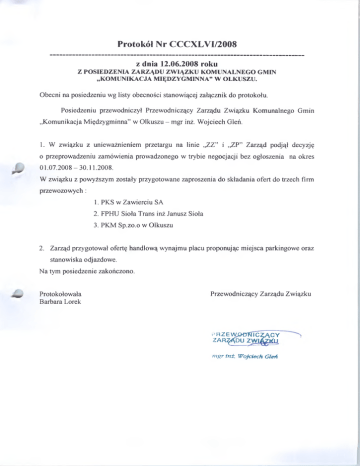 Protokół Nr CCCXLVI/2008 z dnia 12.06.2008 roku z POSIEDZENIA ZARZĄDU ZWIĄZKU KOMUNALNEGO GMIN „KOMUNIKACJA MIĘDZYGMINNA” W OLKUSZU. Obecni na posiedzeniu wg listy obecności stanowiącej załącznik do protokołu. Posiedzeniu przewodniczył Przewodniczący Zarządu Związku Komunalnego Gmin „Komunikacja Międzygminna” w Olkuszu - mgr inż. Wojciech Gleń. 1. W związku z unieważnieniem przetargu na linie ,^ Z ” i ,^ P ” Zarząd podjął decyzję o przeprowadzeniu zamówienia prowadzonego w trybie negocjacji bez ogłoszenia na okres 01.07.2008-30.11.2008. W związku z powyższym zostały przygotowane zaproszenia do składania ofert do trzech firm przewozowych: 1. PKS w Zawierciu SA 2. FPHU Sioła Trans inż Janusz Sioła 3. PKM Sp.zo.o w Olkuszu 2. Zarząd przygotował ofertę handlową wynajmu placu proponując miejsca parkingowe oraz stanowiska odjazdowe. Na tym posiedzenie zakończono. Protokołowała Barbara Lorek Przewodniczący Zarządu Związku .^R Z E W j^erR T c^C Y ZA R^ ^ D U z w i t k u mgr inż, Wojciech Gleń ZWIĄZEK KOMUNALNY GMIN KOMUNIKACJA MIĘDZYGMINNA WOLKUSZU 32-300 Olkusz Siedziba Związku: ul. Aleja 1000 lecia 2c tel. (032) 641 39 14, (032) 754 75 93 REGON 273893532 NIP 637-18- 07- 390 OFERTA HANDLOWA WYNAJMU PLACU PRZY UL. SKŁADOWEJ /dawny dworzec PKS/ Związek Komunalny Gmin Komunikacja Międzygminna, proponuje miejsca parkingowe oraz stanowiska odjazdowe położone na dworcu autobusowym przy ul. Składowej w Olkuszu. www.zkgkm-olkusz.pl - 140"-• / >V-«]Si»a .1 i* ił ? V*.. I-* ivi*^ X ES Eł S I Cl % X X> X \ . (^ri3«v}*ckirgo 7«1 8 i d ' tń V;<pA>v** Ea 3 \ \ •'‘W!... 791 Oferujemy: > > > > 2 przystanek i miejsca parkingowe o łącznej powierzchni 2760 m atrakcyjną lokalizację w centrum Olkusza, obok dworca PKP korzystne ceny umowę na czas określony ^ www.zkgkm-olkusz.pl Cennik opłat za korzystanie z placu Lp. 1. Opłaty Cena netto Cena brutto ► autobus/autokar /powyżej 40 miejsc/ 400.00 488.00 ► midibus 300.00 366.00 200.00 244.00 ► autobus/autokar /powyżej 40 miejsc/ 5.00 6,10 ► midibus /30-40 miejsc/ 4.00 4,88 ► minibus /do 30 miejsc/ 3.00 Ryczałt miesięczny za miejsce parkingowe sg s 2. /30-40 miejsc/ ► minibus /do 30 miejsc/ Opłaty za miejsce parkingowe /za godzinę/ 3;60 A 3. 1,00 1,22 ► autobus/autokar /powyżej 40 miejsc/ 50.00 61,00 ► midibus /30-40 miejsc/ 40.00 48,80 ► minibus /do 30 miejsc/ 30.00 36,60 10.00 12.20 ► autobus/autokar /powyżej 40 miejsc/ 6,00 7,32 ► midibus 5.00 6,10 2.00 6,00 10% prowizji 20,00 2,44 7,32 10% prowizji 24,40 30,00 36,6 100,00 122,00 ► osobowy Opłaty za miejsce parkingowe /za dobę/ 113.20 4. 5. 6. 7. 8. 9. ► osobowy Za odprawę kursu* /30-40 miejsc/ ► minibus /do 30 miejsc/ Za dodatkowy uzgodniony wjazd* Za prowadzenie sprzedaży biletów jednorazowych! Za nieuzgodniony wjazd na plac Za przedłużenie postoju na stanowisku z winy przewoźnika Za każdy przypadek zabrudzenia placu płynami eksploatacyjnymi www.zkgkm-oIkusz.pl Q)0 ) /f; oo * # *W przypadku dużej ilości wjazdów na dobę ZKGKM przewiduje atrakcyjny system bonifikat Ilość wjazdów na dobę Bonifikata % 15% 4-5 30% 6-10 50% powyżej 10 Zasady korzystania z placu Użytkownicy są zobowiązani szczególności: do przestrzegania warunków umowy, a w ■ terminowe regulowanie należności za korzystanie z placu ■ planowy przyjazd i odjazd autobusów ■ utrzymanie porządku na zajmowanym przez siebie stanowisku www.zkgkm-olkusz.pl