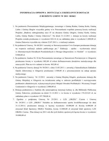 INFORMACJA OPISOWA DOTYCZĄCA UDZIELONYCH DOTACJI Z BUDŻETU GMINY W 2011 ROKU 1. Na podstawie Porozumienia Międzygminnego, zawartego z Gminą Rudna, Gminą Kotla, Gminą Lubin i Gminą Głogów wszystkie gminy w/w Porozumienia wspólnie ponoszą koszty realizacji Projektu „Budowa subregionalnej sieci IT na obszarze Gminy Głogów, Gminy Kotla, Gminy Lubin, Gminy Rudna i Gminy Żukowice”. Na dzień 31.12.2011 r. dotacja na koszty realizacji Projektu została przekazana w wysokości 822,14 zł, na zakładany plan w wysokości 2.400,00 zł. Gmina Żukowice wycofała się z dniem 25.07.2011 r. z realizacji zadania. 2. Na podstawie Umowy Nr 68/2011 zawartej ze Stowarzyszeniem Civis Europae przekazano dotację na wsparcie realizacji zadania publicznego pn.:” Edukacja - opieka - wychowanie dzieci w Alternatywnych Ośrodkach Przedszkolnych w Brzegu Głogowskim i w Nielubi” w wysokości 9.900,00 zł. 3. Na podstawie Aneksu Nr 10 do Porozumienia zawartego ze Starostwem Powiatowym w Głogowie przekazano kwotę w wysokości 802,00 zł celem dofinansowania doradztwa metodycznego dla nauczycieli. Plan na w/w zadanie to kwota 802,00 zł. 4. Na podstawie Umowy dotacji Nr 58/2011 z dnia 13.05.2011 r. zawartej z Samodzielnym Zakładem Opieki Zdrowotnej w Głogowie przekazano 3.500,00 zł z przeznaczeniem na zakup sprzętu medycznego. 5. Na podstawie Umowy Nr 15/2011 zawartej z Gminą Miejską Głogów, przekazano dotację dla Gminy Miejskiej w Głogowie na świadczenia usług w zakresie profilaktyki i rozwiązywania problemów alkoholowych, wykonywanych przez Miejski Ośrodek Profilaktyki i Wczesnej Terapii Uzależnień w Głogowie w wysokości 2.000,00 zł. 6. Dotacja podmiotowa z budżetu dla samorządowej instytucji kultury tj. dla Biblioteki Publicznej Gminy Żukowice, przekazana na dzień 31.12.2011 r. to kwota w wysokości 174.223,83 zł, na zakładany plan w wysokości 197.700,00 zł. 7. Zgodnie z podpisaną Umową Nr 25/2011 z LZS „ORZEŁ” Czerna i Umową Nr 24/2011 z LZS „ISKRA” Nielubia na dofinansowanie sportu kwalifikowanego do dnia 31.12.2011r. przekazano dotację w łącznej wysokości 18.000,00 zł. Kwotę 6.000,00 zł otrzymał Klub Sportowy ISKRA Nielubia, kwotę 12.000,00 zł otrzymał klub sportowy LZS ORZEŁ Czerna. Plan dotacji na 2011 rok dla tych klubów sportowych łączna kwota w wysokości 18.000,00 zł.
