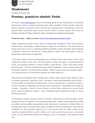 Wiadomości Czwartek, 28 stycznia 2016 Prosimy, pomóżcie obudzić Pawła Na stronie www.siepomaga.pl został uruchomiony profil Pawła Grabowskiego, 24-letniego gorliczanina, który w sierpniu minionego roku uległ wypadkowi. Paweł zapadł w śpiączkę. Jedyną nadzieją na poprawę stanu zdrowia jest specjalistyczna rehabilitacja, która jest jednak bardzo kosztowna. Jeden turnus kosztuje około 22 tysięcy złotych. Aby Paweł się obudził, potrzeba ich kilka. Pomóżcie zebrać potrzebne na rehabilitację pieniądze. Wesprzyj akcję - wejdź na stronę: http://www.siepomaga.pl/obudzic-pawla Ciepły, sierpniowy wieczór. Gorlice. Paweł z Gabrysią idą chodnikiem. Poszli zrobić zakupy i pospacerować, korzystając z pięknej pogody. Znają się od niedawna. Ona przechodzi na drugą stronę ulicy. On nie. Z ogromną prędkością wjeżdża w niego samochód. Paweł wylatuje z impetem w powietrze. Głuchy huk. Uderza głową w asfalt. Traci przytomność. Robi się zbiegowisko, ktoś dzwoni po pogotowie... - Wracałam wtedy do domu. Wzdrygnęłam się na dźwięk wozów strażackich, które z dużą szybkością jechały w górę ulicy. Za nimi karetka, policja. Ale nigdy, w najokropniejszych snach, nie przypuszczałabym, że może chodzić o moje dziecko – mówi cicho mama Pawła, pani Krystyna. - Do domu wpadła dziewczyna Pawła. Myślałam, że może czegoś zapomnieli, wychodzili niedawno. Paweł był taki szczęśliwy, radości w jego oczach nie zapomnę nigdy… A tu Gabrysia krzyczy, że Paweł miał wypadek, że trzeba szybko iść… Pani Krystyna nie pamięta wiele z tamtego dnia. Panika, chaos, tysiące myśli. Ścięło ją z nóg, nie mogła się poruszyć, oddychać, wstać. Na miejsce natychmiast pojechała siostra Pawła. – Leżał na jezdni, nie miał buta na jednej nodze, z jego ust leciała krew – wspomina ze łzami w oczach. Początkowo chłopakowi nie dawano szans na przeżycie. - Powiedzieli mi że pękła mu czaszka – wspomina - Ponoć to nawet dobrze, bo krew która zebrała się w głowie miała ujście. Inaczej doszłoby do obrzęku – mówi. Nastąpiło jednak uszkodzenie mózgu. Te słowa brzmiały jak wyrok. Z gorlickiego szpitala chłopak trafił do Tarnowa. Operowali go neurochirurdzy. Kazali przygotować się na najgorsze. Nie przeżyje drugiej doby – mówili. Paweł jednak nie poddał się. Jakby słuchał modlitw zrozpaczonej matki, dziewczyny, rodzeństwa. Przeżył. Mimo, że sytuacja była trudna, po trzecim dniu udało się odłączyć Pawła od respiratora. Pani Krystyna rozpłakała się, gdy usłyszała oddech syna. Czuła się jak wtedy tak, jakby cofnęła się do momentu przyjścia Pawła na świat. Jakby po 24 latach urodził się ponownie. Zrozumiała wtedy, że wola przetrwania Pawła jest silniejsza od zła. Od wypadku. Od zrządzenia złego losu. Paweł jednak jest w śpiączce, choć ma otwarte oczy. Oddycha, patrzy. Mama jest przy nim codziennie. Opowiada mu o wszystkim – o tym, co się dzieje w rodzinie, mieście, na świecie… Według mamy Paweł wodzi wzrokiem, szuka źródła dźwięku, reaguje, gdy ktoś do niego mówi. Nie da się jednak jednoznacznie stwierdzić, jakie bodźce do niego docierają. Lekarze są jednak zgodni co do jednego: Paweł powinien być niezwłocznie rehabilitowany, żeby pobudzić do pracy układ nerwowy. Przed Pawłem pojawia się światełko w tunelu. Szansą dla niego jest specjalistyczna neurorehabilitacja dla osób w śpiączce w Krakowie w Centrum Rehabilitacji Funkcjonalnej. Tam Paweł przejdzie rehabilitację funkcjonalną i neurologopedyczną, pobudzająca do pracy mięśnie przełyku, próbę pionizacji do pozycji siedzącej, ćwiczenia na cyber oku - urządzeniu, które pozwala na komunikację z otoczeniem osób znajdujących się w śpiączce oraz rehabilitację metodą Moralesa stymulująca pracę mięśni biorących udział w procesie mówienia. Rehabilitacja jest bardzo kosztowna. Jeden turnus kosztuje około 22 tysięcy złotych. Aby Paweł się obudził, potrzeba ich kilka. Podczas grudniowej zbiórki zorganizowanej przez Fundację Beskidzka Zima, pod której opieką znajduje się Paweł oraz Gazetę Gorlicką, udało się zebrać połowę kwoty na jeden turnus. Paweł jest na nim teraz – kończy się 6 lutego. Jeśli jednak nie zostanie przelana reszta kwoty, chłopak nie przejdzie całej rehabilitacji, nie będzie miał wielu zabiegów, które mogą mu pomóc. Konieczne jest też uzbieranie kwoty na kolejne turnusy. Kwota ta przekracza znacznie możliwości finansowe rodziny, mimo, że starają się zrobić wszystko, żeby mu pomóc. Mama Pawła czuwa przy nim non stop. Dniami i nocami. Godzinami wpatruje się w twarz syna, trzyma go za rękę. Pawła odwiedzają też koledzy, pewnego razu przy jego łóżku było ich dziesięcioro. Był – jest - dobrym chłopakiem, bardzo lubianym. Każdemu by pomógł. Nikt nie może uwierzyć, że spotkał go taki straszny los. Rodzeństwo, gdyby mogło, byłoby przy nim non stop. Mama Pawła codziennie włącza mu Skype – mówią do niego bracia, siostry, babcia. Paweł patrzy na nich, są przekonani, że rozumie. Mama potrafi też wyczuć jego emocje, widzi, że odkąd są w Centrum Rehabilitacji Funkcjonalnej, jest spokojniejszy, szczęśliwszy. Wierzy, że Paweł kiedyś się obudzi, że dojdzie do siebie. Siostra Pawła codziennie musi mijać miejsce wypadku. Przechodzi na drugą stronę, odwracając wzrok. Chłopak, który wjechał samochodem w Pawła, jest na wolności. Odebrano mu prawo jazdy. Toczy się wobec niego sprawa w prokuraturze, grozi mu od sześciu miesięcy do ośmiu lat więzienia. Nie uważa się za winnego. Rodzina podkreśla, że sprawa kary ma dla nich drugorzędne znaczenie. Najważniejsze jest dla nich życie i zdrowie Pawła, w walce o które liczą się nie tylko pieniądze – a znaczenie ma każda złotówka, każdy najmniejszy nawet gest dobrej woli – ale także czas. Żródło: www.siepomaga