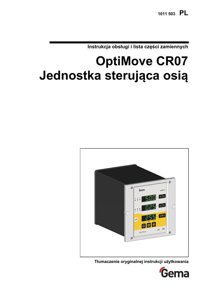1011 503 PL Instrukcja obsługi i lista części zamiennych OptiMove CR07 Jednostka sterująca osią Tłumaczenie oryginalnej instrukcji użytkowania V 12/13 Dokumentacja OptiMove CR07 © Prawa autorskie 2006 Gema Switzerland GmbH Wszystkie prawa zastrzeżone. Publikacja chroniona prawem autorskim. Kopiowanie bez autoryzacji jest niedozwolone. Żadna z części tej publikacji nie może być reprodukowana, kopiowana, tłumaczona lub transmitowana w jakiejkolwiek formie, ani w całości ani częściowo bez pisemnej zgody firmy Gema Switzerland GmbH. MagicCompact, MagicCylinder, MagicPlus, MagicControl, OptiFlex, OptiControl, OptiGun, OptiSelect, OptiStar i SuperCorona są zarejestrowanymi znakami towarowymi firmy Gema Switzerland GmbH. OptiFlow, OptiCenter, OptiMove, OptiSpeeder, OptiFeed, OptiSpray, OptiSieve, OptiAir, OptiPlus, OptiMaster, MultiTronic, EquiFlow, Precise Charge Control (PCC), Smart Inline Technology (SIT) i Digital Valve Control (DVC) są znakami towarowymi firmy Gema Switzerland GmbH. Wszystkie inne nazwy produktów są znakami towarowymi lub zarejestrowanymi znakami towarowymi ich poszczególnych właścicieli. W tej instrukcji jest zrobione odniesienie do różnych znaków towarowych i zarejestrowanych znaków towarowych. Takie odniesienia nie oznaczają, że producenci, o których mowa aprobują lub są w jakikolwiek sposób związani przez tę instrukcję. Usiłujemy zachować zapis ortograficzny znaków towarowych i zarejestrowanych znaków towarowych właścicieli praw autorskich. Cała nasza wiedza i informacje zawarte w tej publikacji były aktualizowane i ważne w dniu oddania do druku. Firma Gema Switzerland GmbH nie ponosi odpowiedzialności gwarancyjnej odnośnie interpretacji zawartości tej publikacji, rezerwuje sobie prawo do rewizji publikacji oraz do robienia zmian jej zawartości bez wcześniejszego zawiadomienia. Najnowsze informacje na temat produktów firmy Gema można znaleźć w witrynie www.gemapowdercoating.com. Informacje dotyczące patentów można znaleźć w witrynie www.gemapowdercoating.com/patents lub www.gemapowdercoating.us/patents. Wydrukowano w Szwajcarii Gema Switzerland GmbH Mövenstrasse 17 9015 St.Gallen Szwajcaria Tel: +41-71-313 83 00 Fax.:+41-71-313 83 83 E-Mail: [email protected] V 12/13 Spis treści Ogólne zasady bezpieczeństwa 5 Symbole bezpieczeństwa (piktogramy) .................................................................. 5 Zgodność użycia ..................................................................................................... 5 Szczególne środki bezpieczeństwa ........................................................................ 6 Środki bezpieczeństwa specyficzne dla produktu .................................................. 6 Jednostka sterująca osią OptiMove CR07................................................. 6 Szczególne środki bezpieczeństwa ........................................................................ 7 O tej instrukcji 9 Informacje ogólne ................................................................................................... 9 Opis urządzenia 11 Ważne wskazówki ................................................................................................. 11 Panel operacyjny ..................................................................................... 11 Zakres stosowania ................................................................................................ 12 Parametry techniczne 13 OptiMove CR07 Jednostka sterująca osią ............................................................ 13 Informacje ogólne .................................................................................... 13 Parametry elektryczne ............................................................................. 13 Wymiary ................................................................................................... 13 Budowa i funkcje 15 OptiMove CR07 Jednostka sterująca osią - struktura .......................................... 15 Opis funkcji............................................................................................................ 15 Konfiguracja ............................................................................................. 16 Elementy sterowania i wyświetlacze, Tryby operacyjne 17 Wyświetlacze i przyciski ........................................................................................ 17 Tryby operacyjne .................................................................................................. 20 Ogólnie ..................................................................................................... 20 Tryb operacyjny - ręczny.......................................................................... 20 Zdalny tryb operacyjny ............................................................................. 20 Blokada klawiatury ................................................................................... 21 Uruchomienie 23 Przyłącza na tylnej ścianie .................................................................................... 23 Przygotowanie do uruchomienia ........................................................................... 24 Informacje niezbędne do uruchomienia ................................................... 24 Okablowanie i ekranowanie elektryczne.................................................. 24 Ustawianie parametrów systemowych .................................................................. 24 Parametr systemowy P1 - Ustawianie górnej granicy skoku ................... 26 Działanie 27 Działanie sterownika manipulatora ....................................................................... 27 OptiMove CR07 Ogólne zasady bezpieczeństwa • 1 V 12/13 Włączanie sterownika manipulatora ..................................................................... 27 Dojazd do punktu odniesienia ............................................................
