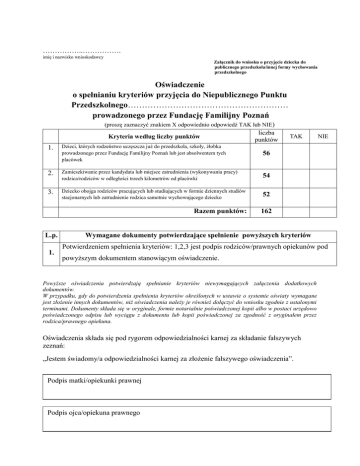 ……………..……………. imię i nazwisko wnioskodawcy Załącznik do wniosku o przyjęcie dziecka do publicznego przedszkola/innej formy wychowania przedszkolnego Oświadczenie o spełnianiu kryteriów przyjęcia do Niepublicznego Punktu Przedszkolnego………………………………………………… prowadzonego przez Fundację Familijny Poznań (proszę zaznaczyć znakiem X odpowiednio odpowiedź TAK lub NIE ) Kryteria według liczby punktów liczba punktów 1. Dzieci, których rodzeństwo uczęszcza już do przedszkola, szkoły, żłobka prowadzonego przez Fundację Familijny Poznań lub jest absolwentem tych placówek 56 2. Zamieszkiwanie przez kandydata lub miejsce zatrudnienia (wykonywania pracy) rodzica/rodziców w odległości trzech kilometrów od placówki 54 3. Dziecko obojga rodziców pracujących lub studiujących w formie dziennych studiów stacjonarnych lub zatrudnienie rodzica samotnie wychowującego dziecko 52 Razem punktów: L.p. 1. TAK NIE 162 Wymagane dokumenty potwierdzające spełnienie powyższych kryteriów Potwierdzeniem spełnienia kryteriów: 1,2,3 jest podpis rodziców/prawnych opiekunów pod powyższym dokumentem stanowiącym oświadczenie. Powyższe oświadczenia potwierdzają spełnianie kryteriów niewymagających załączenia dodatkowych dokumentów. W przypadku, gdy do potwierdzenia spełnienia kryteriów określonych w ustawie o systemie oświaty wymagane jest złożenie innych dokumentów, niż oświadczenia należy je również dołączyć do wniosku zgodnie z ustalonymi terminami. Dokumenty składa się w oryginale, formie notarialnie poświadczonej kopii albo w postaci urzędowo poświadczonego odpisu lub wyciągu z dokumentu lub kopii poświadczonej za zgodność z oryginałem przez rodzica/prawnego opiekuna. Oświadczenia składa się pod rygorem odpowiedzialności karnej za składanie fałszywych zeznań: „Jestem świadomy/a odpowiedzialności karnej za złożenie fałszywego oświadczenia”. Podpismatki/opiekunki matki/opiekunkiprawnej prawnej Podpis Podpis ojca/opiekuna prawnego
