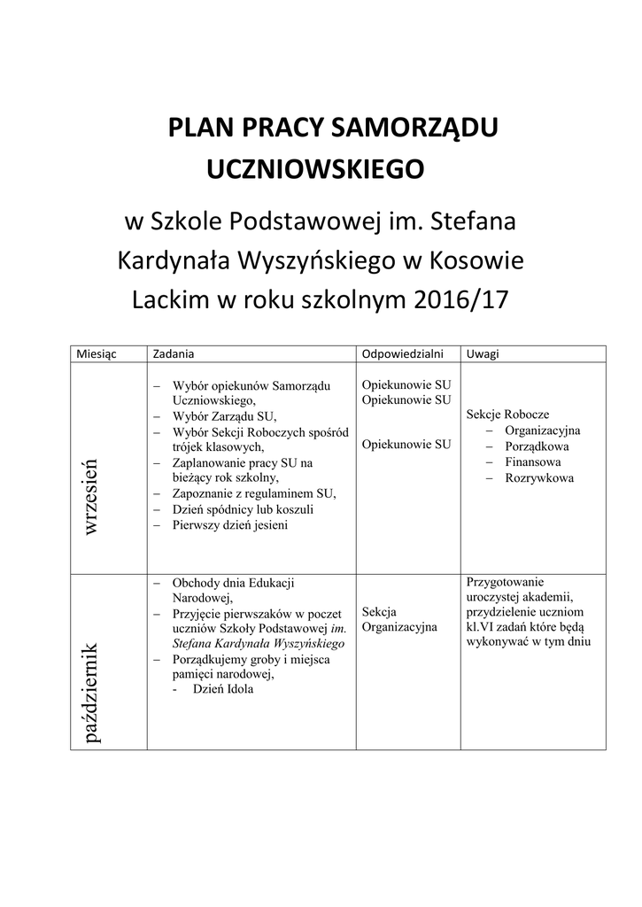PLAN PRACY SAMORZĄDU UCZNIOWSKIEGO w Szkole