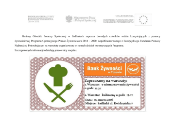 Gminny Ośrodek Pomocy Społecznej w Sadlinkach zaprasza dorosłych członków rodzin korzystających z pomocy żywnościowej Programu Operacyjnego Pomoc Żywnościowa 2014 – 2020, współfinansowanego z Europejskiego Funduszu Pomocy Najbardziej Potrzebującym na warsztaty organizowane w ramach działań towarzyszących Programu. Szczegółowych informacji udzielają pracownicy socjalni.