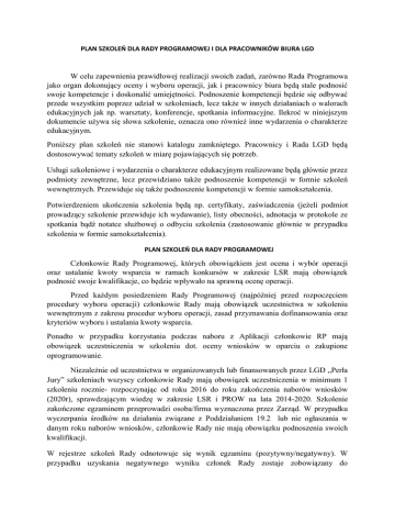 PLAN SZKOLEŃ DLA RADY PROGRAMOWEJ I DLA PRACOWNIKÓW BIURA LGD W celu zapewnienia prawidłowej realizacji swoich zadań, zarówno Rada Programowa jako organ dokonujący oceny i wyboru operacji, jak i pracownicy biura będą stale podnosić swoje kompetencje i doskonalić umiejętności. Podnoszenie kompetencji będzie się odbywać przede wszystkim poprzez udział w szkoleniach, lecz także w innych działaniach o walorach edukacyjnych jak np. warsztaty, konferencje, spotkania informacyjne. Ilekroć w niniejszym dokumencie używa się słowa szkolenie, oznacza ono również inne wydarzenia o charakterze edukacyjnym. Poniższy plan szkoleń nie stanowi katalogu zamkniętego. Pracownicy i Rada LGD będą dostosowywać tematy szkoleń w miarę pojawiających się potrzeb. Usługi szkoleniowe i wydarzenia o charakterze edukacyjnym realizowane będą głównie przez podmioty zewnętrzne, lecz przewidziano także podnoszenie kompetencji w formie szkoleń wewnętrznych. Przewiduje się także podnoszenie kompetencji w formie samokształcenia. Potwierdzeniem ukończenia szkolenia będą np. certyfikaty, zaświadczenia (jeżeli podmiot prowadzący szkolenie przewiduje ich wydawanie), listy obecności, adnotacja w protokole ze spotkania bądź notatce służbowej o odbyciu szkolenia (zastosowanie głównie w przypadku szkolenia w formie samokształcenia). PLAN SZKOLEŃ DLA RADY PROGRAMOWEJ Członkowie Rady Programowej, których obowiązkiem jest ocena i wybór operacji oraz ustalanie kwoty wsparcia w ramach konkursów w zakresie LSR mają obowiązek podnosić swoje kwalifikacje, co będzie wpływało na sprawną ocenę operacji. Przed każdym posiedzeniem Rady Programowej (najpóźniej przed rozpoczęciem procedury wyboru operacji) członkowie Rady mają obowiązek uczestnictwa w szkoleniu wewnętrznym z zakresu procedur wyboru operacji, zasad przyznawania dofinansowania oraz kryteriów wyboru i ustalania kwoty wsparcia. Ponadto w przypadku korzystania podczas naboru z Aplikacji członkowie RP mają obowiązek uczestniczenia w szkoleniu dot. oceny wniosków w oparciu o zakupione oprogramowanie. Niezależnie od uczestnictwa w organizowanych lub finansowanych przez LGD „Perła Jury” szkoleniach wszyscy członkowie Rady mają obowiązek uczestniczenia w minimum 1 szkoleniu rocznie- rozpoczynając od roku 2016 do roku zakończenia naborów wniosków (2020r), sprawdzającym wiedzę w zakresie LSR i PROW na lata 2014-2020. Szkolenie zakończone egzaminem przeprowadzi osoba/firma wyznaczona przez Zarząd. W przypadku wyczerpania środków na działania związane z Poddziałaniem 19.2 lub nie ogłaszania w danym roku naborów wniosków, członkowie Rady nie mają obowiązku podnoszenia swoich kwalifikacji. W rejestrze szkoleń Rady odnotowuje się wynik egzaminu (pozytywny/negatywny). W przypadku uzyskania negatywnego wyniku członek Rady zostaje zobowiązany do przystąpienia do egzaminu poprawkowego nie później niż w przeciągu tygodnia od uzyskania oceny negatywnej. W przypadku zaistnienia analogicznej sytuacji członek Rady na wniosek Przewodniczącego zostaje wykluczony z dokonywania wyboru operacji, co nie zwalnia go z obowiązku uczestnictwa w posiedzeniach Rady. Wykluczenie obowiązuje do momentu uzyskania pozytywnego wyniku z egzaminu. 2016r – przed ogłoszeniem pierwszych konkursów, zgodnie z umową o warunkach i sposobie realizacji strategii rozwoju kierowanego przez społeczność. Szkolenie wewnętrzne prowadzone przez osobę wyznaczoną przez Zarząd- w którym mają obowiązek uczestniczyć wszyscy członkowie Rady Programowej. W przypadku zmiany dokumentów związanych z oceną i wyborem operacji członkowie Rady zostaną niezwłocznie przeszkoleni w zakresie dot. ww. zmian. Zakres szkolenia: - informacje dot. procedur LGD w zakresie wyboru i oceny operacji; - informacje z zakresu oceny kryteriów wyboru operacji; - zgodność operacji z PROW 2014-2020 oraz celami LSR; - ustalanie kwoty wsparcia operacji. 2017r – szkolenie dot. procesu oceny i wyboru operacji ( dla członków Rady skierowanych przez Przewodniczącego Rady w skutek nieprzestrzegania Regulaminu Rady). Szkolenie będzie organizowane każdorazowo w przypadku zebrania się grupy min. 5 osób niewywiązujących się z obowiązków przestrzegania Regulaminu Rady. W przypadkach indywidualnych istnieje możliwość indywidualnego przeszkolenia członka Rady poprzez np. skierowanie go na szkolenie organizowane przez podmiot inny niż LGD. 2017r / 2018r - szkolenie w szczególności dla nowych członków Rady Programowej przeprowadzone na skutek wygaśnięcia kadencji poprzedniej Rady. Szkolenie przeprowadzane najpóźniej przed ogłoszeniem pierwszego konkursu na realizacje działań w LSR przez LGD „Perła Jury” następującego po wyborze Rady. W przypadku trwania konkursu (naboru wniosków) w okresie zmiany członków Rady ocena operacji dokonywana jest przez nowo wybraną Radę, przy konieczności wcześniejszego przeszkolenia nowych członków (np. przed rozpoczęciem procedury wyboru operacji). Szkolenie będzie organizowane każdorazowo w przypadku ukonstytuowania się nowej Rady, a w przypadku zmiany poszczególnych członków szkolenie będzie dot. tylko nowych członków Rady. Szkolenia uzupełniające: Rada Programowa będzie zobowiązana do uczestnictwa w szkoleniach organizowanych przez podmioty zewnętrzne, o ile zakres szkolenia będzie tożsamy z potrzebami Rady a Zarząd skieruje członków Rady na szkolenie. W szkoleniach mogą brać udział również osoby będące członkami LGD (za skierowaniem Zarządu), które w przyszłości mogą stanowić kadrę uzupełniającą Rady Programowej. PLAN SZKOLEŃ DLA PRACOWNIKÓW BIURA LGD Pracownicy zatrudnieni w LGD „Perła Jury” mają obowiązek podnosić swoje kwalifikacje, co będzie miało wpływ na sprawną realizację działań związanych z funkcjonowaniem LGD oraz animowaniem społeczności lokalnych, a także wdrażaniem Strategii Rozwoju Lokalne