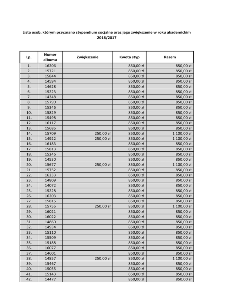 Lp. Numer albumu Zwiększenie Kwota styp Razem 1. 16206 850,00