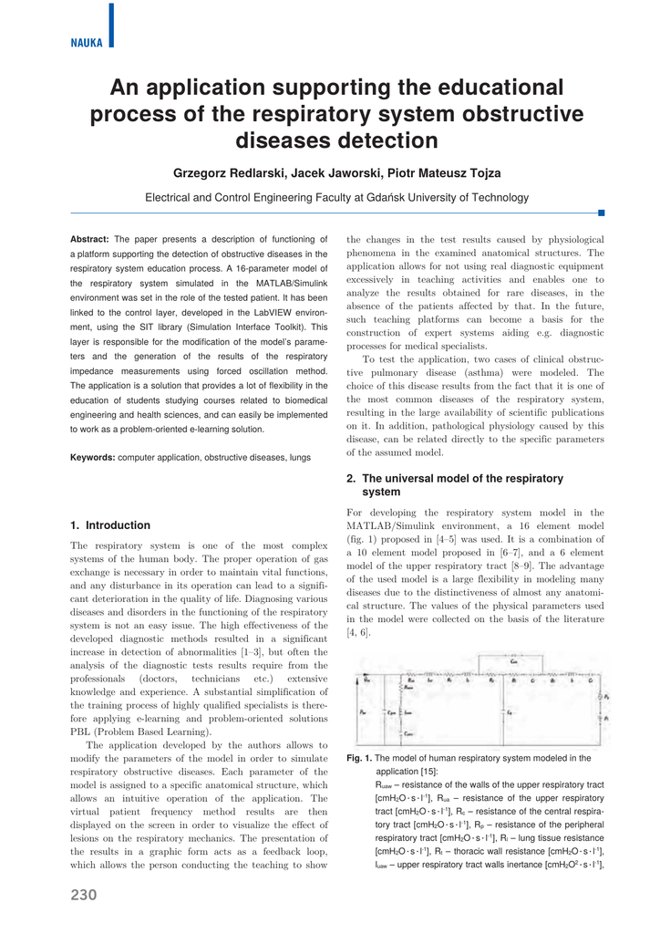 NAUKA An application supporting the educational process of the respiratory system obstructive diseases detection Grzegorz Redlarski, Jacek Jaworski, Piotr Mateusz Tojza Electrical and Control Engineering Faculty at Gdańsk University of Technology Abstract: The paper presents a description of functioning of a platform supporting the detection of obstructive diseases in the respiratory system education process. A 16-parameter model of the respiratory system simulated in the MATLAB/Simulink environment was set in the role of the tested patient. It has been linked to the control layer, developed in the LabVIEW environment, using the SIT library (Simulation Interface Toolkit). This layer is responsible for the modification of the model’s parameters and the generation of the results of the respiratory impedance measurements using forced oscillation method. The application is a solution that provides a lot of flexibility in the education of students studying courses related to biomedical engineering and health sciences, and can easily be implemented to work as a problem-oriented e-learning solution. Keywords: computer application, obstructive diseases, lungs the changes in the test results caused by physiological phenomena in the examined anatomical structures. The application allows for not using real diagnostic equipment excessively in teaching activities and enables one to analyze the results obtained for rare diseases, in the absence of the patients affected by that. In the future, such teaching platforms can become a basis for the construction of expert systems aiding e.g. diagnostic processes for medical specialists. To test the application, two cases of clinical obstructive pulmonary disease (asthma) were modeled. The choice of this disease results from the fact that it is one of the most common diseases of the respiratory system, resulting in the large availability of scientific publications on it. In addition, pathological physiology caused by this disease, can be related directly to the specific parameters of the assumed model. 2. The universal model of the respiratory system 1. Introduction The respiratory system is one of the most complex systems of the human body. The proper operation of gas exchange is necessary in order to maintain vital functions, and any disturbance in its operation can lead to a significant deterioration in the quality of life. Diagnosing various diseases and disorders in the functioning of the respiratory system is not an easy issue. The high effectiveness of the developed diagnostic methods resulted in a significant increase in detection of abnormalities [1–3], but often the analysis of the diagnostic tests results require from the professionals (doctors, technicians etc.) extensive knowledge and experience. A substantial simplification of the training process of highly qualified specialists is therefore applying e-learning and problem-oriented solutions PBL (Problem Based Learning). The application developed by the authors allows to modify the parameters of the model in order to simulate respiratory obstructive diseases. Each parameter of the model is assigned to a specific anatomical structure, which allows an intuitive operation of the application. The virtual patient frequency method results are then displayed on the screen in order to visualize the effect of lesions on the respiratory mechanics. The presentation of the results in a graphic form acts as a feedback loop, which allows the person conducting the teaching to show 230 For developing the respiratory system model in the MATLAB/Simulink environment, a 16 element model (fig. 1) proposed in [4–5] was used. It is a combination of a 10 element model proposed in [6–7], and a 6 element model of the upper respiratory tract [8–9]. The advantage of the used model is a large flexibility in modeling many diseases due to the distinctiveness of almost any anatomical structure. The values of the physical parameters used in the model were collected on the basis of the literature [4, 6]. Fig. Fig. 1. 1. The The model model of of human human respiratory respiratory system system modeled modeled in in the the application [15]: application [15]: – resistance of the walls of the upper respiratory tract R Ruaw uaw – resistance of the walls of the upper respiratory tract -1 – resistance of the upper respiratory [cmH OÂsÂl-1], ], R Rua [cmH22OÂsÂl ua – resistance of the upper respiratory -1 tract [cmH 2OÂsÂl-1], Rc – resistance of the central respiratract [cmH OÂsÂl ], R – resistance of the central respira2 c -1 tory OÂsÂl-1], ], R Rpp – – resistance resistance of of the the peripheral peripheral tory tract tract [cmH [cmH22OÂsÂl -1 respiratory tract [cmH 2OÂsÂl-1], Rl – lung tissue resistance respiratory tract [cmH2OÂsÂl ], Rl – lung tissue resistance -1 -1 [cmH OÂsÂl-1], ], R Rt – – thoracic thoracic wall wall resistance resistance [cmH [cmH2OÂsÂl OÂsÂl-1], ], [cmH2OÂsÂl 2 t 2 upper respiratory tract walls inertance [cmH2O22ÂsÂl-1 lluaw – -1], uaw – upper respiratory tract walls inertance [cmH2O ÂsÂl ], lua – upper respiratory tract inertance [cmH2O2ÂsÂl-1], Ic – central respiratory tract inertance [cmH2O2ÂsÂl-1], lt – thoracic wall inertance [cmH2O2ÂsÂl-1], Cgua – oral cavity gas compliance [cmH2O Âl], Cuaw – upper respiratory tract walls -1 compliance [cmH2O-1Âl], Caw – bronchial walls compliance [cmH2O-1Âl], Cg – alveoli gas compliance [cmH2O-1Âl], Cl – lung tissue compliance [cmH2O-1Âl], Ct – thoracic wall compliance [cmH2O Âl], Pg – variable -1 breathing cycle pressure [cmH2O], Pt – thorax tissue tension [cmH2O], Pao – respiratory tract outlet pressure [cmH2O], dVao/dt – respiratory tract outlet flow [l/s] Rys. 1. Model układu oddechowego człowieka zamodelowany w aplikacji [15]: Ruaw – oporność ścian górnych dróg oddechowych [cmH2OÂsÂl-1], Rua – oporność górnych dróg oddechowych [cmH2OÂsÂl-