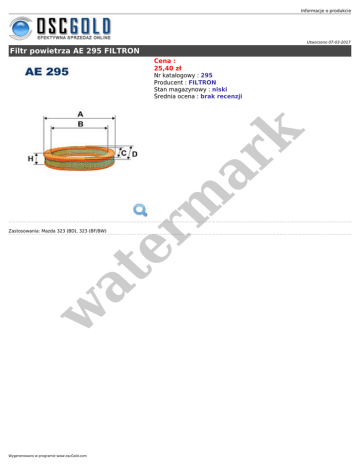 Informacje o produkcie Utworzono 07-03-2017 Filtr powietrza AE 295 FILTRON Cena : 25,40 zł er m ar k Nr katalogowy : 295 Producent : FILTRON Stan magazynowy : niski Średnia ocena : brak recenzji w at Zastosowania: Mazda 323 (BD), 323 (BF/BW) Wygenerowano w programie www.oscGold.com