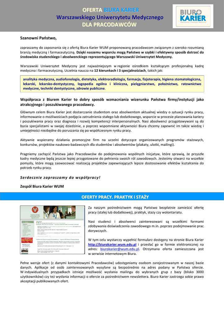 OFERTA BIURA KARIER Warszawskiego Uniwersytetu Medycznego DLA PRACODAWCÓW Szanowni Państwo, zapraszamy do zapoznania się z ofertą Biura Karier WUM proponowaną pracodawcom związanym z szeroko rozumianą branżą medyczną i farmaceutyczną. Dzięki naszemu wsparciu mogą Państwo w szybki i efektywny sposób dotrzeć do środowiska studenckiego i absolwenckiego reprezentującego Warszawski Uniwersytet Medyczny. Warszawski Uniwersytet Medyczny jest najważniejszym w regionie ośrodkiem kształcącym profesjonalną kadrę medyczna i farmaceutyczną. Uczelnia naucza na 12 kierunkach i 3 specjalnościach, takich jak: analityka medyczna, audiofonologia, dietetyka, elektroradiologia, farmacja, fizjoterapia, higiena stomatologiczna, lekarski, lekarsko-dentystyczny, logopedia ogólna i kliniczna, pielęgniarstwo, położnictwo, ratownictwo medyczne, techniki dentystyczne, zdrowie publiczne. Współpraca z Biurem Karier to dobry sposób wzmacniania wizerunku Państwa firmy/instytucji jako atrakcyjnego i poszukiwanego pracodawcy. Głównym celem Biura Karier jest dostarczanie studentom oraz absolwentom aktualnej wiedzy o sytuacji rynku pracy, informowanie o możliwościach podjęcia zatrudnienia stałego lub dodatkowego, wsparcie w procesie planowania kariery i poszukiwania pracy oraz diagnoza i rozwój kompetencji interpersonalnych. Nasi absolwenci przygotowywani są do bycia specjalistami w swojej dziedzinie, a poprzez wspomniane aktywności Biura chcemy zapewnić im także wiedzę i umiejętności niezbędne do poruszania się po współczesnym rynku pracy. Aktywnie wspieramy działania promocyjne firm na uczelni dotyczące organizowanych programów stażowych, konkursów, projektów naukowo-badawczych dla studentów i absolwentów (plakaty, ulotki, mailingi). Pragniemy zachęcić Państwa jako Pracodawców do podejmowania wspólnych inicjatyw, które sprawią, że przyszłe kadry medyczne będą jeszcze lepiej przygotowane do pełnienia swoich ról zawodowych. Jesteśmy otwarci na wszelkie pomysły, które mogą zaowocować realizacją projektów zapewniających lepsze dostosowanie efektów kształcenia do potrzeb rynku pracy. Serdecznie zapraszamy do współpracy! Zespół Biura Karier WUM OFERTY PRACY, PRAKTYK i STAŻY Za naszym pośrednictwem mogą Państwo bezpłatnie zamieścić ofertę pracy (stałej lub dodatkowej), praktyk, staży czy wolontariatu. Nasi studenci i absolwenci zainteresowani są wszelkimi formami zdobywania doświadczenia zawodowego m.in. poprzez podejmowanie prac dorywczych. W tym celu wystarczy wypełnić formularz dostępny na stronie Biura Karier http://biurokarier.wum.edu.pl i przesłać go w formie elektronicznej na adres: [email protected]. Otrzymana oferta zamieszczana jest w serwisie internetowym Biura. Pełne wersje ofert (z danymi kontaktowymi Pracodawców) udostępniamy osobom zarejestrowanym w naszej bazie danych. Aplikacje od osób zainteresowanych wysyłane są bezpośrednio na adres podany w Państwa ofercie. W indywidualnych przypadkach istnieje możliwość wysłania mailingu do wybranych grup z bazy (blisko 3000 użytkowników) czy też wysłania informacji o ofercie za pośrednictwem newslettera. Biuro Karier zastrzega sobie prawo akceptacji publikowanych ofert. SPOTKANIA Z PRACODAWCAMI NA UCZELNI Zachęcamy Państwa także do skorzystania z szansy bezpośredniego kontaktu ze studentami lub absolwentami. To znakomita forma przybliżenia samej firmy/instytucji, oferowanych ścieżek dla rozwoju i kariery czy zasad oraz form rekrutacji – co jest szczególnie interesujące dla osób rozpoczynających drogę zawodową. Dzięki takim spotkaniom mogą Państwo bliżej poznać potencjalnych przyszłych pracowników. Największym zainteresowaniem cieszą się spotkanie zawierające elementy szkoleniowowarsztatowe czy też praktyczne przedstawienie pracy w danym zawodzie i do przyjęcia takiej formuły szczególnie Państwa zachęcamy. Oczywiście spotkanie może również skupiać się wokół rekrutacji do pracy / projektu / na praktyki. Ze swojej strony zapewniamy pomoc w organizacji spotkania oraz promocję wydarzenia w środowisku akademickim. W listopadzie 2011 roku odbyły się Jesienne Spotkania z Medycznym Rynkiem Pracy, podczas których gościliśmy przedstawicieli 18 instytucji, firm oraz organizacji reprezentujących branżę medyczną i farmaceutyczną. Na jesieni 2012 roku zorganizowaliśmy II edycję Spotkań – studenci ponownie mieli okazję uczestniczyć w 18 spotkaniach dotyczących różnorodnych propozycji rozwoju zawodowo-edukacyjnego dla studentów i absolwentów Warszawskiego Uniwersytetu Medycznego. http://spotkania-medyczne.wum.edu.pl/ MEDYCZNE TARGI PRACY Medyczne Targi Pracy to największa tego typu impreza odbywająca się na uczelniach medycznych w Polsce. Zorganizowaliśmy już 6 edycji targów – cieszących się zawsze dużym zainteresowaniem, zarówno ze strony wystawców, jak i samych odwiedzających. To wyjątkowa okazja do spotkania w jednym miejscu przedstawicieli szerokiego spektrum pracodawców związanych z branżą medyczną i farmaceutyczną. Są wśród nich reprezentanci zarówno szpitali publicznych, prywatnych centrów medycznych, firm farmaceutycznych, jednostek badawczych (klinicznych), instytucji publicznych związanych z ochroną zdrowia, aptek oraz firm zajmujących się rekrutacją personelu medycznego. Szczegóły dotyczące poprzednich edycji dostępne są w internetowym serwisie targów: http://mtp.wum.edu.pl W zorganizowanych przez nas imprezach targowych uczestniczyli m.in.: ACP Pharma, Apteki Na Zdrowie, A-Team Recruitment, Boiron, Carolina Medical Center, Centrum Zdrowia Dziecka, Dantex-Med., Dr Max Apteka, Enel Med., EMC Instytut Medyczny, Geers, GlaxoSmithKline, Instytut Żywności i Żywienia, KCR, KRKA, LUX MED, Medicover, Medycyna Rodzinna, Narodowy Fundusz Zdrowia, NES Healthcare, Osteomed, Pfizer, Pliva (obecnie Teva), Polfa Grodzisk, Polfa Tarchomin, Polpharma, Promedis, Servier, Urz