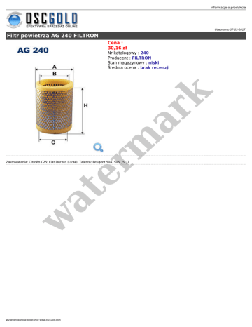Informacje o produkcie Utworzono 07-03-2017 Filtr powietrza AG 240 FILTRON Cena : 30,16 zł er m ar k Nr katalogowy : 240 Producent : FILTRON Stan magazynowy : niski Średnia ocena : brak recenzji w at Zastosowania: Citroën C25; Fiat Ducato (->94), Talento; Peugeot 504, 505, J5, J7 Wygenerowano w programie www.oscGold.com