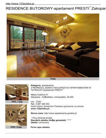 http://www.123polska.pl RESIDENCE BUTOROWY-apartament PRESTI¯ Zakopan 9.jpg Kategoria: apartamenty Z PEWNO¦CI¡ JEDEN Z NAJLEPSZYCH APARTAMENTÓW W TATRACH!!! Apartament PRESTI¯ Nêdzy Kubiñca 51 Zakopane - Ko¶cielisko, ma³opolskie, 34-500 2522_7.jpg min. 270z³ Tel.: 0 667 290 453 Dzieñ Dobry! Zanlaz³em Pañstwa og³oszenie na stronie www.123polska.pl.... Strona www: http://www.apartamenty-gorskie.pl • Przy g³ównej drodze Standard obiektu (ilo¶æ gwiazdek): ***** Obiekt: ca³oroczny 2522_8.jpg Pe³en opis obiektu http://www.123polska.pl 2522_10.jpg 2522_5.jpg sauna.jpg Z PEWNO¦CI¡ JEDEN Z NAJLEPSZYCH APARTAMENTÓW W TATRACH!!!Apartament PRESTI¯ - przeznaczony dla bardzo wymagaj±cych klientów. Mieszkanie wielko¶ci ok 60m2 dla 4-6 osób, posiada 2 zamykane sypialnie, du¿y salon, kuchnie oraz ³azienke. Z salonu wyj¶cie na przestronny taras wraz z kompletem wypoczynkowym. Wnêtrze zaprojektowane przez architekta, rewelacyjne o¶wietlenie, wykoñczenie z materia³ów najwy¿szej klasy, egzotyczne pod³ogi. Do dyspozycji go¶ci sauna. Serdecznie zapraszamy. Informacje podstawowe:Lokalizacjaul. Nêdzy Kubinca - KoscieliskoMaksymalna liczba osób6Liczba pokoi3Powierzchnia apartamentu60m2Informacje o zwierzêtachtylko ma³e psy, po wcze¶niejszym uzgodnieniu , cena za zwierze 20 PLN/ doba Wyposa¿enie/opis pomieszczeñ:Salonkominek + drewno, plazma 42 cale + DVD/CD/MP3, sofa 2 os rozk³adana, stolik, lampa stoj±ca, szafka pod TV, stó³ + 6 krzese³; balkon z widokiem na Tatry z kompletem wypoczynkowymPokojew pierwszym pokoju dwuosobowym - 2x ³ó¿ko pojedyncze, deska do prasowania, ¿elazko, szafa wnêkowa, koc, szafka nocna 2x, lampka nocna 2x, po¶ciel, rêczniki, radio z budzikem, koce 2x; w drugim pokoju dwuosobowym 1x ³ó¿ko ma³¿eñskie, szafka nocna, po¶ciel, rêcznikiKuchnialodówka, zamra¿arka, mikrofalówk±, p³yta elektryczna indukcyjna i okap, czajnik bezprzewodowy, zmywarka, naczynia, szk³o i garnki£azienkaprysznic, suszarka do w³osów, umywalka, wcPrzedpokójlustro, szafa, domofonGara¿miejsce postojowe w gara¿u podziemnym z brama na pilota Oferowane pokoje: Ilo¶æ Apartamentów: 3 Cena za ca³o¶æ: Cena za dobê (za ca³o¶æ): 270 z³ Ca³kowieta ilo¶c miejsc noclegowych: ok. 6 13zewn±trz.jpg 2522_4.jpg 4.jpg Cena za osobê (w SEZONIE): Cena za apartament: 270 z³ Cennik: inne ZIMA*** 03 – 16 STYCZEÑ 2010 / 01 – 30 MARZEC 2010 299z³ doba/ 1 – 4 osoby, pobyt min. 6 dni w tej cenie(dodatkowa osoba 30z³ / dziecko 10z³)FERIE *** 30 STYCZEÑ – 15 LUTY 2010450z³ doba/ 1-6 osób, pobyt min. 6 dni w tej cenieFERIE*** 16 – 30 STYCZEÑ 2010 / 14 – 28 LUTY 2010350z³ doba/ 1-4 osoby, pobyt min 6 dni w tej cenie(dodatkowa osoba 30z³, dziecko 10z³)¦WIETA WIELKANOCNE*** 28 MARZEC - 11 KWIECIEÑ 2010 390z³ doba/ 1-4 osoby, pobyt min 6 dni w tej cenie(dodatkowa osoba 30z³, 1 dziecko GRATIS)POCZ¡TEK WIOSNY*** 11 KWIECIEÑ - 29 KWIECIEÑ 2010 330z³ doba/ 1-4 osoby, pobyt min 6 dni w tej cenie(dodatkowa osoba 30z³, 1 dziecko GRATIS)WEEKEND MAJOWY*** 30 KWIECIEÑ - 09 MAJ 2010 420z³ doba/ 1-4 osoby, pobyt min 6 dni w tej cenie(dodatkowa osoba 30z³, 1 dziecko GRATIS)WIOSNA*** 09 MAJ - 31 MAJ 2010 330z³ doba/ 1-4 osoby, pobyt min 6 dni w tej cenie(dodatkowa osoba 30z³, 1 dziecko GRATIS)D£UGI WEEKEND*** 31 MAJ - 06 CZERWIEC 2010 399z³ http://www.123polska.pl doba/ 1-4 osoby, pobyt min 6 dni w tej cenie(dodatkowa osoba 30z³, 1 dziecko GRATIS)PRZEDSMAK LATA *** 06 CZERWIEC - 15 CZERWIEC 2010 330z³ doba/ 1-4 osoby, pobyt min 6 dni w tej cenie(dodatkowa osoba 30z³, 1 dziecko GRATIS)WAKACJE*** 15 CZERWIEC - 15 WRZESIEÑ 2010 399z³ doba/ 1-4 osoby, pobyt min 6 dni w tej cenie(dodatkowa osoba 30z³, 1 dziecko GRATIS) Wy¿ywienie: • Aneks kuchenny w pokojach/domkach Na terenie obiektu: • sauna • gara¿ • parking strze¿ony (kamera/ochrona) Pozosta³e: • wystawiamy faktury VAT • akceptujemy zwierzêta W KA¯DYM pokoju apartamencie domku: • toaleta • ³azienka • prysznic • aneks kuchenny • lodówka • czajnik elektryczny • garnki • podstawowe naczynia • sztuæce • telewizor • balkon Atrakcje turystyczne: Czarny Staw G±sienicowyle¿y na wysoko¶ci 1620 m w Dolinie G±sienicowej. Jest jednym z najwiêkszych tatrzañskich jezior (powierzchnia - 18 ha, g³êboko¶æ - 51 m).Lokalizacja: Przybli¿ona odleg³o¶æ do miejscowo¶æi Zakopane 5,56 kmDolina Chocho³owskanajwiêksza tatrzañska dolina, le¿±ca na zachodnim krañcu pasma, wzd³u¿ Potoku Chocho³owskiego.Dolina G±sienicowanazwa zwi±zana jest z nazwiskiem G±sieniców, dawniejszych w³a¶cicieli. W zapisach pojawi³a siê ju¿ w 1653 roku jako hala Stawów.Dolina Ko¶cieliskapodobno najpiêkniejsza dolina Tatr Zachodnich, mierz±ca 9 km d³ugo¶ci. Pod wzglêdem powierzchni ustêpuje jedynie Dolinie Chocho³owskiej.Polana Szymoszkowakapielisko termalne, o¶rodek narciarskiLokalizacja: w pobli¿u budynku Residence BUTOROWY W pobli¿u: do sklepu: 0,2 km szlaki turystyczne: 1 km do wyci±gu narciarskiego: 0,1 km do tras zjazdowych: 1 km stoki sztucznie na¶nie¿ane: 1 km http://www.123polska.pl restauracje / kawiarnie / bary: 0,1 km dworzec / przystanek PKS: 3 km dworzec PKP: 3 km